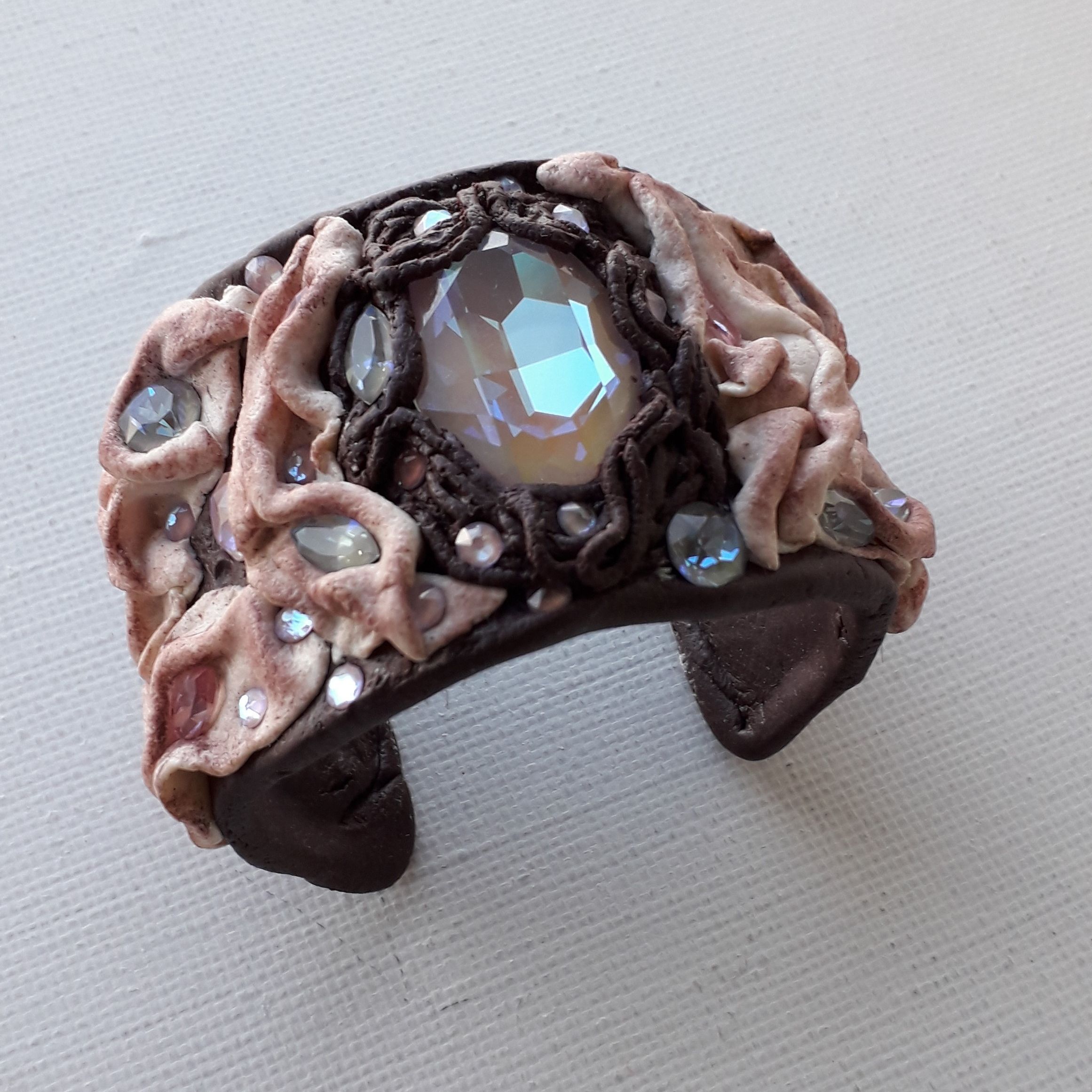 Что для нас означает кристалл? Идеал, совершенство, абсолют... Мы говорим: "Кристально чистый", "кристально ясный" и даже" кристально честный". А любовь! Определений много, но интересно представить, что любовь, как и диалектику, можно рассматривать как единство и борьбу противоположностей (например, люблю мороженое и ненавижу целлюлит). А в моем браслете объединились теплая цветовая гамма с холодными искрами, идеальная четкость граней кристаллов с мягкими складками, непревзойденный блеск и прозрачность с эффектом пудры...Вот такая диалектика получилась...