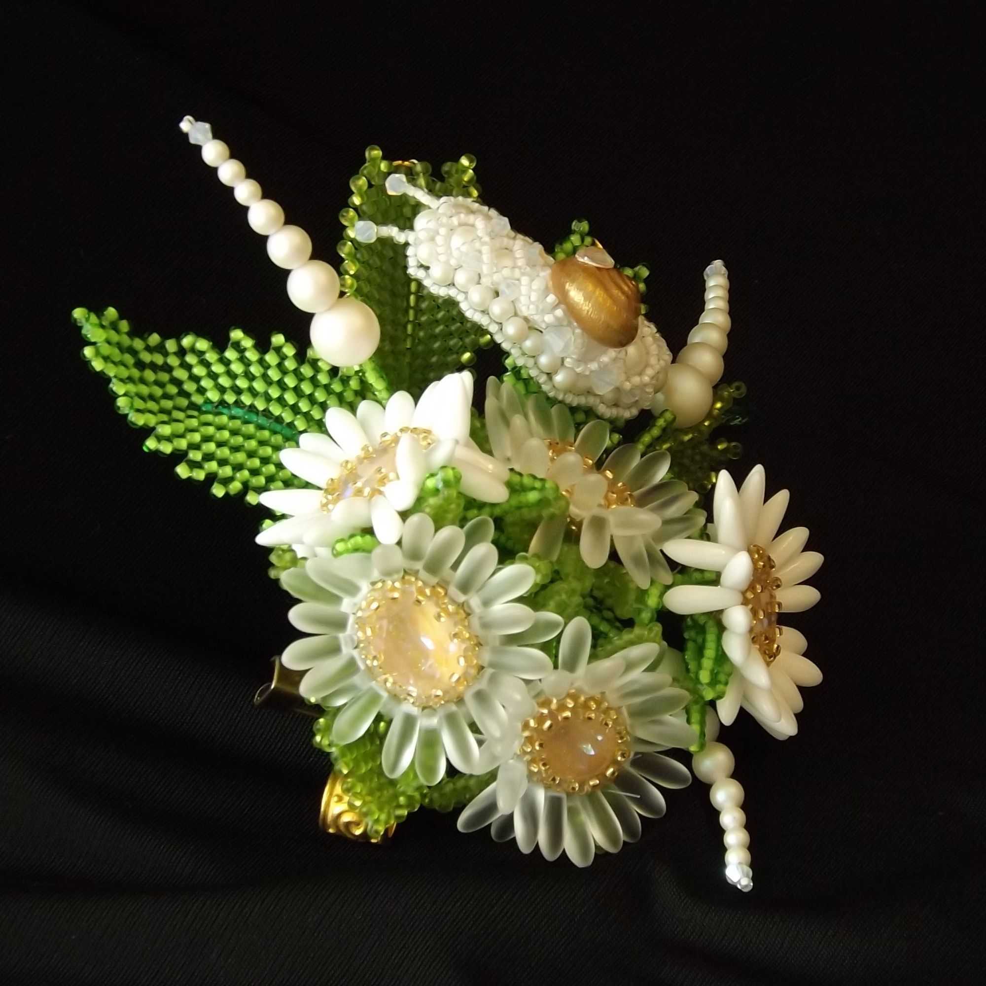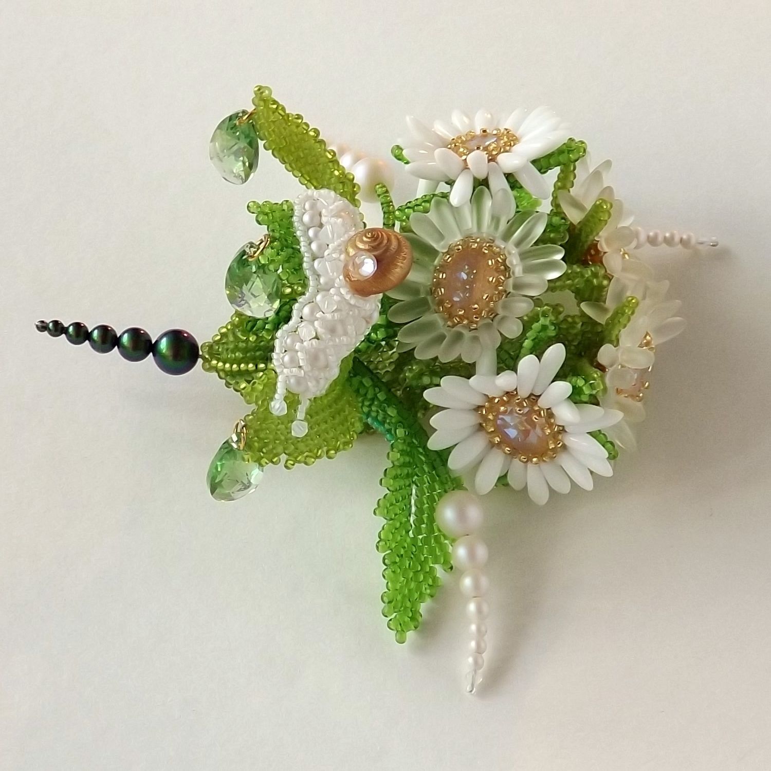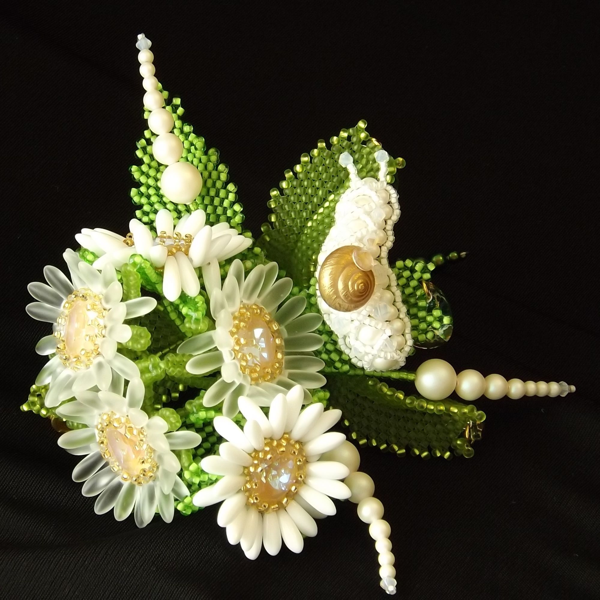 А если серьезно, всегда интересно, что получится, если из горстки бисера, бусин, фурнитуры, камней и черт его знает чего еще, пытаешься воплотить нечто, чтобы оно было похоже на живое: цветы, листья, животных. Кристаллы помогают в воплощении идеи, дают возможность оттенить или усилить сходство украшения с оригиналом; в зависимости от фактуры – передать настроение: сияюще-радостное или матово-грустное, приглушенно-задумчивое или ярко-дерзкое. Позволяют задержать образ во времени, преодолеть сиюмгновенность существования и снова и снова вызывать впечатление. В конце концов, они просто радуют глаз. И пусть с кем-то надолго останется букетик ромашек с любопытной улиткой.
