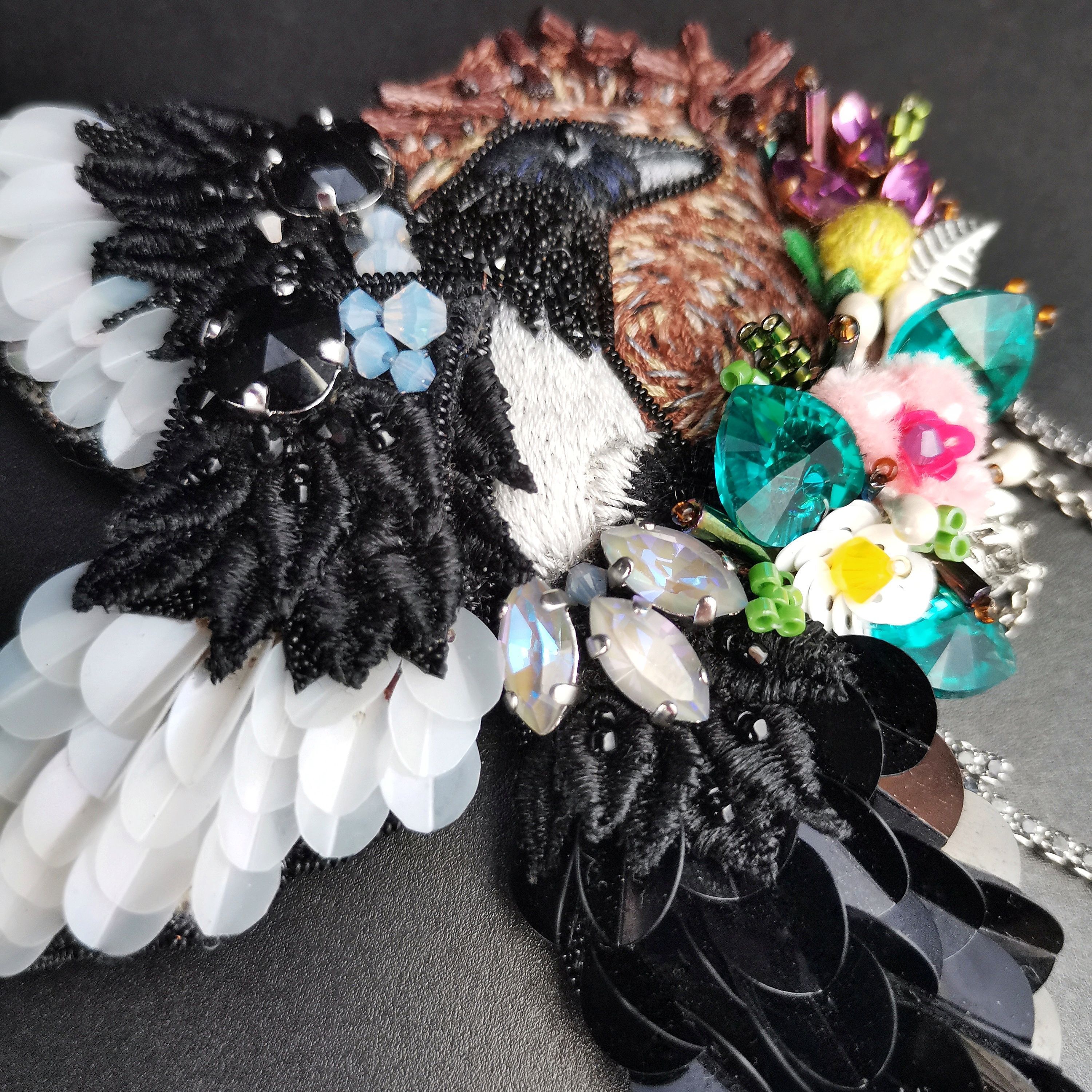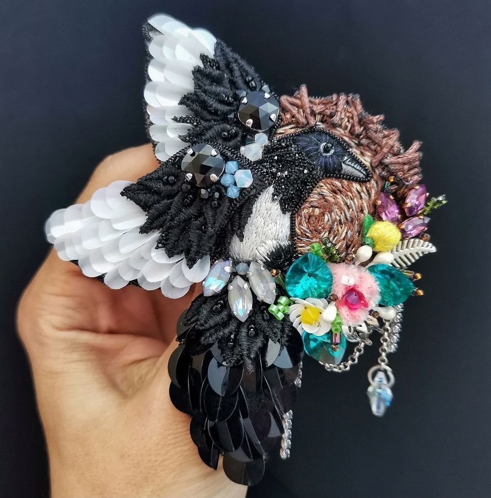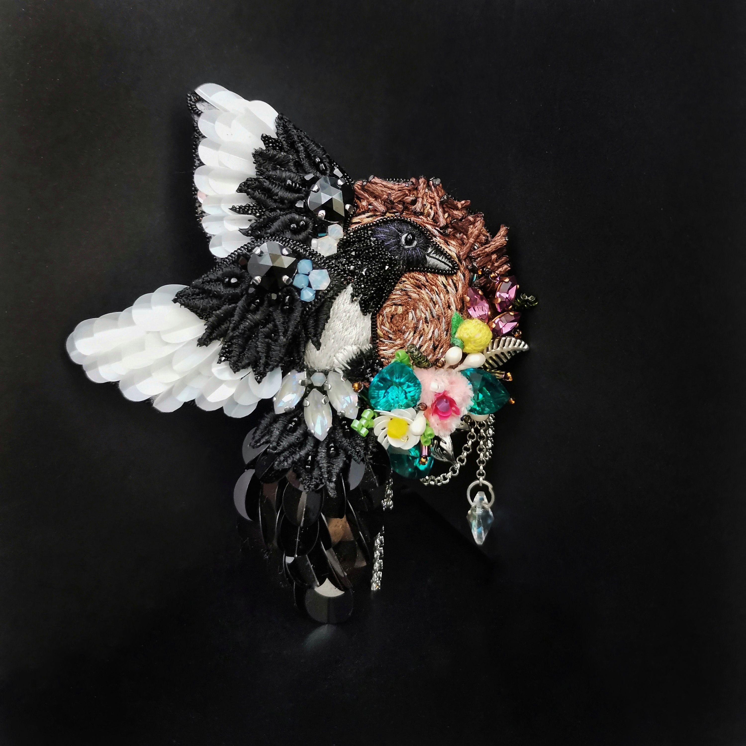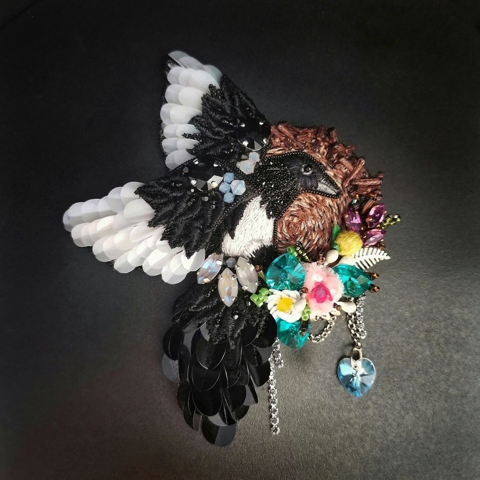 Для меня тема "Crystal love" это про любовь к своему творчеству, к кристаллам Сваровски, которые покорили меня когда-то и с которых и начался мой творческий путь. Образ сороки возник сразу - это очень символично, ведь подобно этой птице, которая не может устоять перед любой блестящей вещью, и мы, рукодельницы, не можем устоять перед блеском кристаллов. В своей работе я изобразила птицу, которая украшает блестящими кристаллами свое гнездо, ей все мало блеска, и она будет приносить в свое жилище ещё и ещё украшений, ведь кристаллов Сваровски много не бывает!