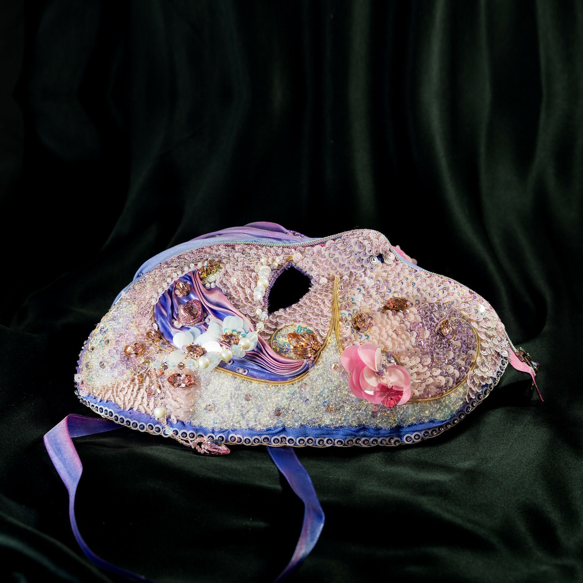 Двуликая маска "Пробуждение" - это метафора ухода эпохи. Цветущая, нежная сторона сна с кристаллами основного цвета Light Rose Shimmer и Light Rose Ignite соответствует времени, когда мастера с нежной любовью создавали бесконечное множество творений из кристаллов Сваровски: здесь буйство граней, подчеркнутое пайетками и биконусами, распускающийся бутон с кристальным сердечком, ресничка из жемчуга и биконусов, скопления кристаллов и сплошное сияние.