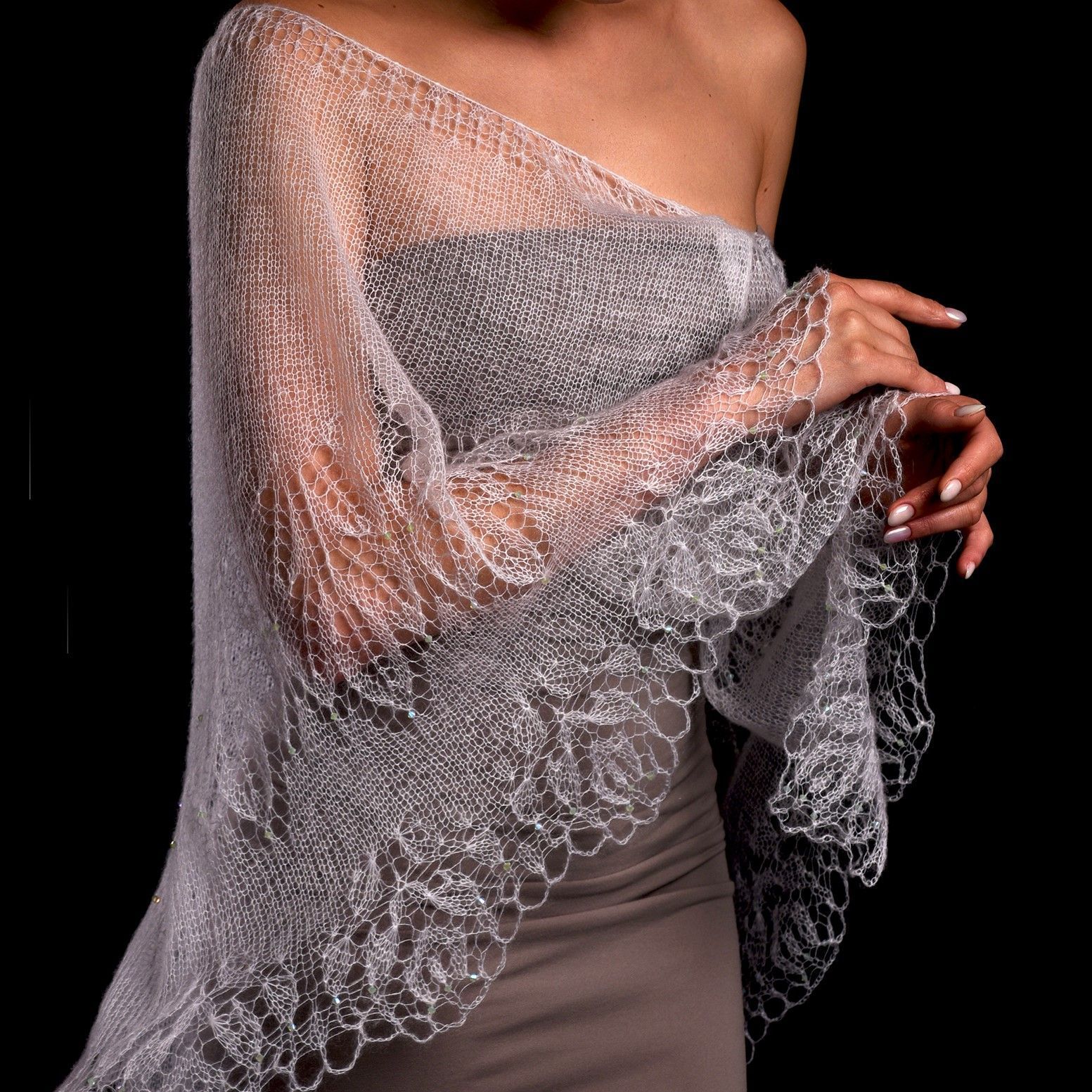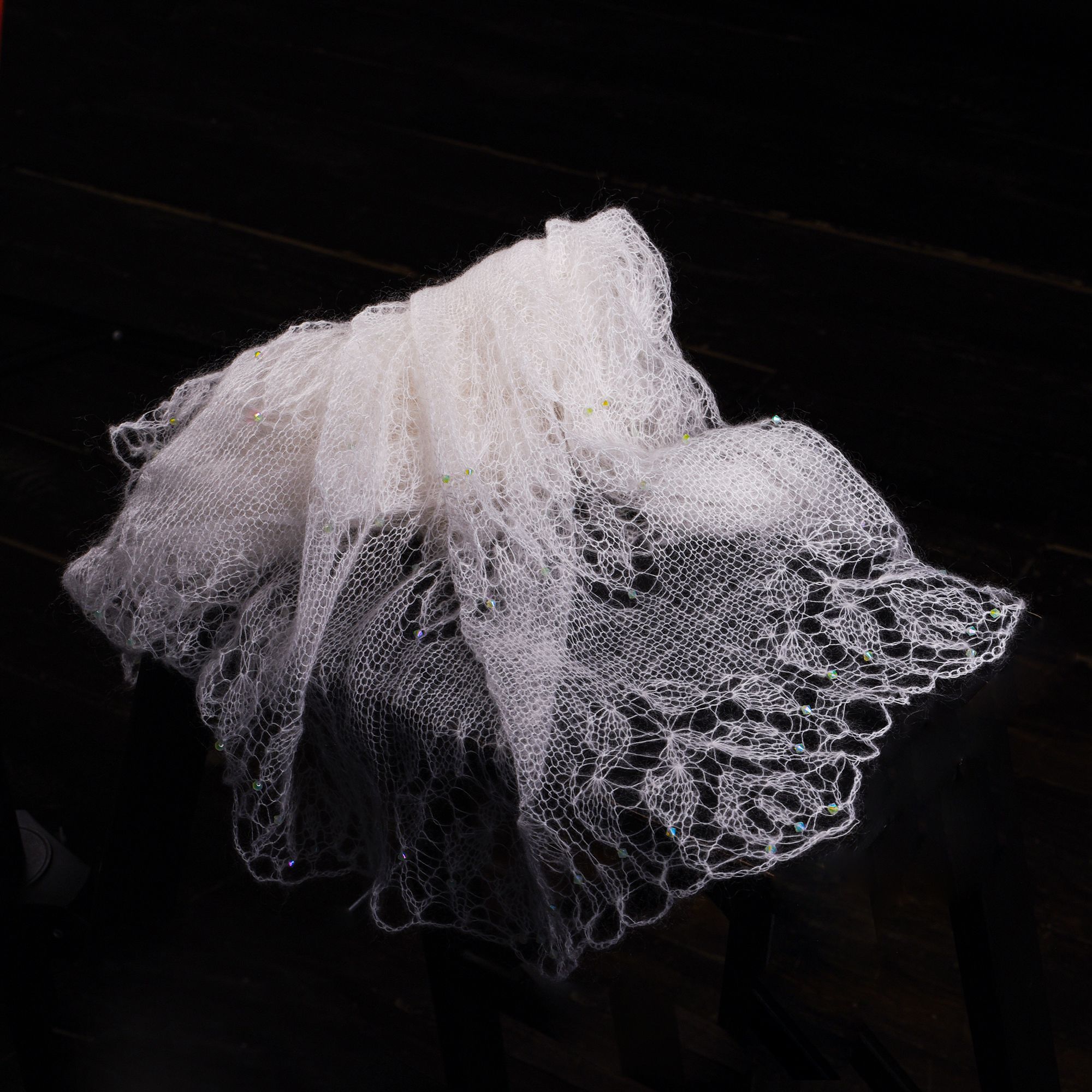 В своей работе я соединила эти символы — связала спицами из нежного мохера белого цвета шаль фишю, в тонком полотне создала букет роз, в ажурный узор цветов добавила кристаллы Сваровски. Преломление лучей света при попадании на грани создают невероятный эффект всего изделия. Мохеровая шаль поражает красотой и изяществом, придает облику аристократизм, очарование и утонченность.