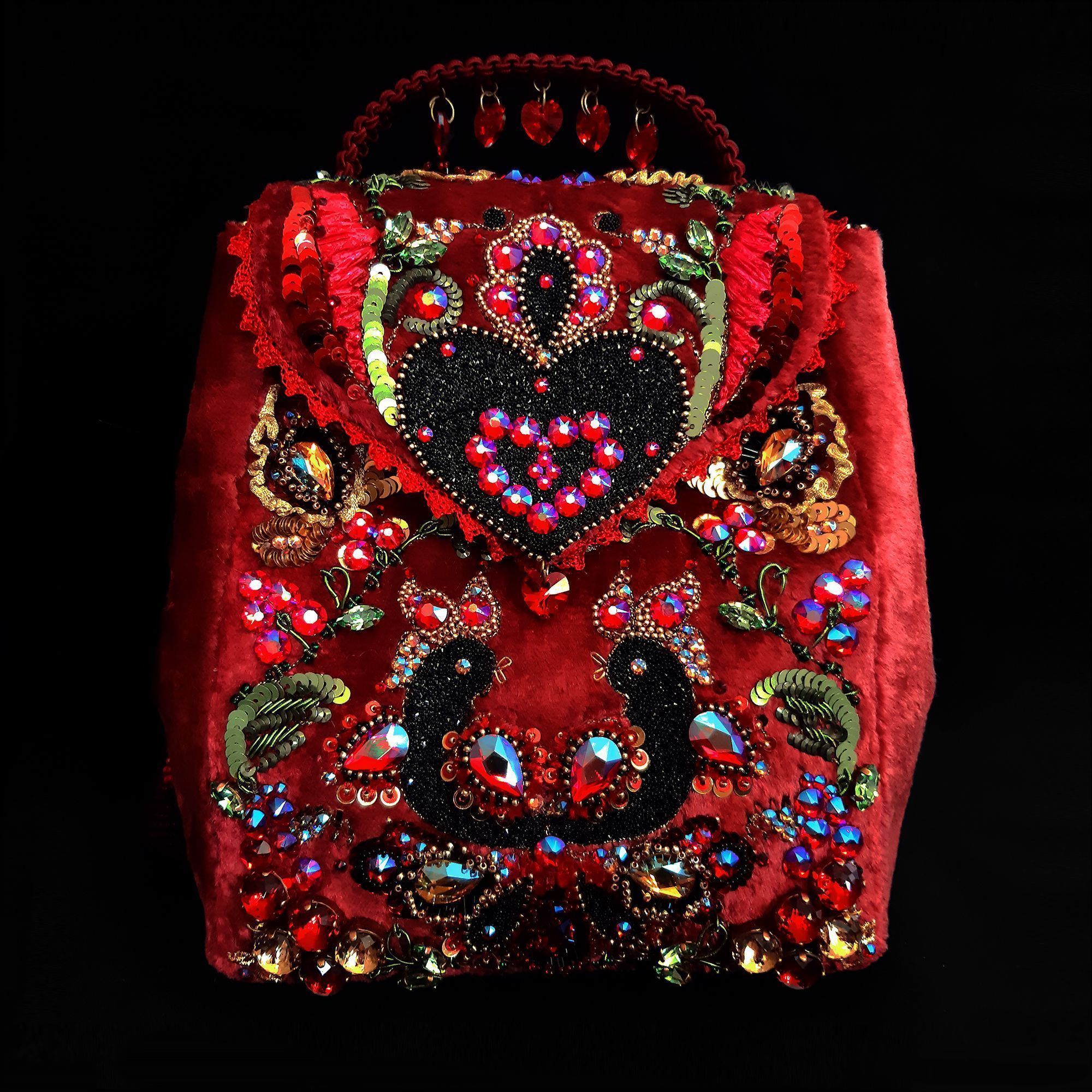 Орнамент на лямках рюкзака так же подчиняется основной идее и содержит как растительные узоры так и небольшие сердечки.