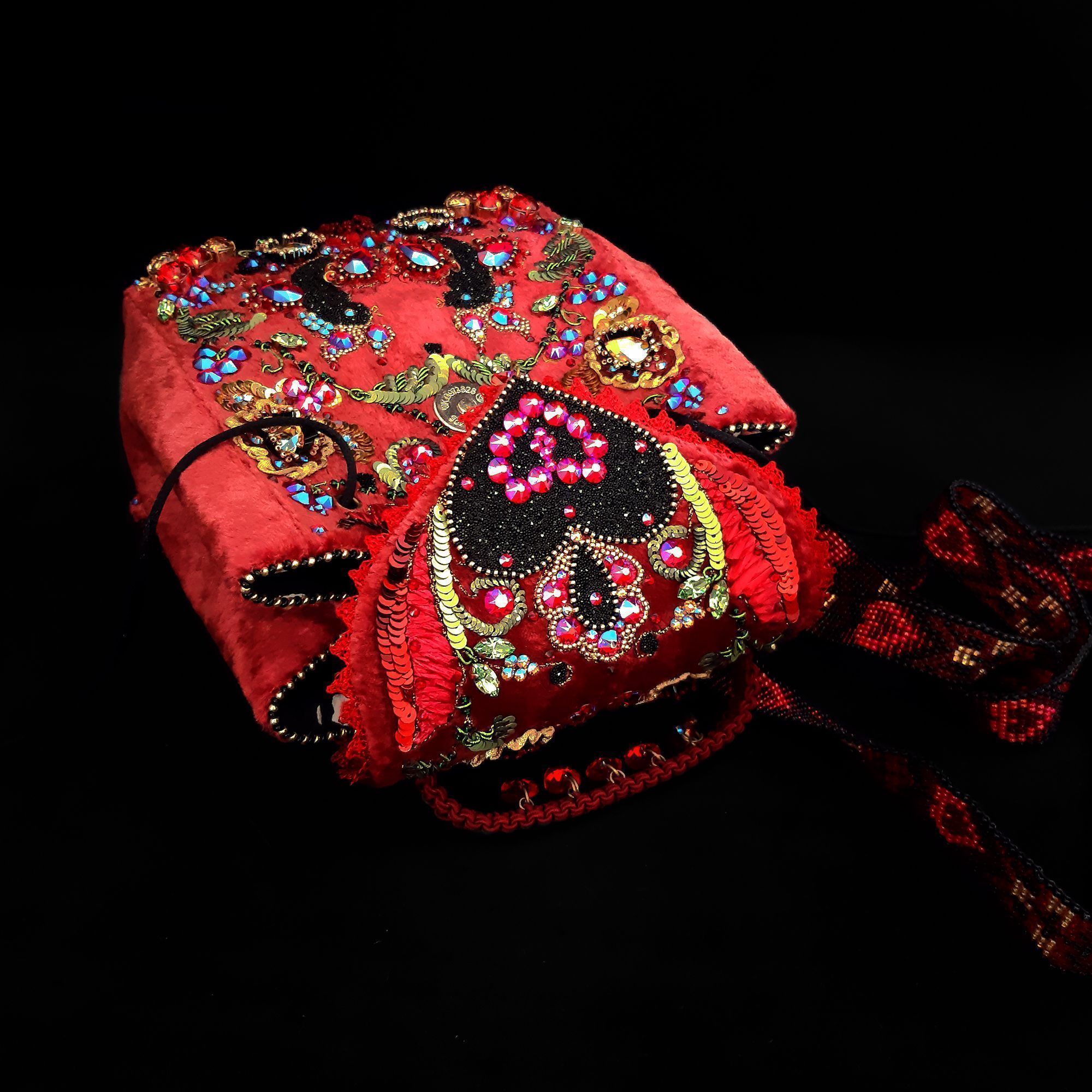 Материалом основы послужил советский плюш (нестандартный материал для изготовления сумок). Я решила его использовать, чтобы показать уют и мягкость рюкзака, как плюшевая игрушка. А в сочетании с четкими гранями кристаллов он приобрел изысканный вид.