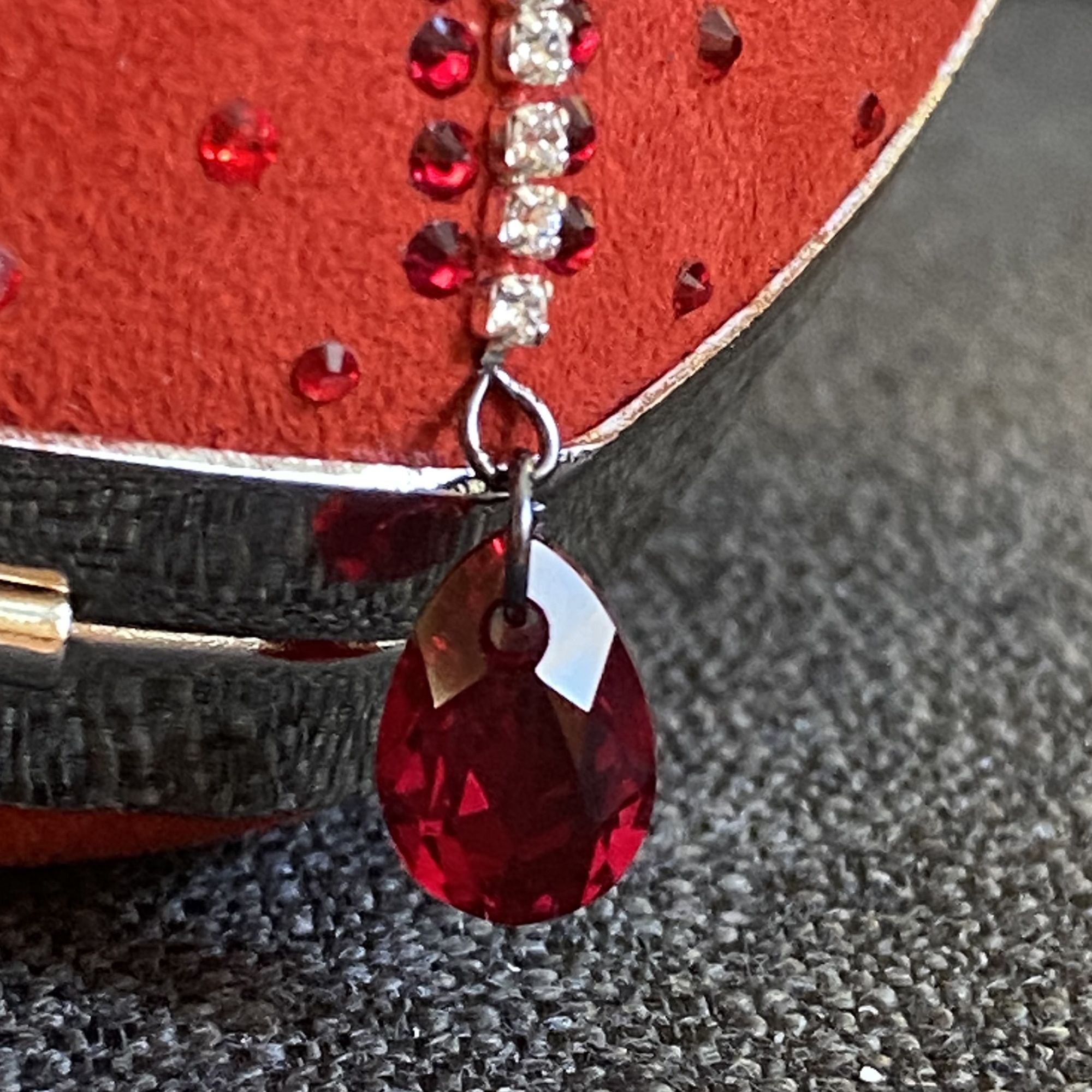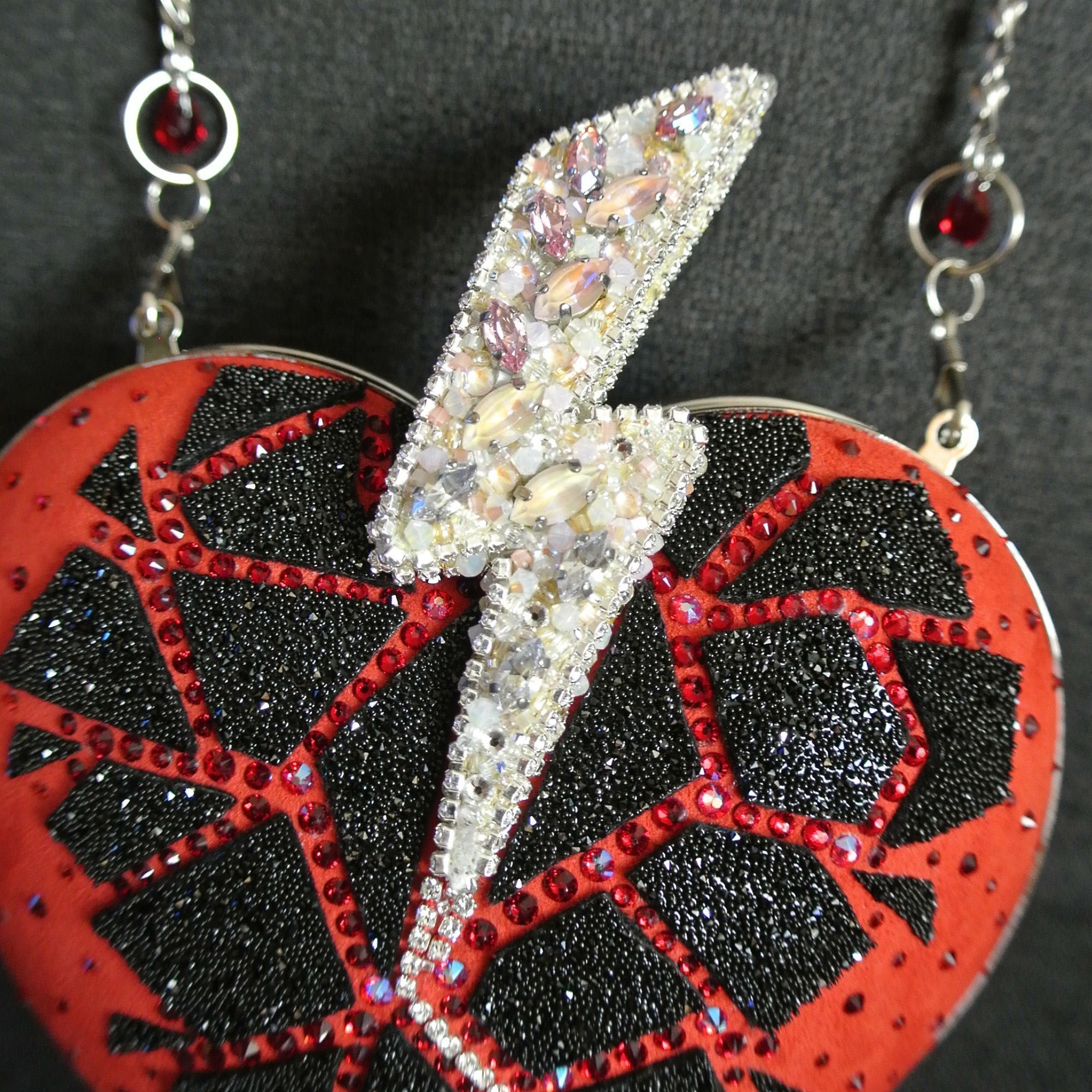 В наши сердца как будто ударила молния, и они почернели от горя. Моя сумочка символизирует такое сердце рукодельницы. Молния вся сияет кристаллами Swarovski. В месте удара сердце покрылось обугленной коркой, которая потрескалась, и в трещинах сверкают капли крови. Сердце плачет…