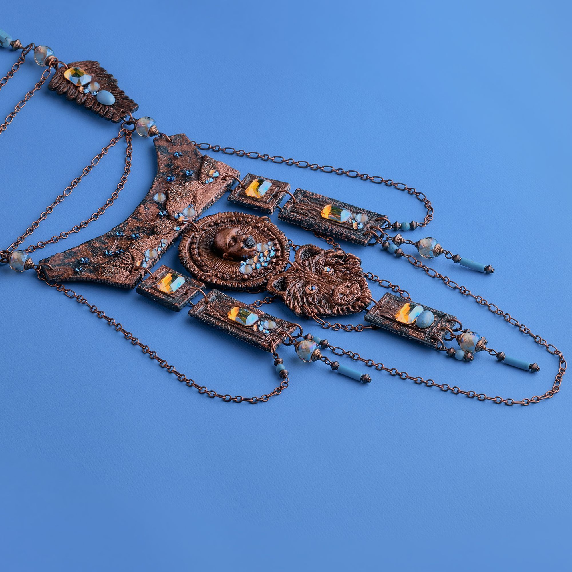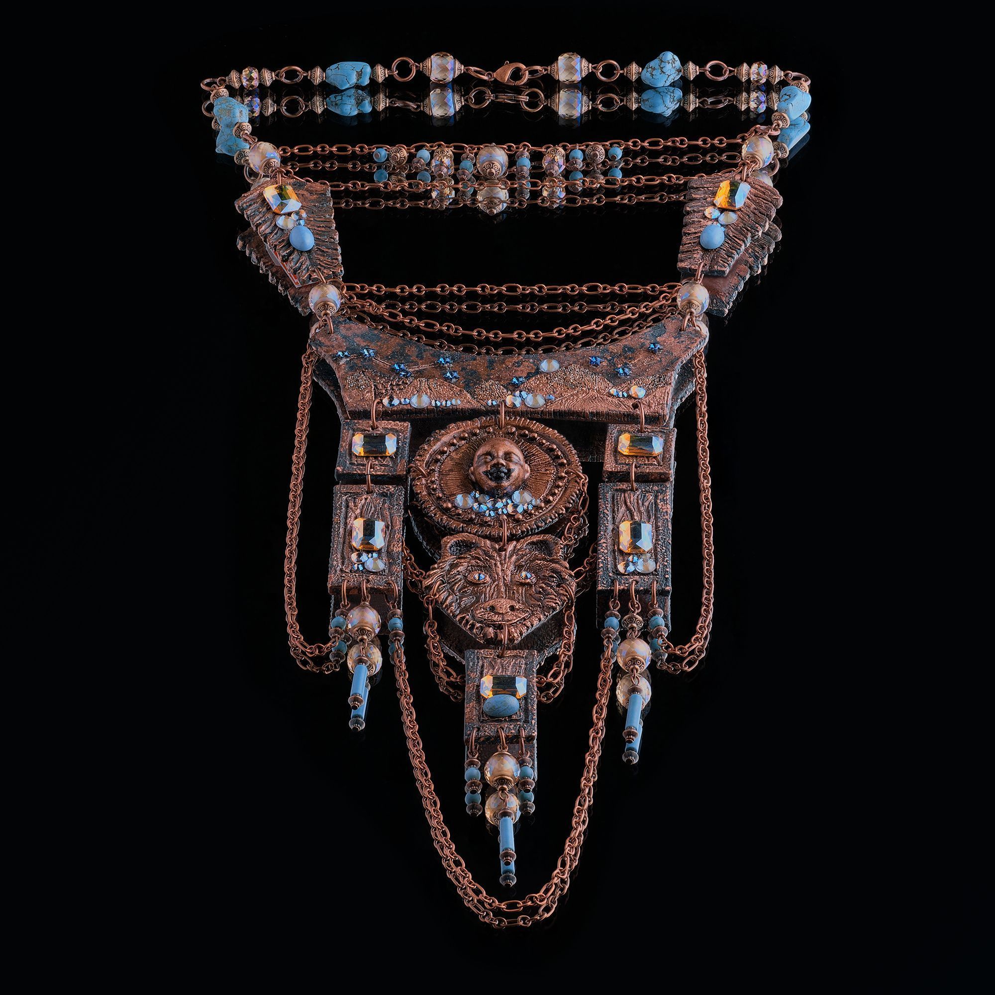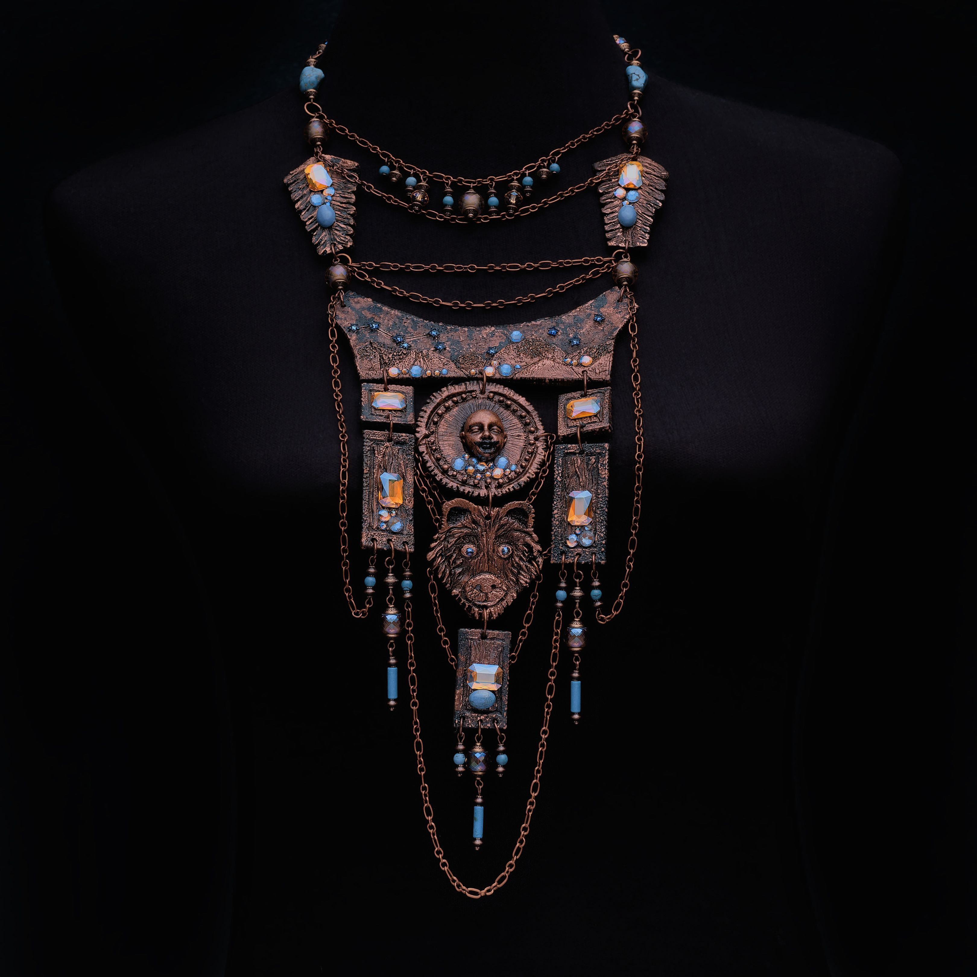 В колье использовано много голубого цвета (как в камнях, так и в оттенках кристаллов Сваровски) - традиционного для айнских украшений. Поздние исторические украшения создавались Айну по принципу центральной симметрии, из подручных материалов, бросовых китайских бусин и безделушек, которые им часто завозили, как туземцам. В украшениях часто присутствовал металл, отличительные геометрические формы - большие металлические круги в центре, многослойность, нагромождение, круглые бусины. Все эти принципы построения я постаралась отразить в своём украшении.
