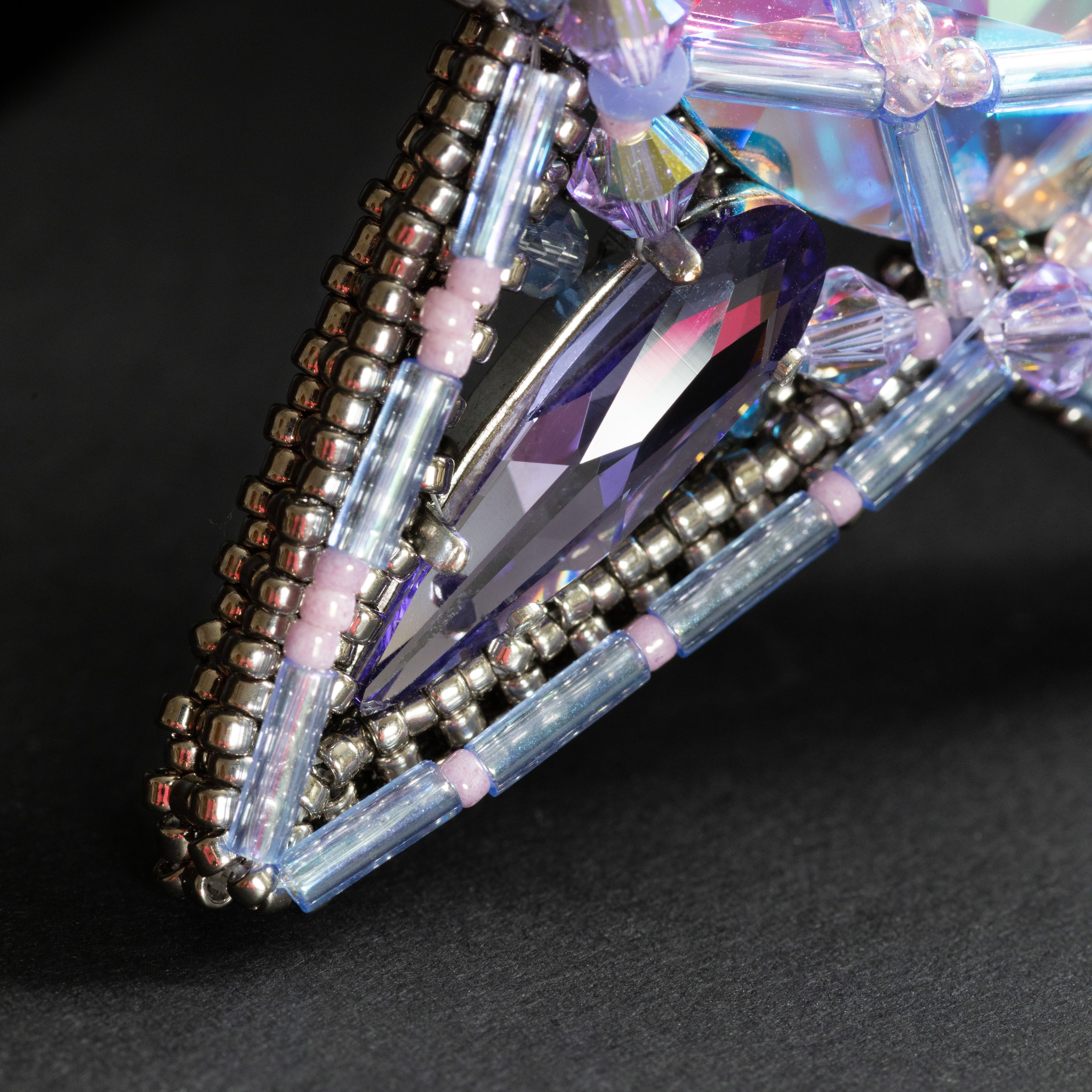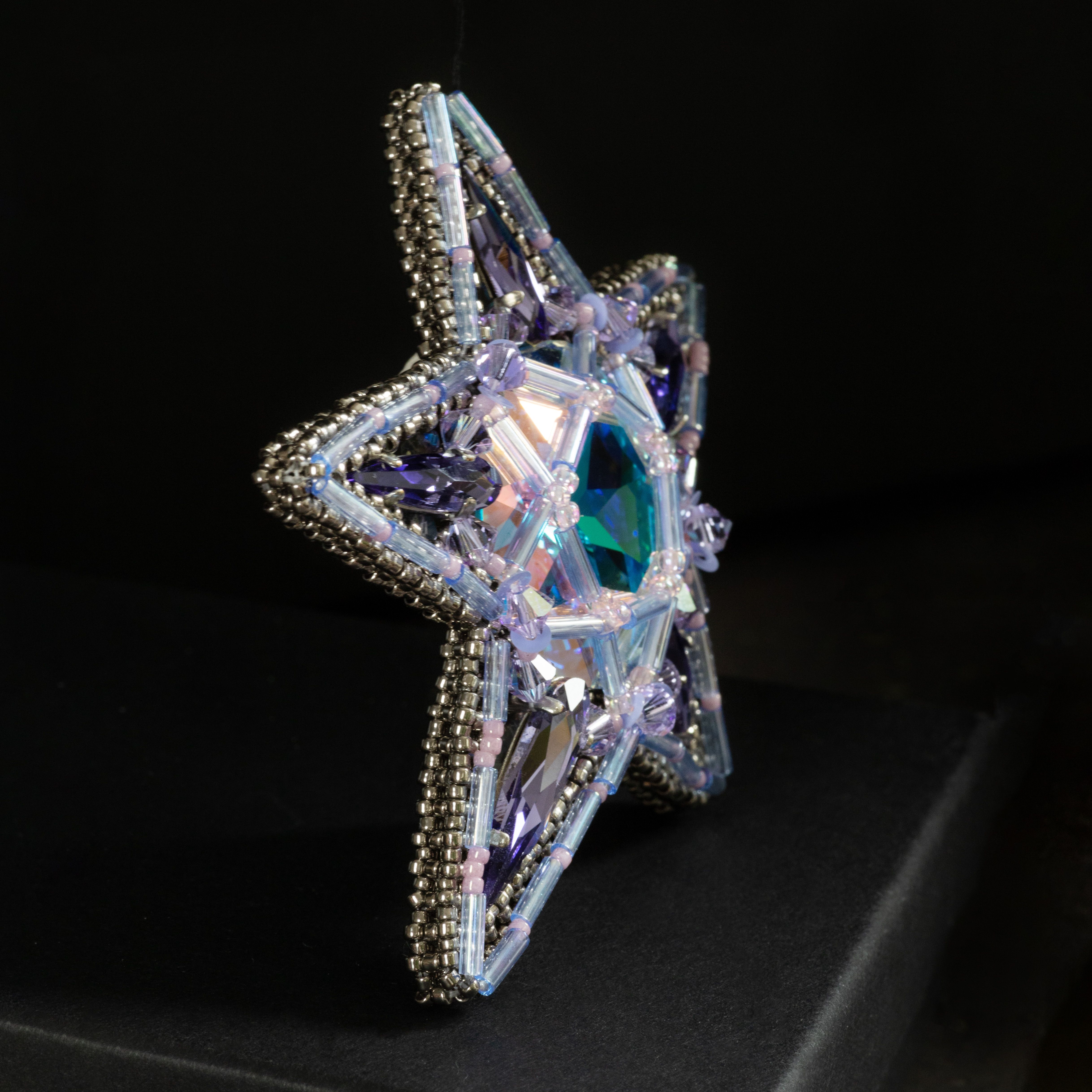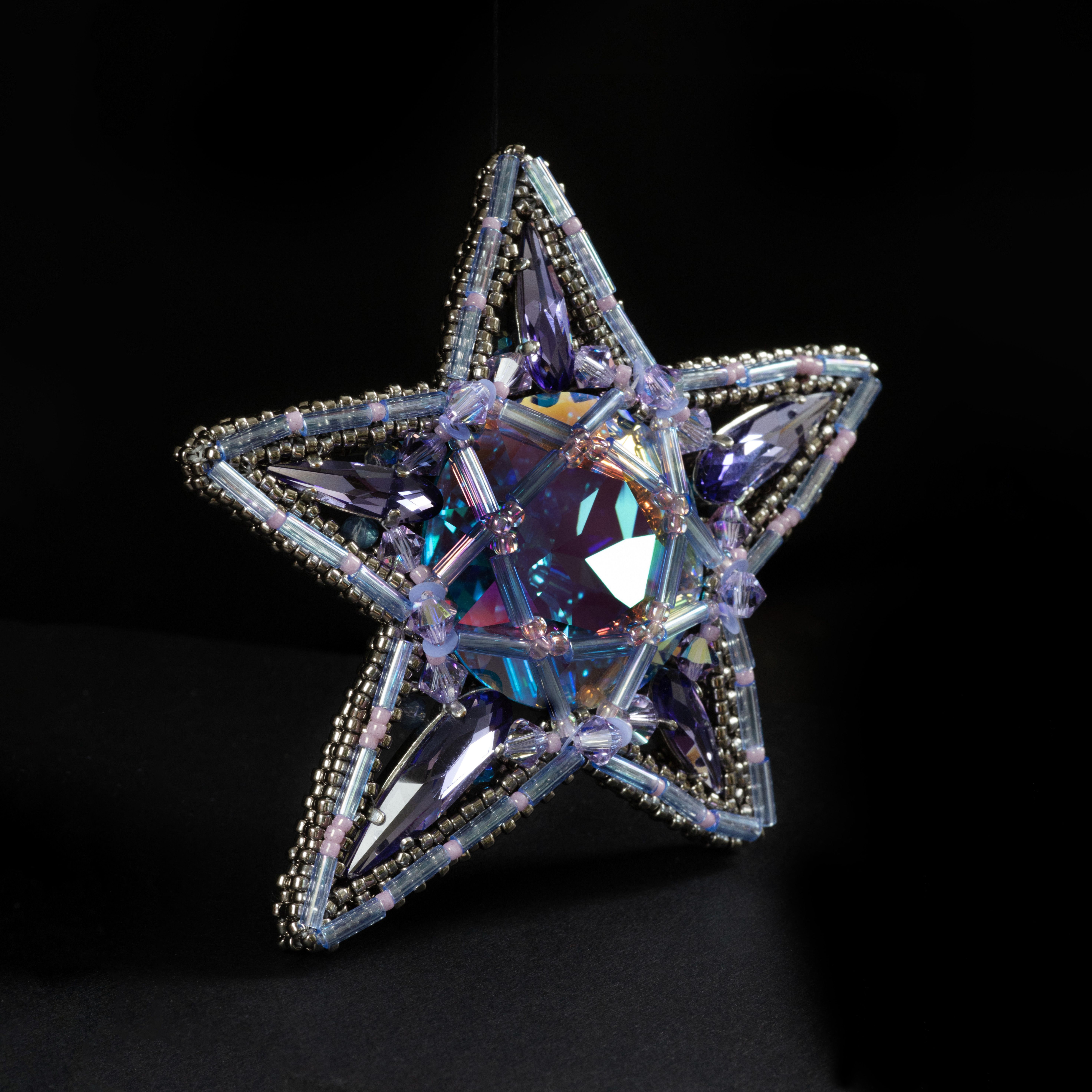 И вот из этих кристальных частиц появилась моя брошь - с обычным названием «Звезда», грани которой сверкают и восхищают!!! Разноразмерные лучи обрамляют сердце работы - восхитительный кристалл, окутанный стеклярусной паутиной с вкраплениями бусин и пайеток. Каждый элемент дополняет друг друга, переливаясь на свету.
