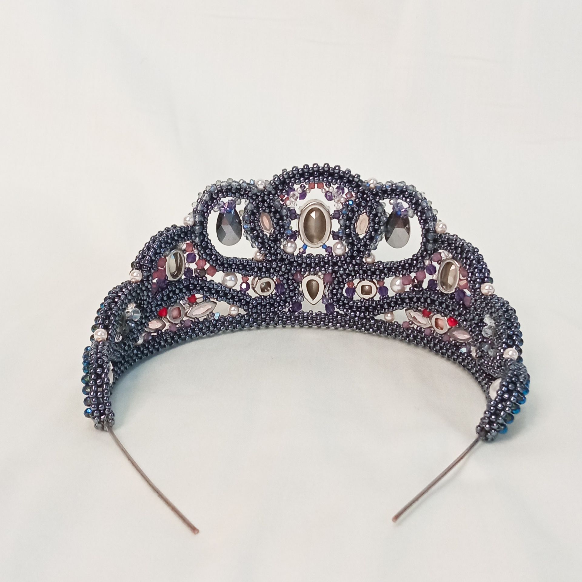Данная работа выполнена в технике бисероплетения без использования металлического каркаса. Для фиксации на голове, в нижней части диадемы использована основа для ободка. Вес диадемы менее 100 грамм.