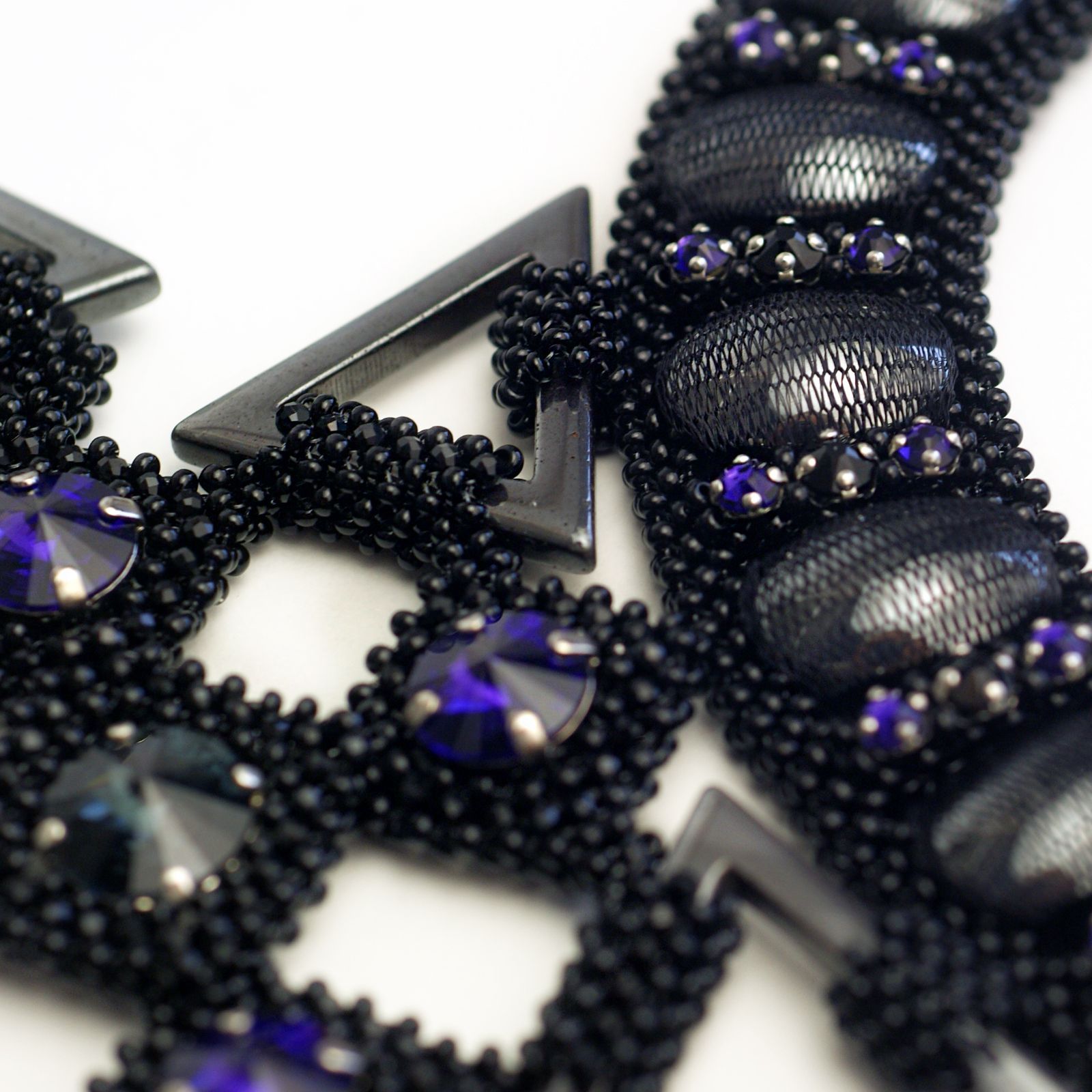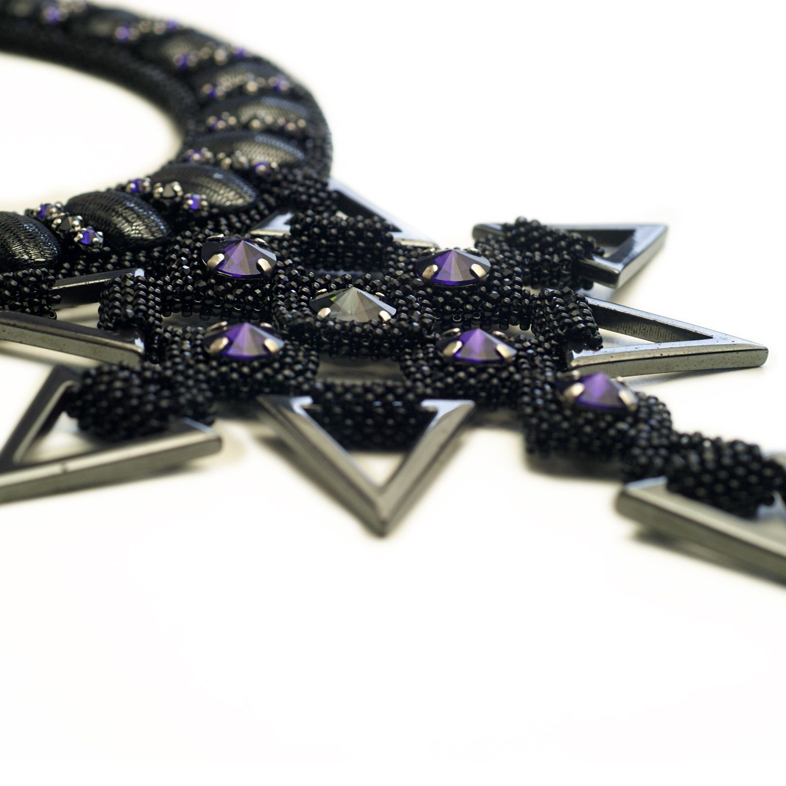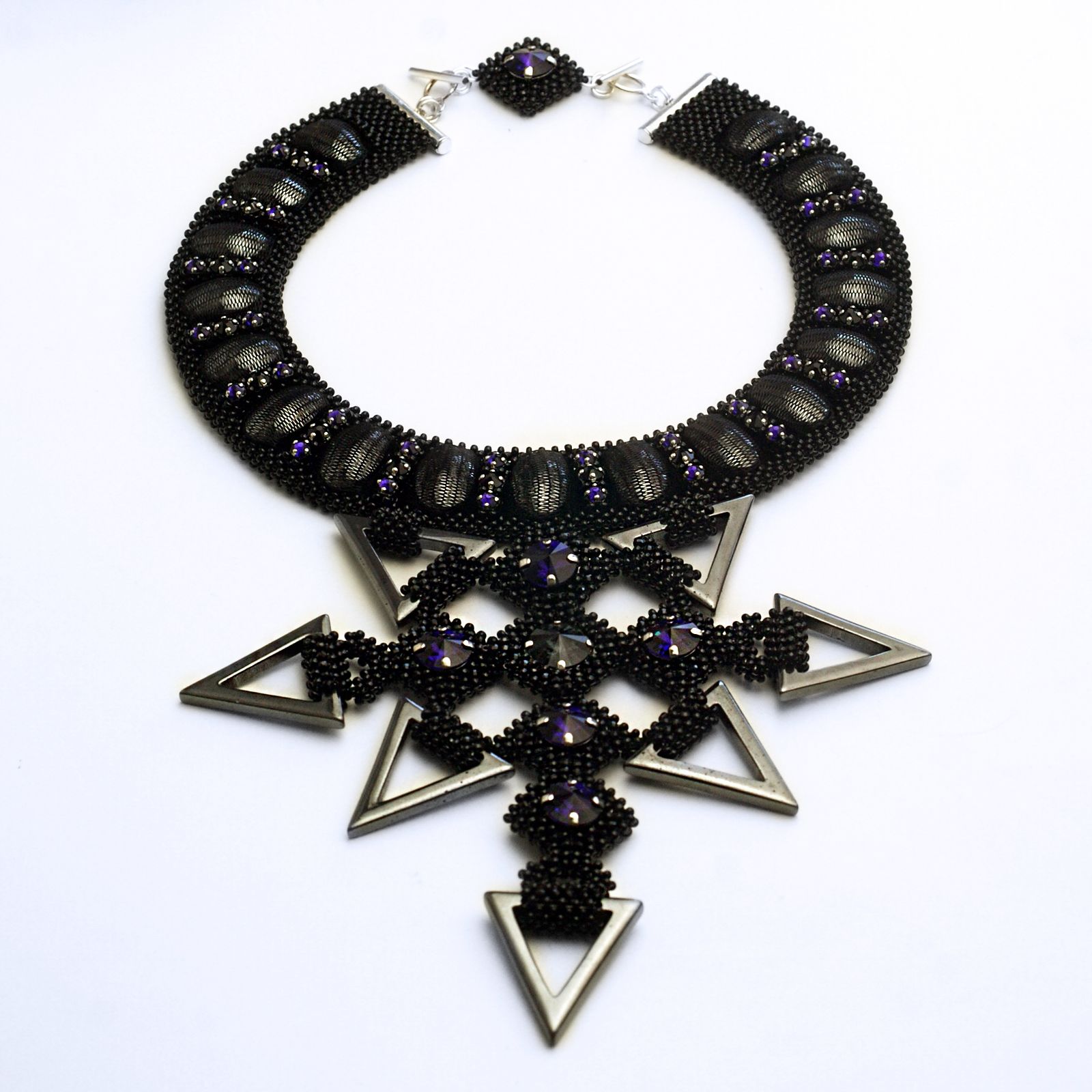 Колье выполнено из бисера с добавлением натуральных камней – подвесок и кабошонов из гематита, бусин шпинели. Колье выполнено в классической черной гамме с добавлением акцентов из кристаллов редкого цвета Purple Velvet.