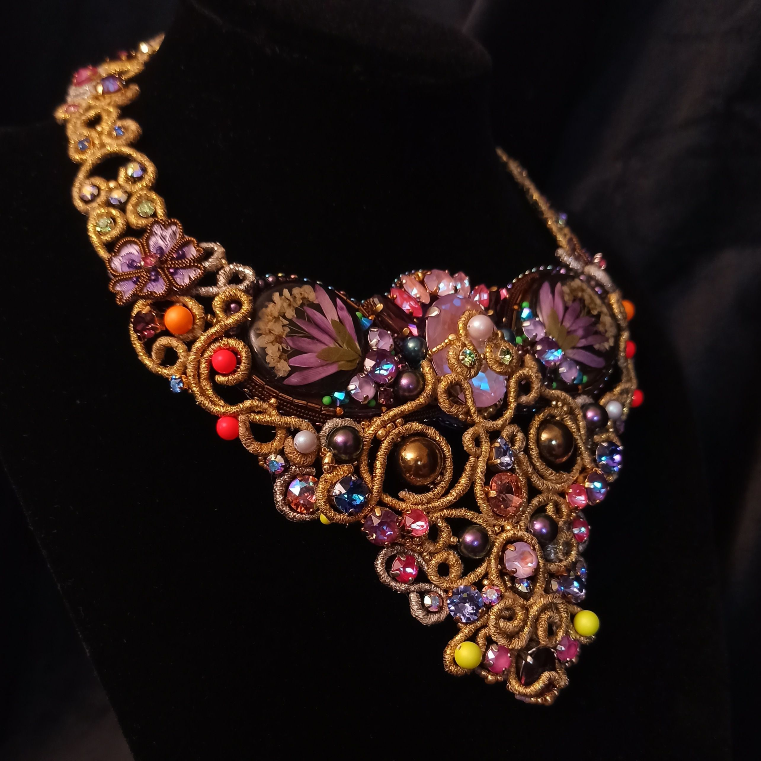 Когда была начата работа над этим колье, я не знала что получу в итоге. Конечно была задумка, эскизы, подбор кристаллов и жемчуга, но перечитывая название темы "Грани Вселенной .evoli" Раз за разом, я всё больше понимала, что хочу чтобы материалы мной "управляли". Глядя на основные цвета я задумалась, что же они означают. Сиреневый олицетворяет творчество, воображение, таинственность. Творческие поиски, открытость к переменам и стремление к развитию. Золотой символизирует солнце, несёт в себе решительность к действиям, бесстрашие, желание выделиться. И я поняла что всё сходится! Именно в таком настроении я и пребывала, в поиске новой грани в себе, в решительности создать что-то необычное. Шаг за шагом, завиток за завитком, мысль за мыслью.. Так и появилось колье "Моя Вселенная". Его создание напомнило мне о том что граней великое множество не только в кристаллах, а в нас самих.. Каждый из нас и есть целая многогранная Вселенная. Такая разная, неповторимая, глубокая.. Это колье о том, что внутренний мир огромен и прекрасен, о любви, о вдохновении, о мечтах, о возможностях...