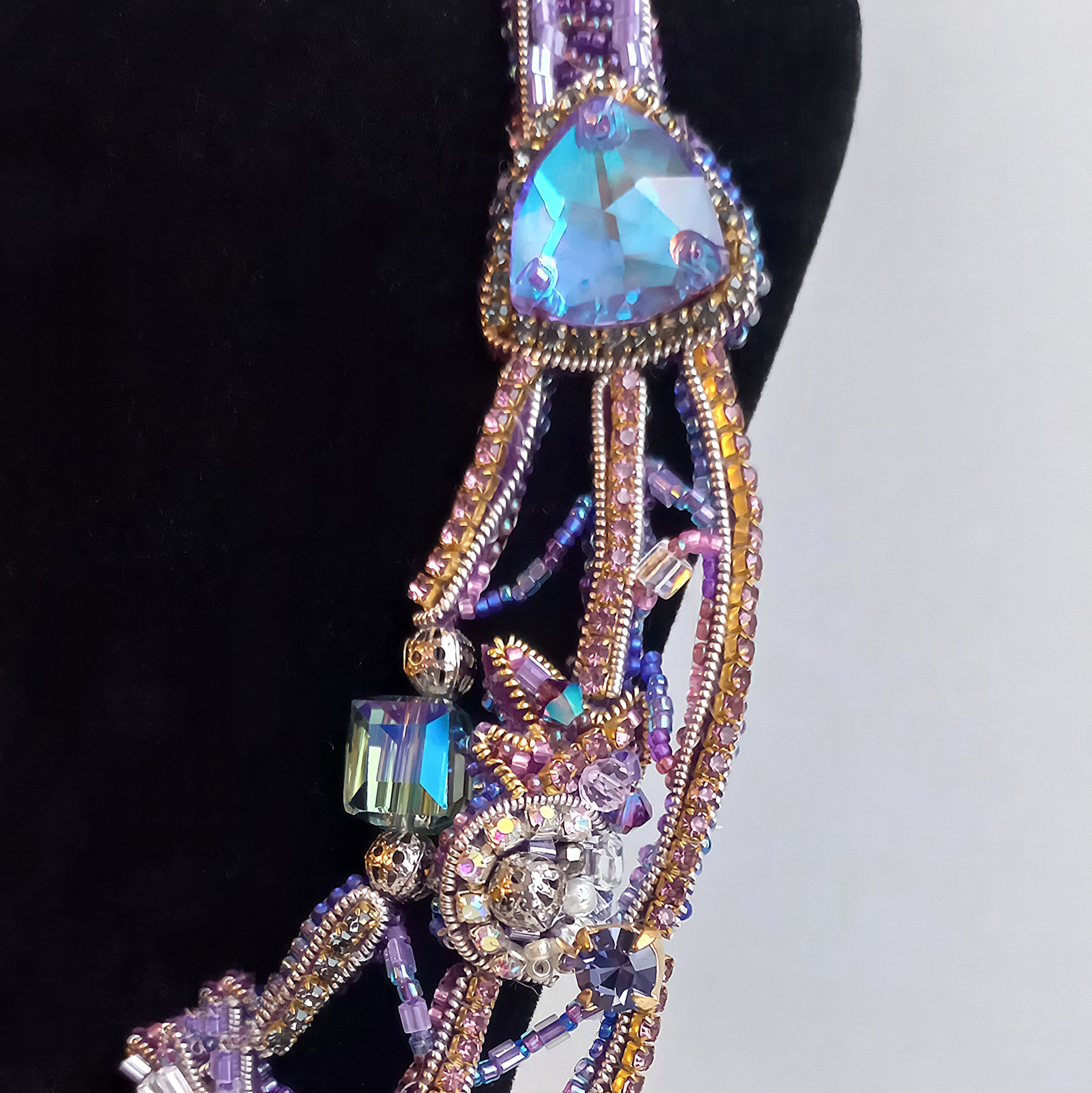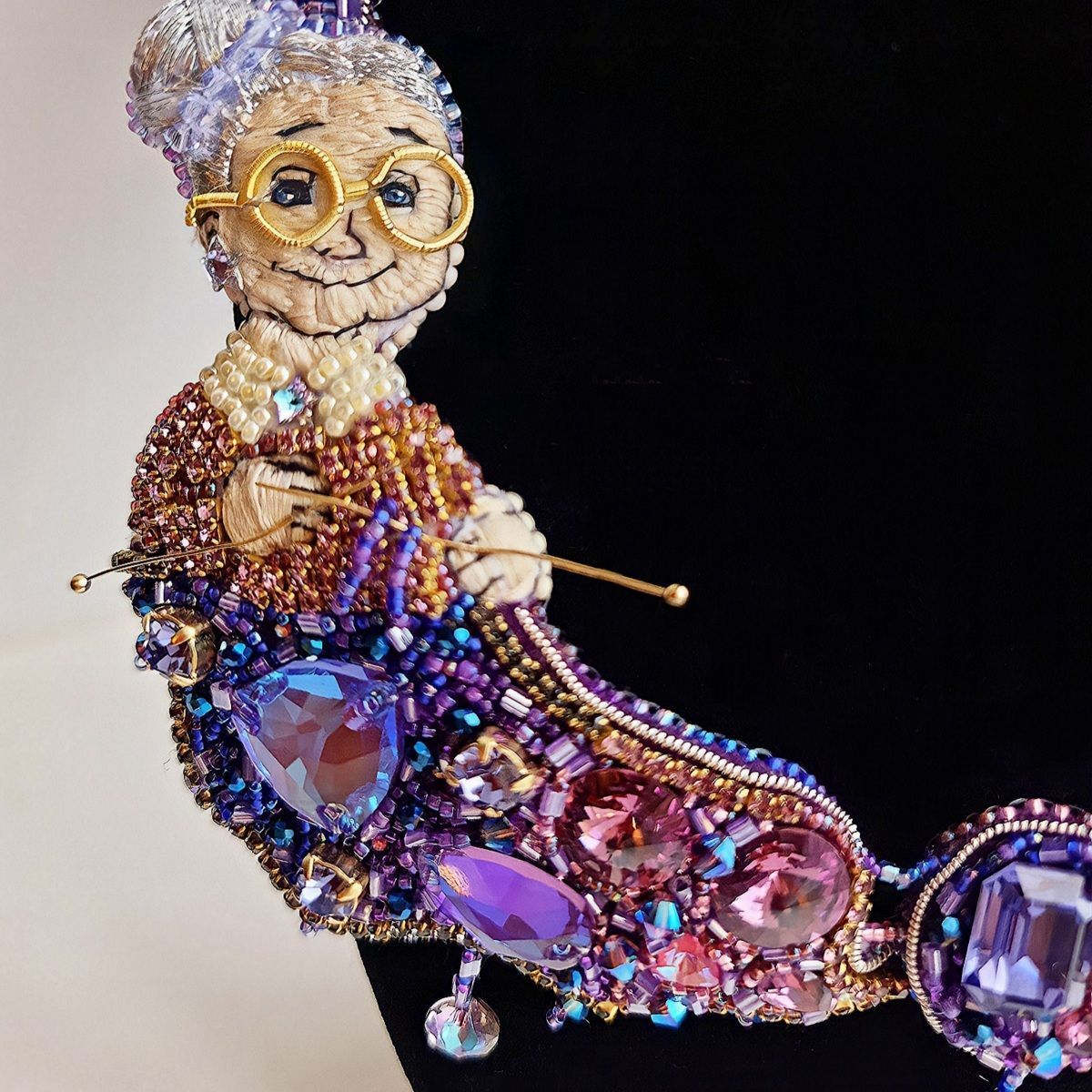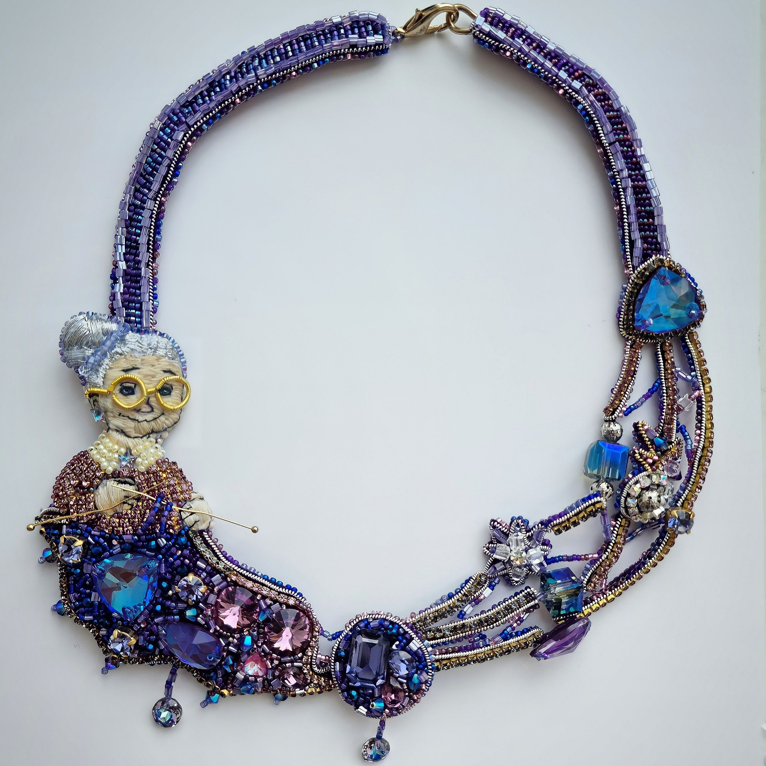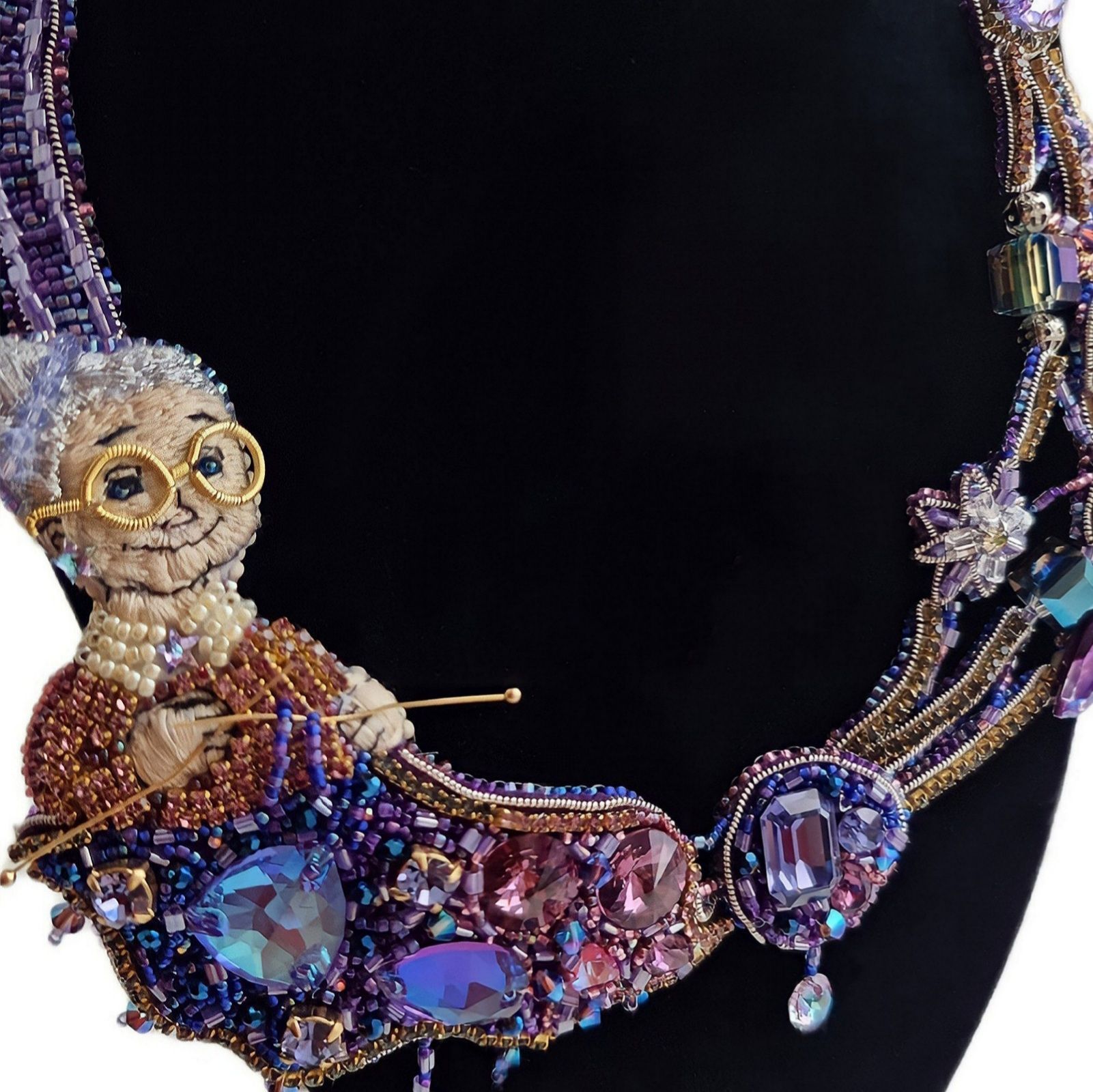 На моём колье изображена милая бабушка, которая вяжет спицами переливающееся всеми гранями кристаллов полотно Вселенной.Из клубка бесконечности выпускаются мерцающие нити, уходящие в глубину миров, переплетая между собой человеческие судьбы, временные эпохи и события. Своими руками бабушка выстраивает по задуманному ей плану планеты, наводит порядок и упорядочивает хаос. На её лице играет милая, непринуждённая улыбка, ведь только ей известны ответы на волнующие тысячелетиями человечество вопросы. Она видела зарождение жизни и именно она связала первую петлю, давшую начало Вселенной.