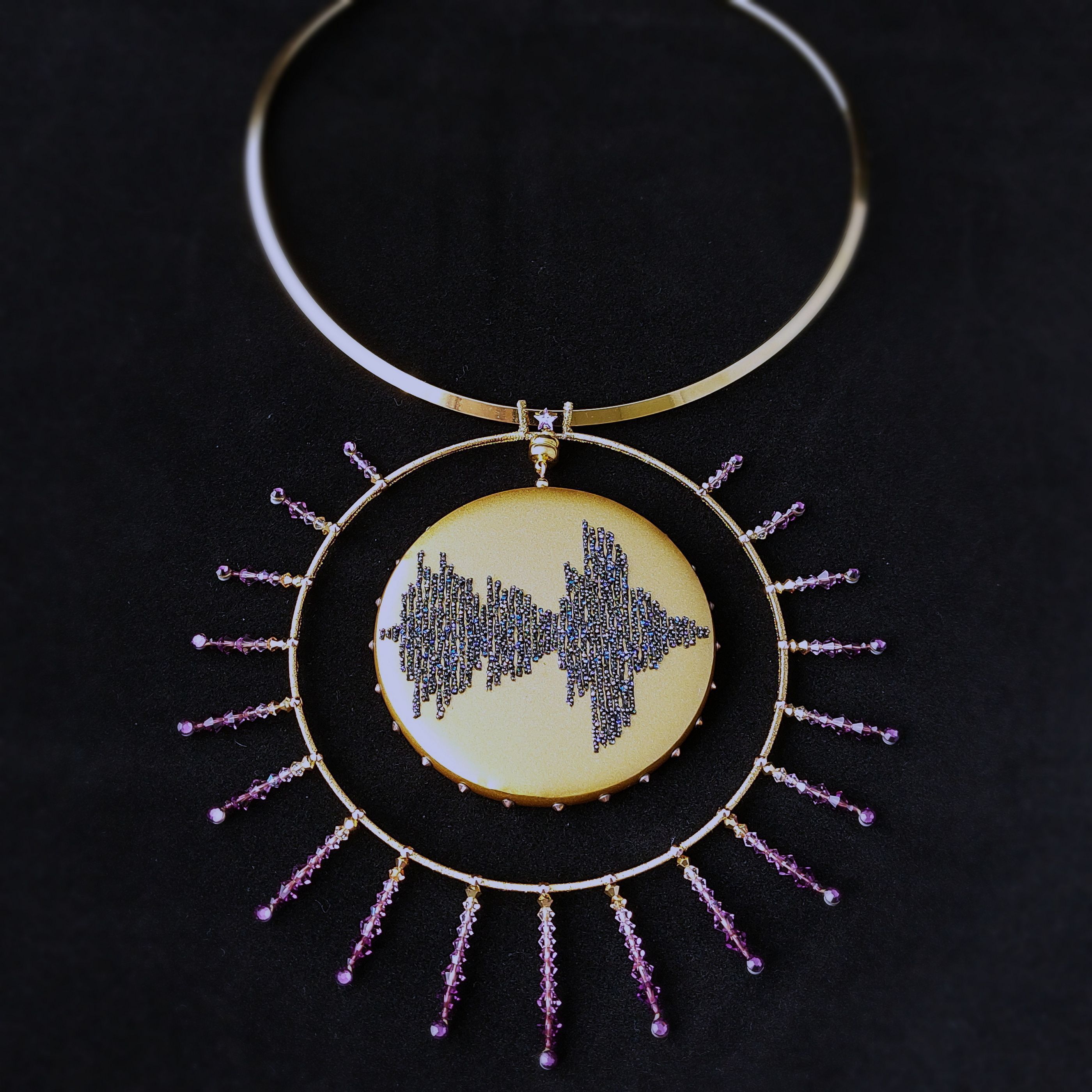 В конкурсном колье главным элементом является своеобразная золотая пластинка с фразой «Я тебя люблю», изображенной в виде графической звуковой дорожки. Мое «Письмо во Вселенную» не улетит к внеземным цивилизациям. Оно адресовано другой Вселенной – Вселенной мастеров Evoli, где каждый Мастер является яркой звездой, способной своим творчеством сказать «Я тебя люблю!» всему миру. Изображение этой Вселенной можно увидеть, перевернув центральный элемент колье.