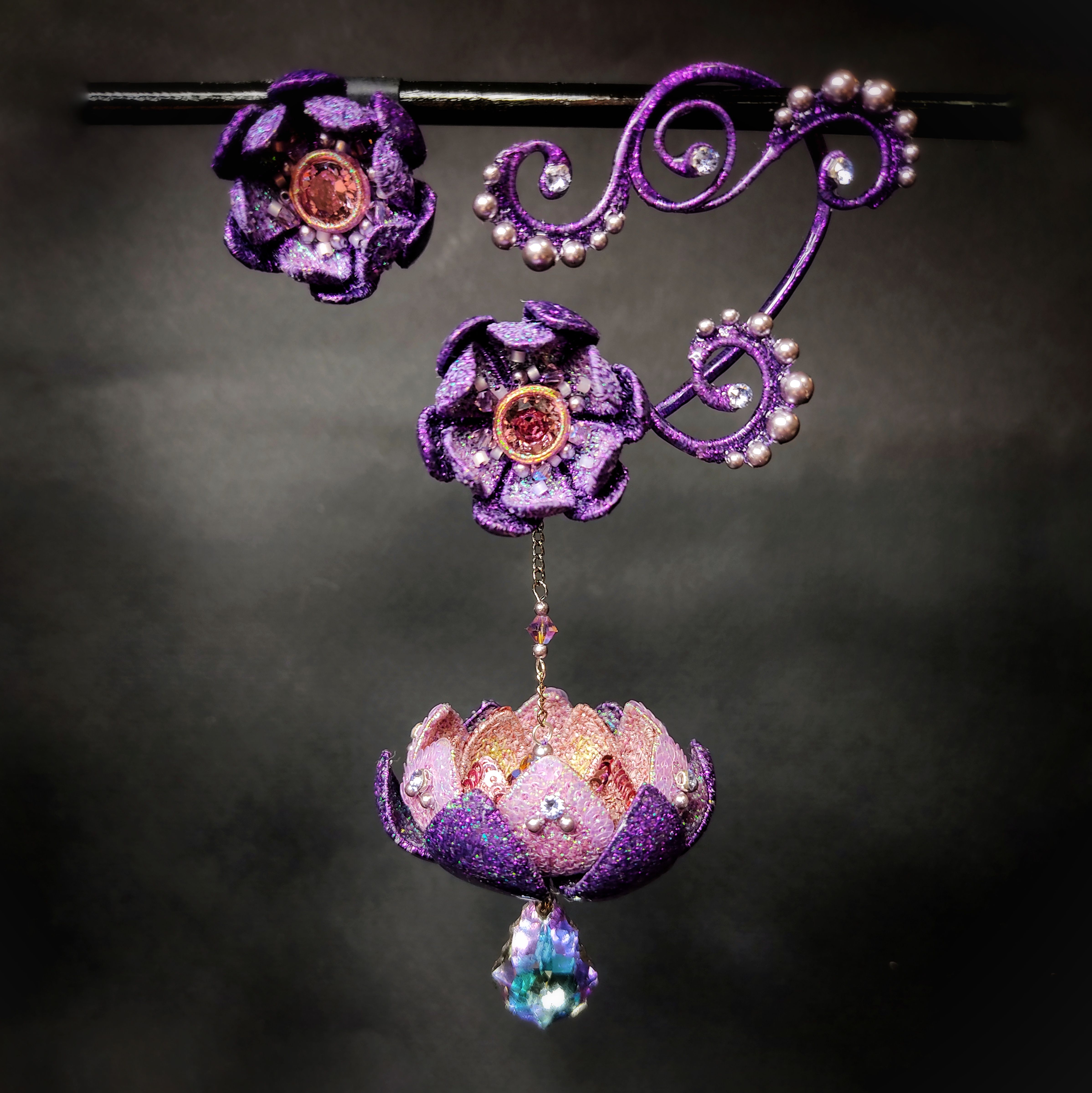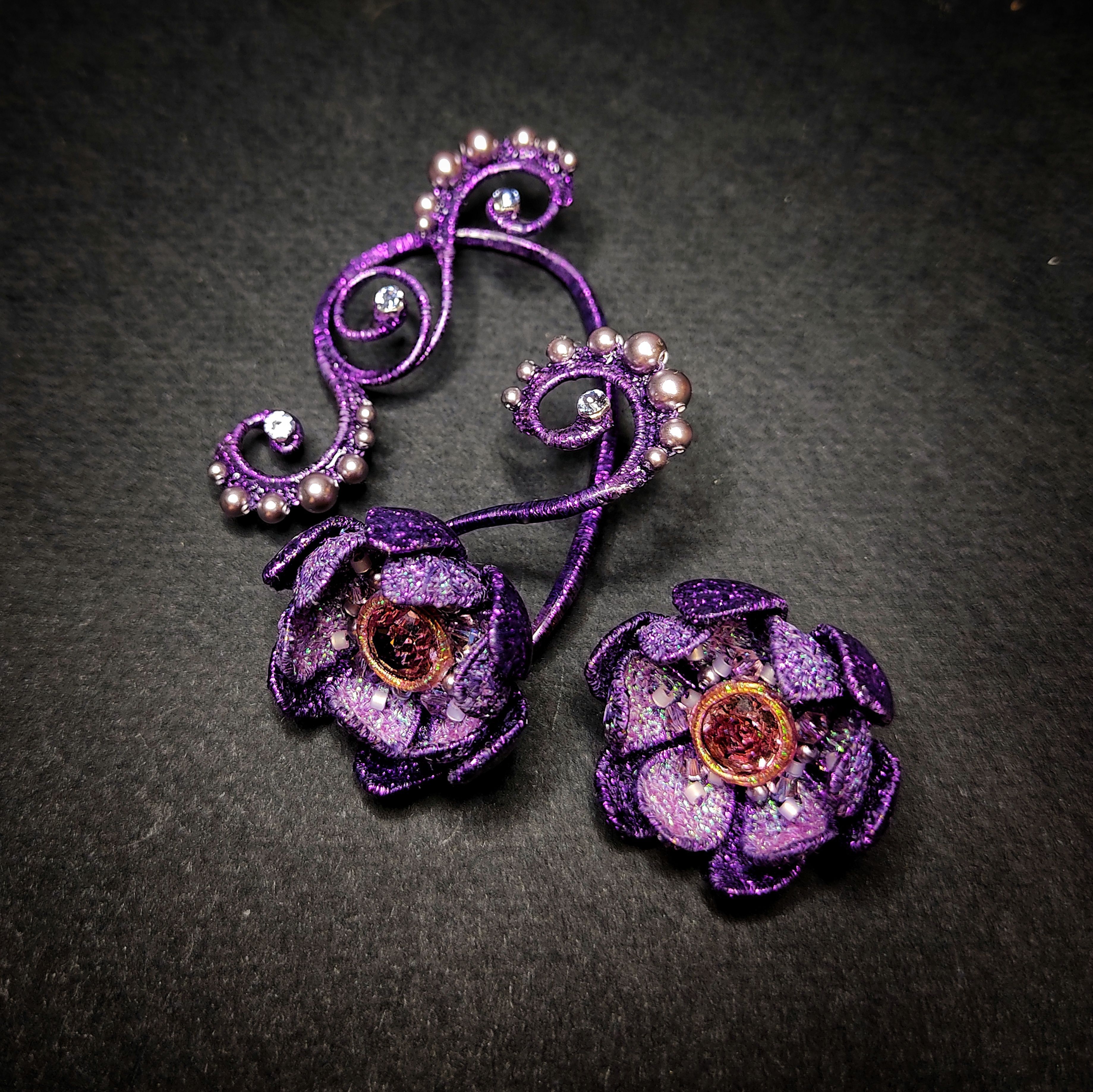 Цветы выполнены в технике свободно-ходовой машинной вышивки с использованием проволочного каркаса. Кафф выполнен из проволоки и металлизированных нитей с ввязыванием кристального жемчуга крючком.
