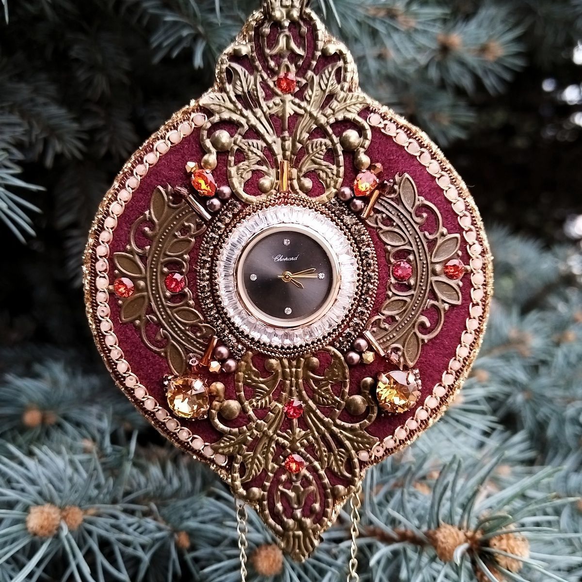 ЧАСЫ в винтажном стиле, на ходу. Можно подводить время и менять батарейку. В работе использован бархат, которому полвека. Новогодний набор "Сказка зимнего рассвета" использован частично.