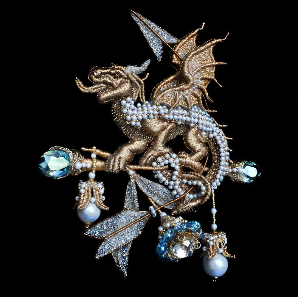 Дракон охраняет сияющий цветок, сплетенный из хрустальных капель цвета неба. Этот цветок и есть творческая частица души человека, его талант. Тело дракона обвивает стрела, олицетворяющая собой заданный вектор в творчестве, путь, который каждый из людей выбирает для своей жизненной реализации. Таким образом, объединив все вышеизложенное, смысл , заложенный в броши можно выразить так - выбрав свой путь, сохрани и сбереги свое внутреннее творческое сияние, стремись к его развитию и обогащай его новыми знаниями и гранями .