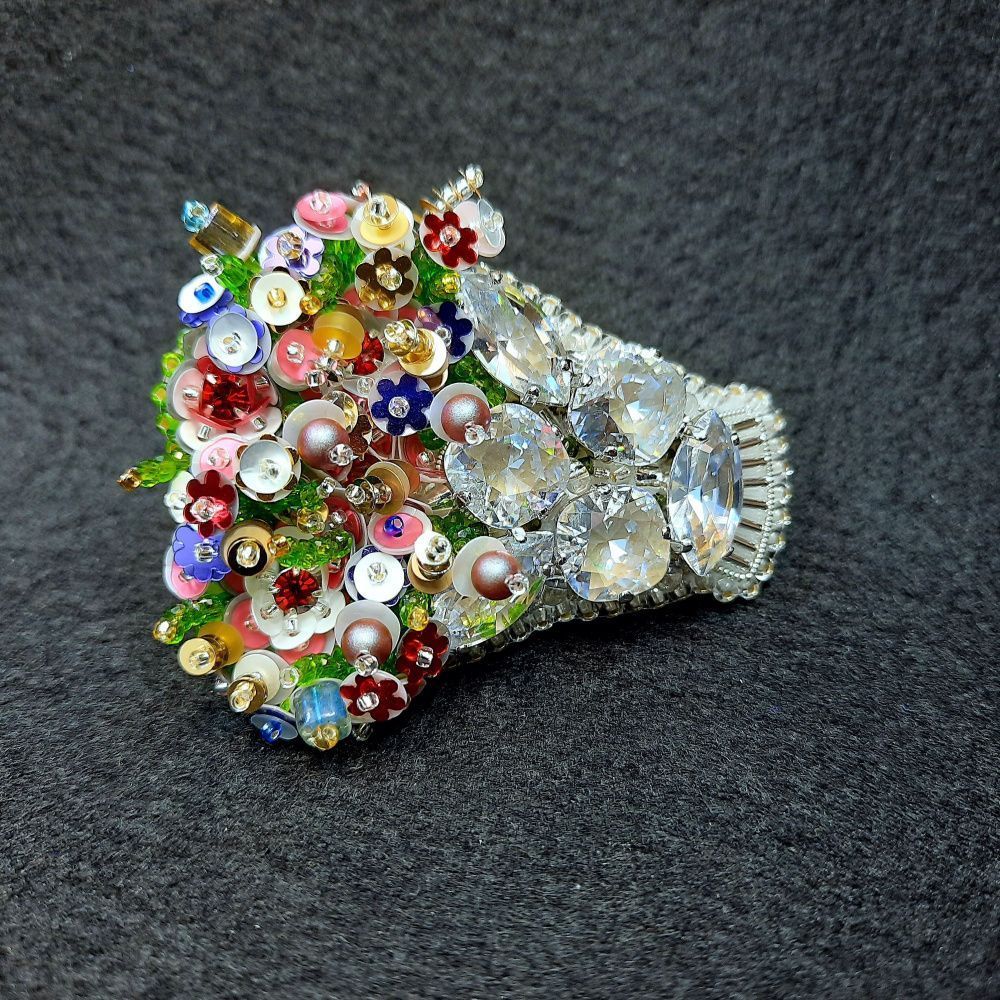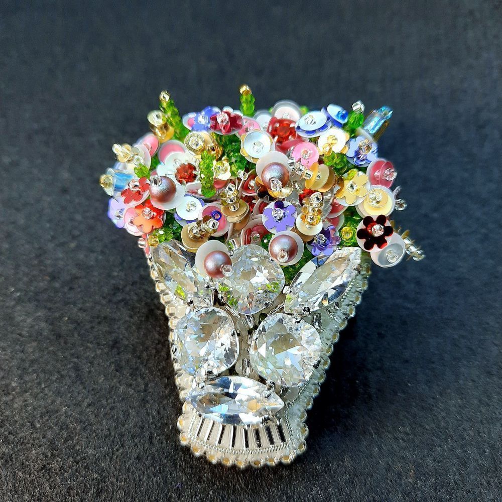 Работа представлена в виде броши – прозрачной вазы с полевыми цветами. Сверкающие грани