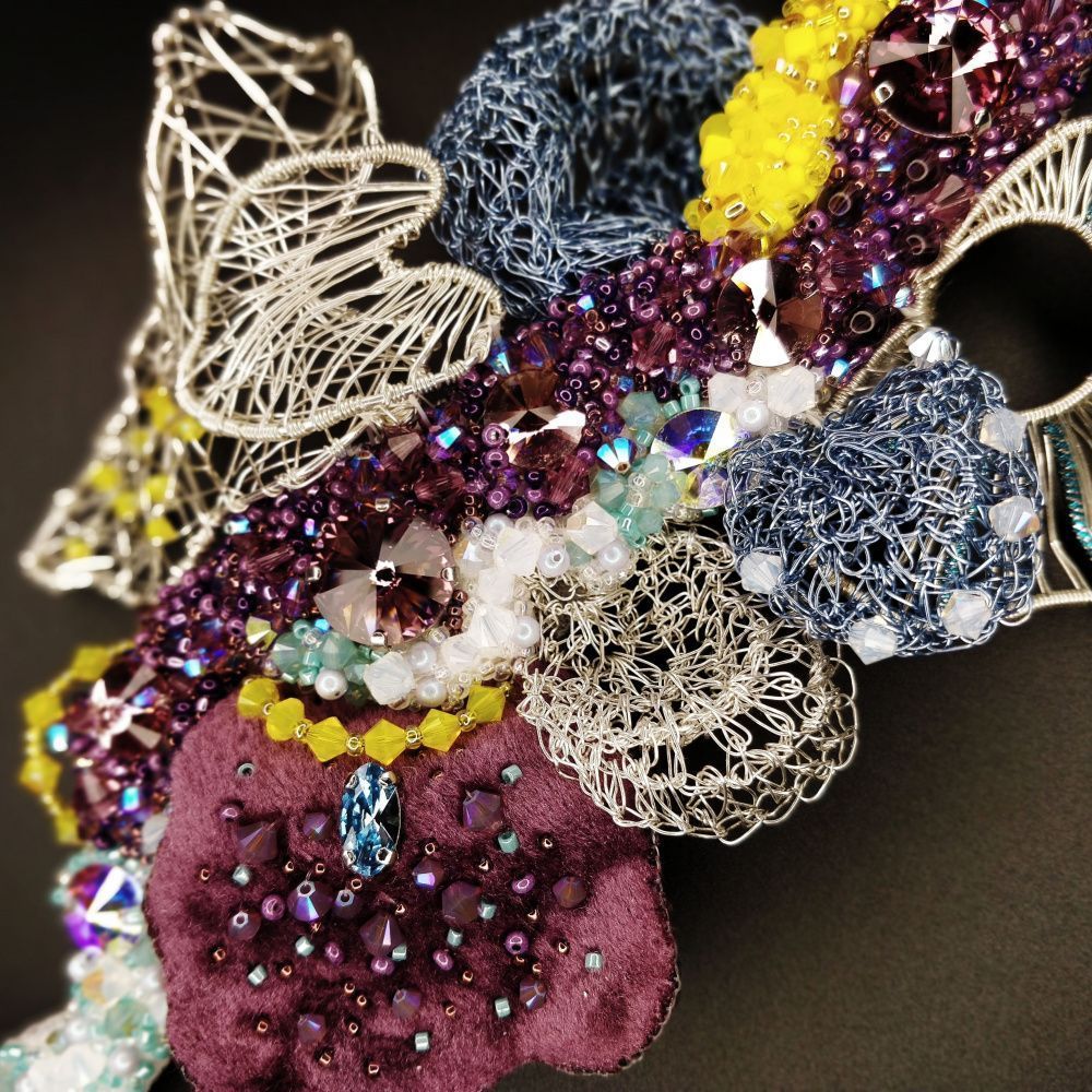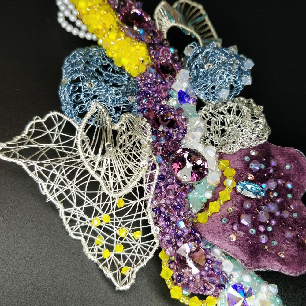 Август - это месяц смены времён года. Он разнообразен и эмоционален. Поэтому брошь "Сияние Августа" многогранна. Она богата смешением красок: от белого до темного аметистового, фактур: от нежного и теплого бархата до холодного металла, техник выполнения: вышивание, плетение, вязание.