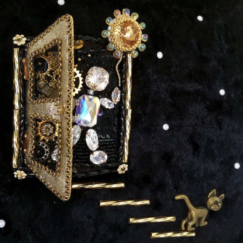Кристальный человечек открывает дверь и.... выходит из механического, ставшего уже привычным, замкнутого пространства в большой, изменившийся, живой мир. Там пока темно. Что его ждет? Неизвестность. Но человечек сияет, и он готов наполнить все вокруг светом. На всякий случай, у него даже собственное солнце в руке. Перед собой, через порог запускает в мир кота... на счастье!