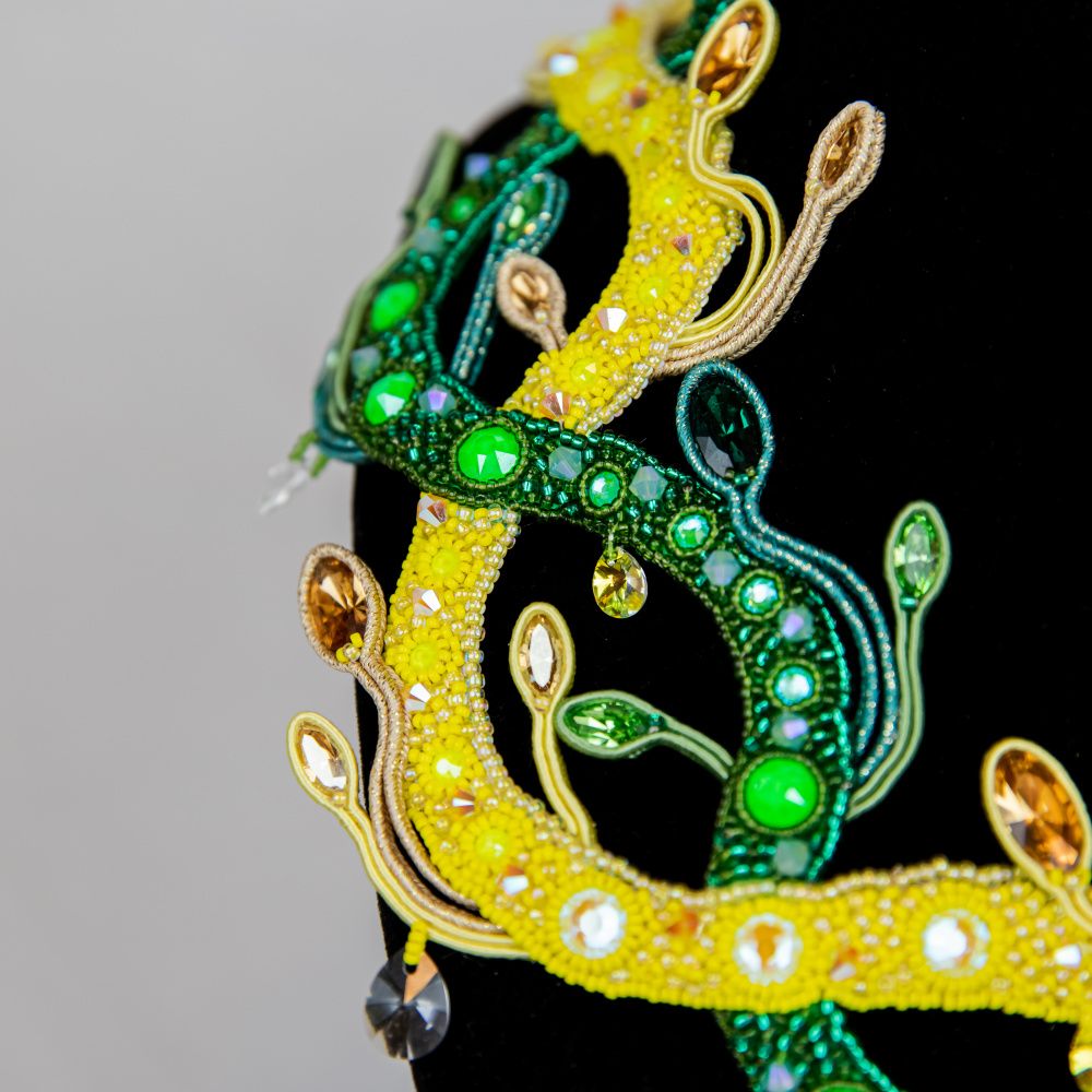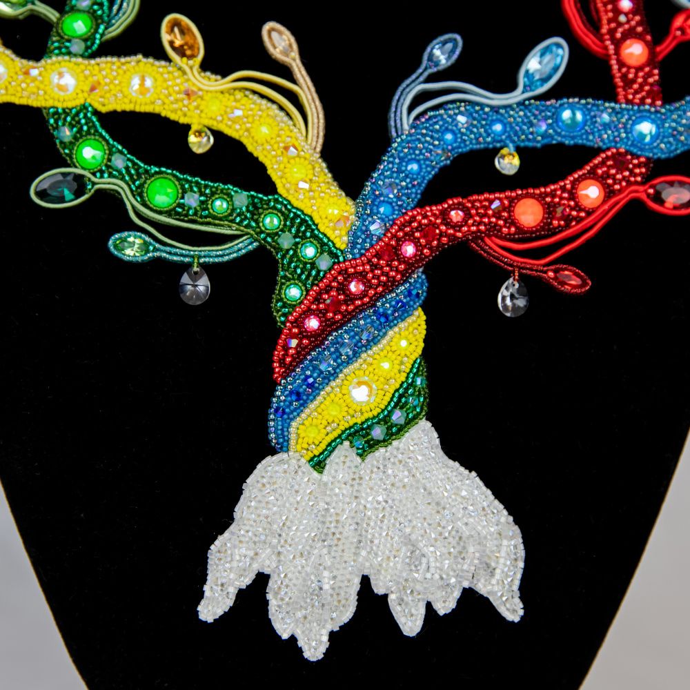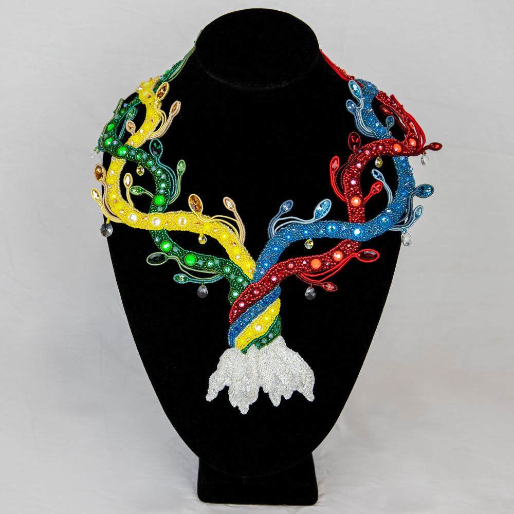 Over this latest period, which has been difficult for everybody, I have had time to think about what is truly important. To represent my thoughts I have created a tree of life with deep white roots, which are a symbol of purity. From white, the origin of all colors grows a trunk made of a bundle of colors that represent, respectively, love (red), serenity (blue), hope (green), and yellow (friendship). These colors, each of them occupying a branch gleaming with dewdrops, grow apart, only to rejoin at the end of this necklace, just as we have reunited with our loved ones and with life.