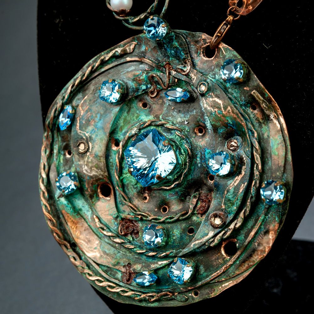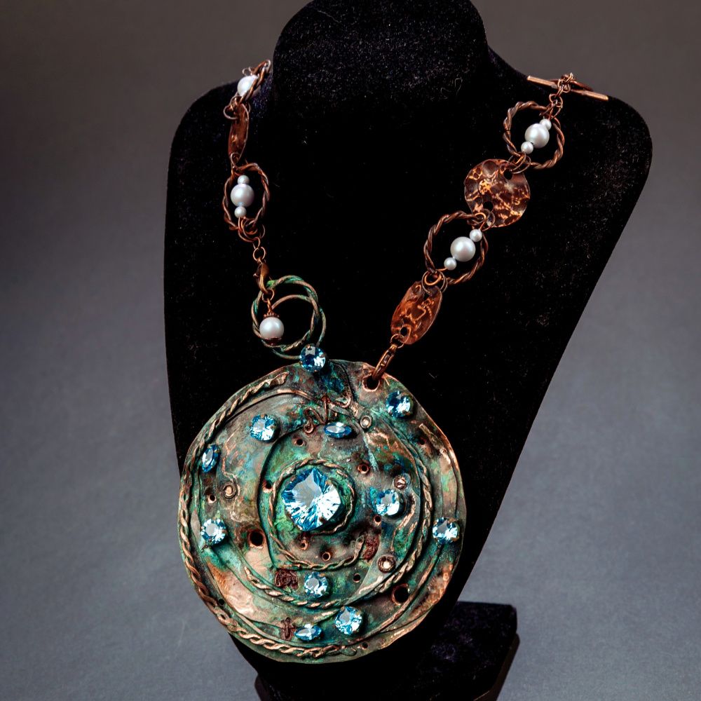 Моё колье — это прекрасные и завораживающие стихи Александра Блока выраженные в меди. Если присмотреться, то в колье можно увидеть и реку и звезды, и центральный кристалл- душу.Вокруг которого всё и вращается. Такой совершенный в своей холодной красоте. Несколько слоёв патины помогают передать «течение реки», а кристаллы это конечно же звезды.Но главнее всего душа- от нее очень трудно оторвать взгляд.