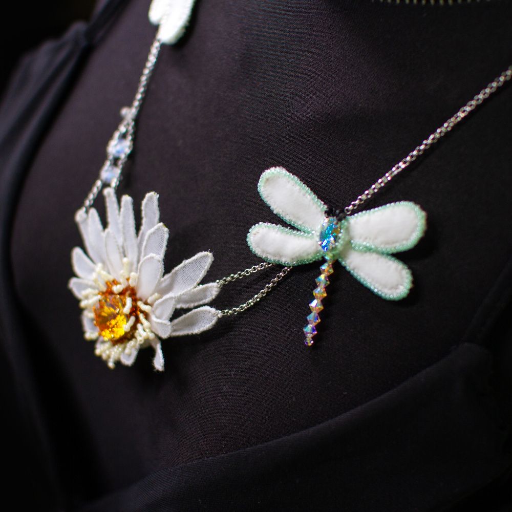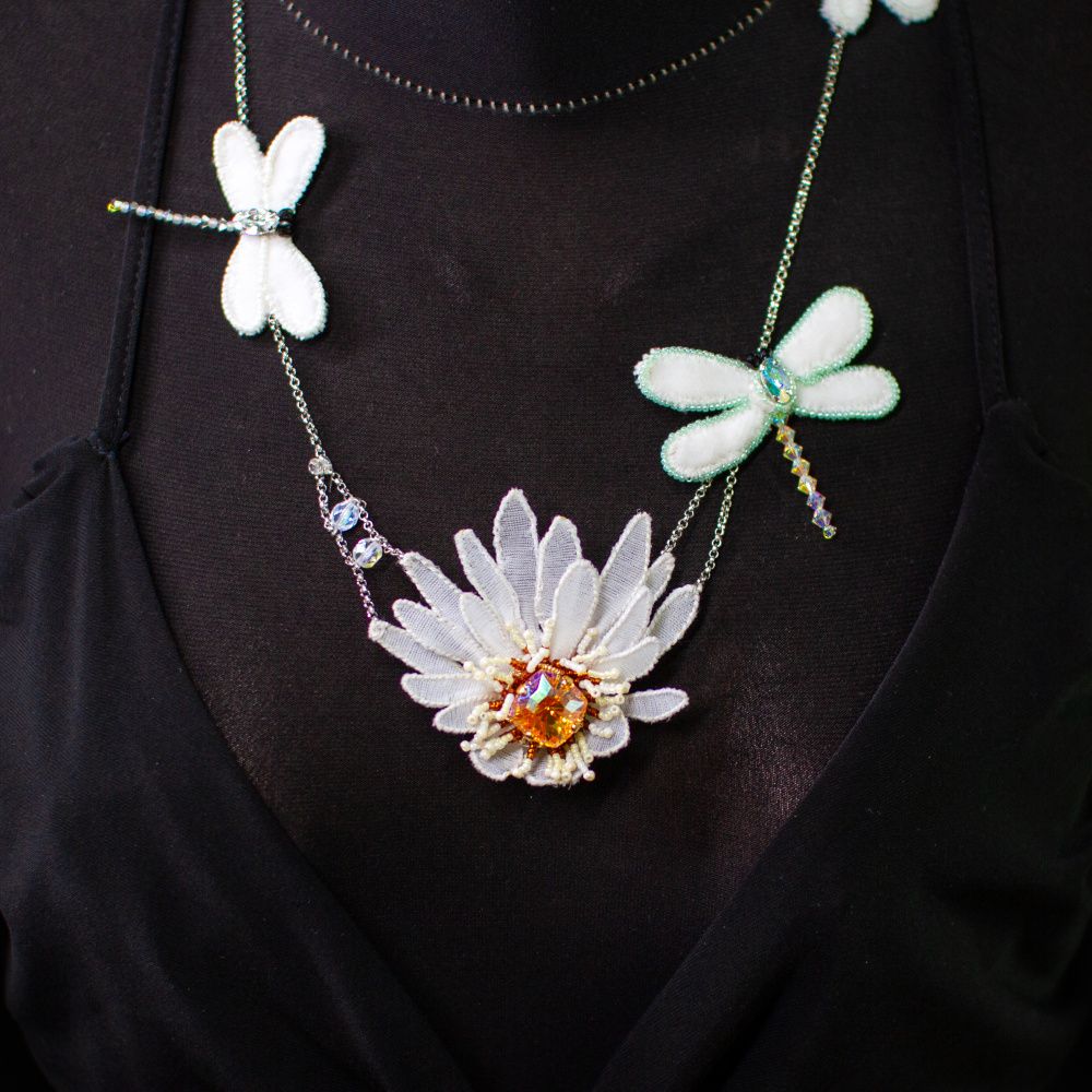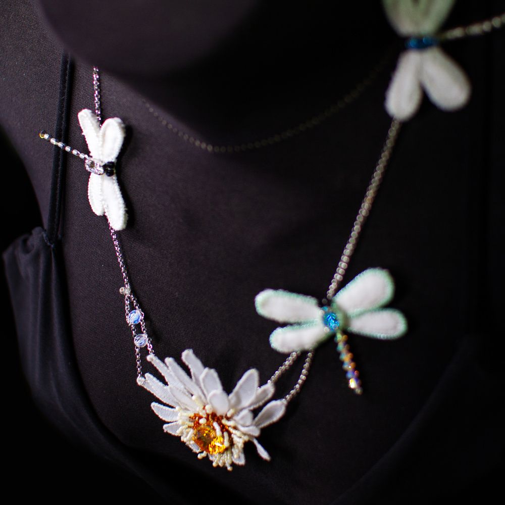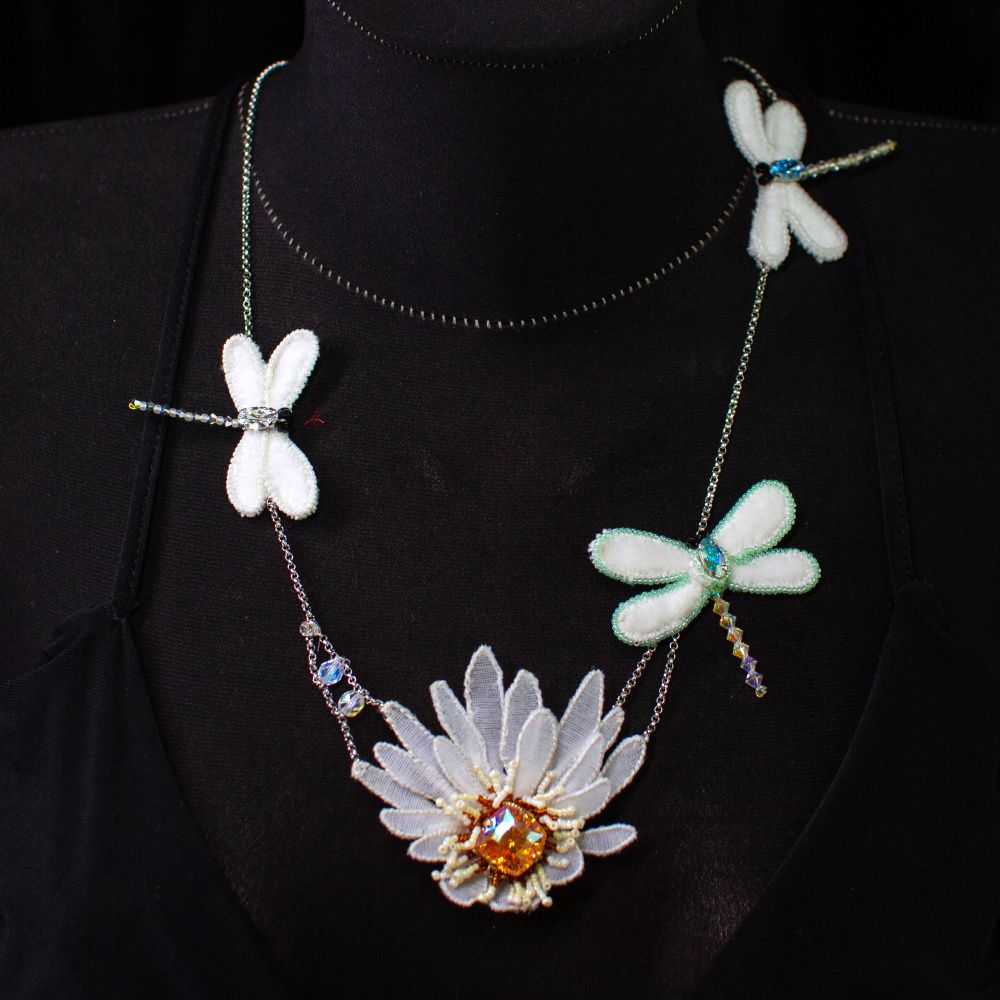 Оказавшись на берегу реки, время остановилось: вокруг тишина, лишь только шум речки. Вокруг вода, кувшинки, стрекозы, солнце… Все переливается, сверкает, звук непередаваемый. И вот здесь, с сияющей улыбкой на лице, и радостью от этой красоты, родилась идея создания колье «Полет».