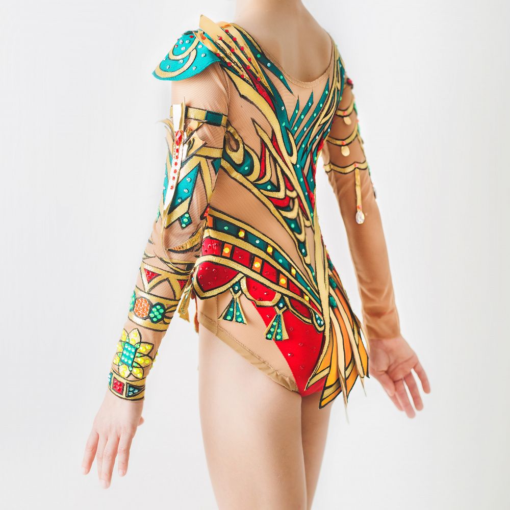 В основу купальника легли три цвета бифлекса: бордово красный, изумрудно зелёный и золотой.