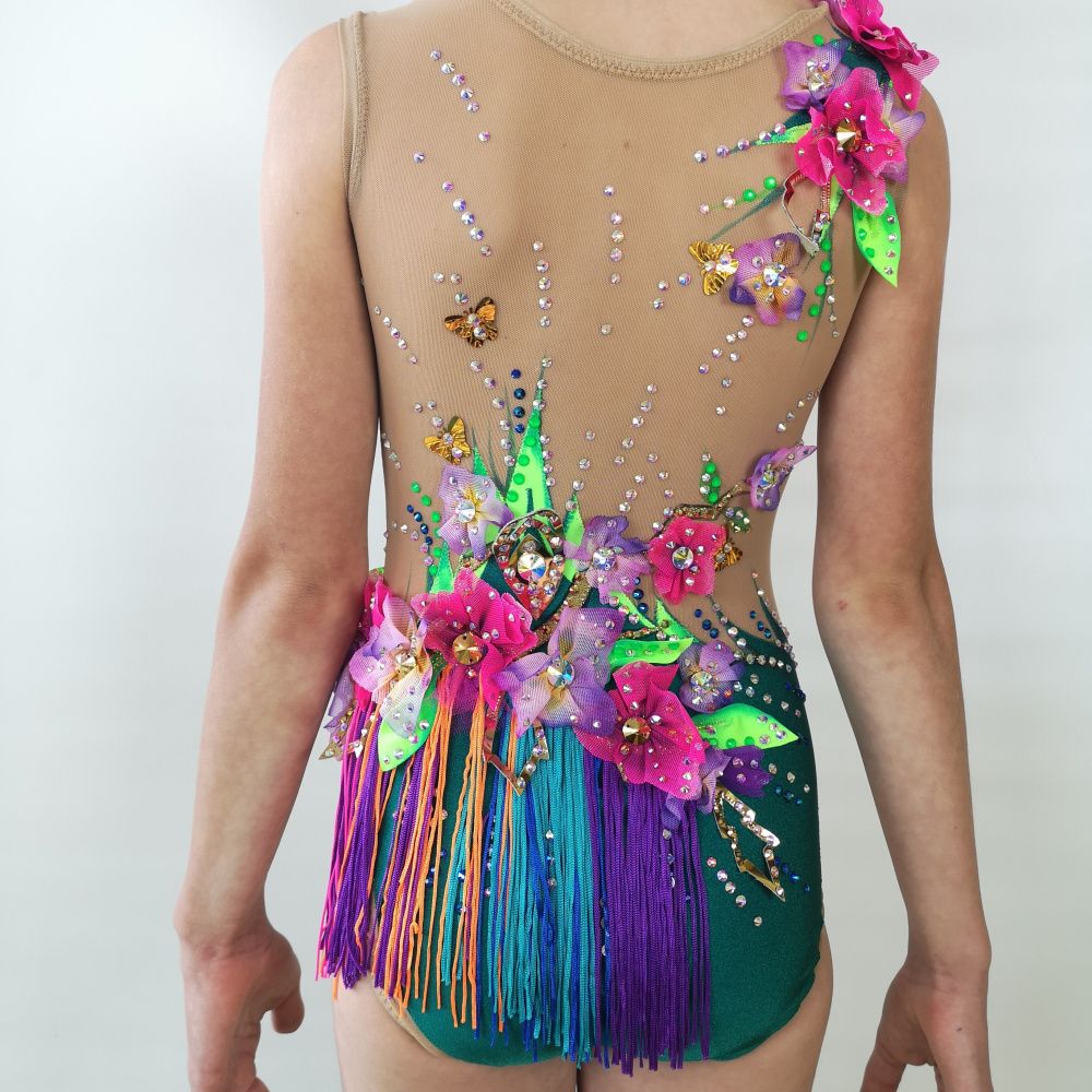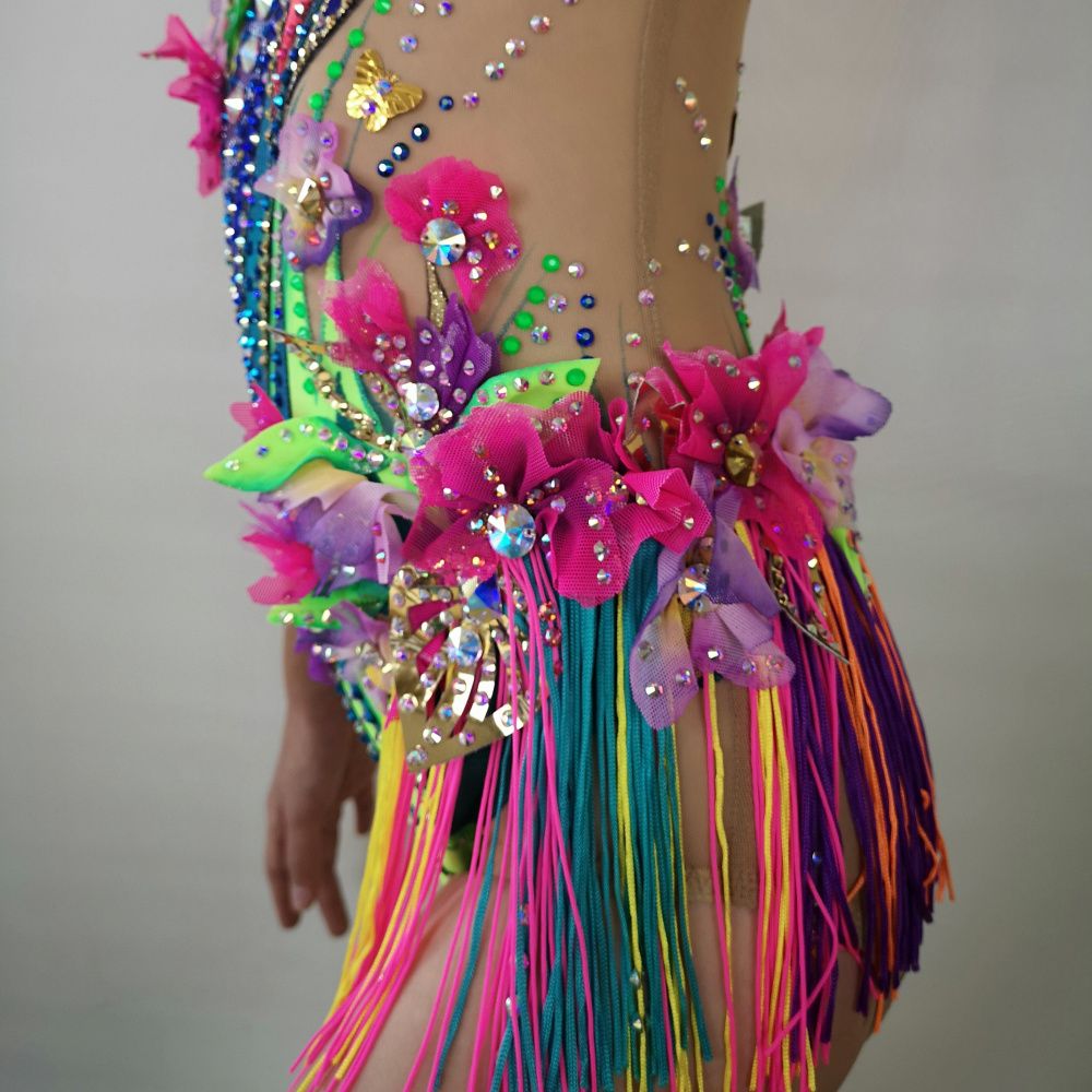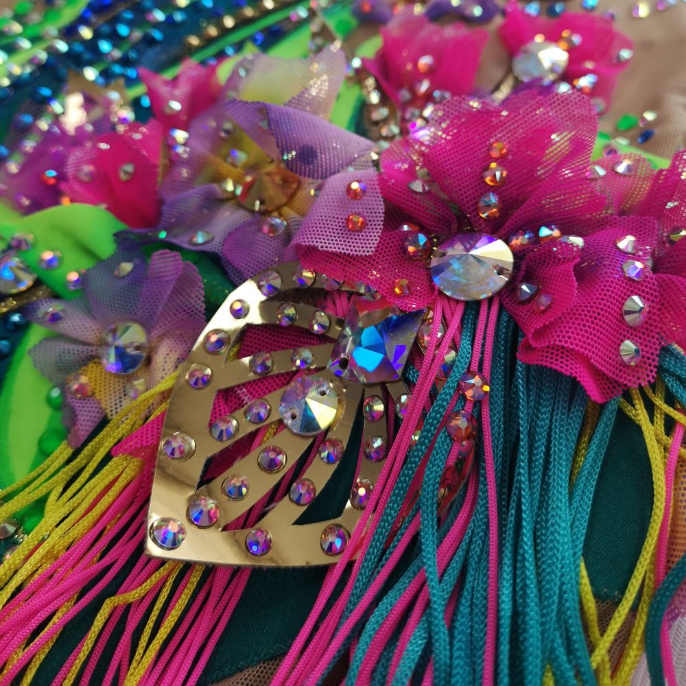 Волшебная птица на купальнике распадается на множество кусочков. Её изображение дробится, как отражение в граненом зеркале. При этом строгие геометрические формы с одной стороны смягчаются растительным декором, а с другой - подчёркиваются сверкающими всеми гранями кристаллами. И в свете софитов купальник засверкает по-новому!