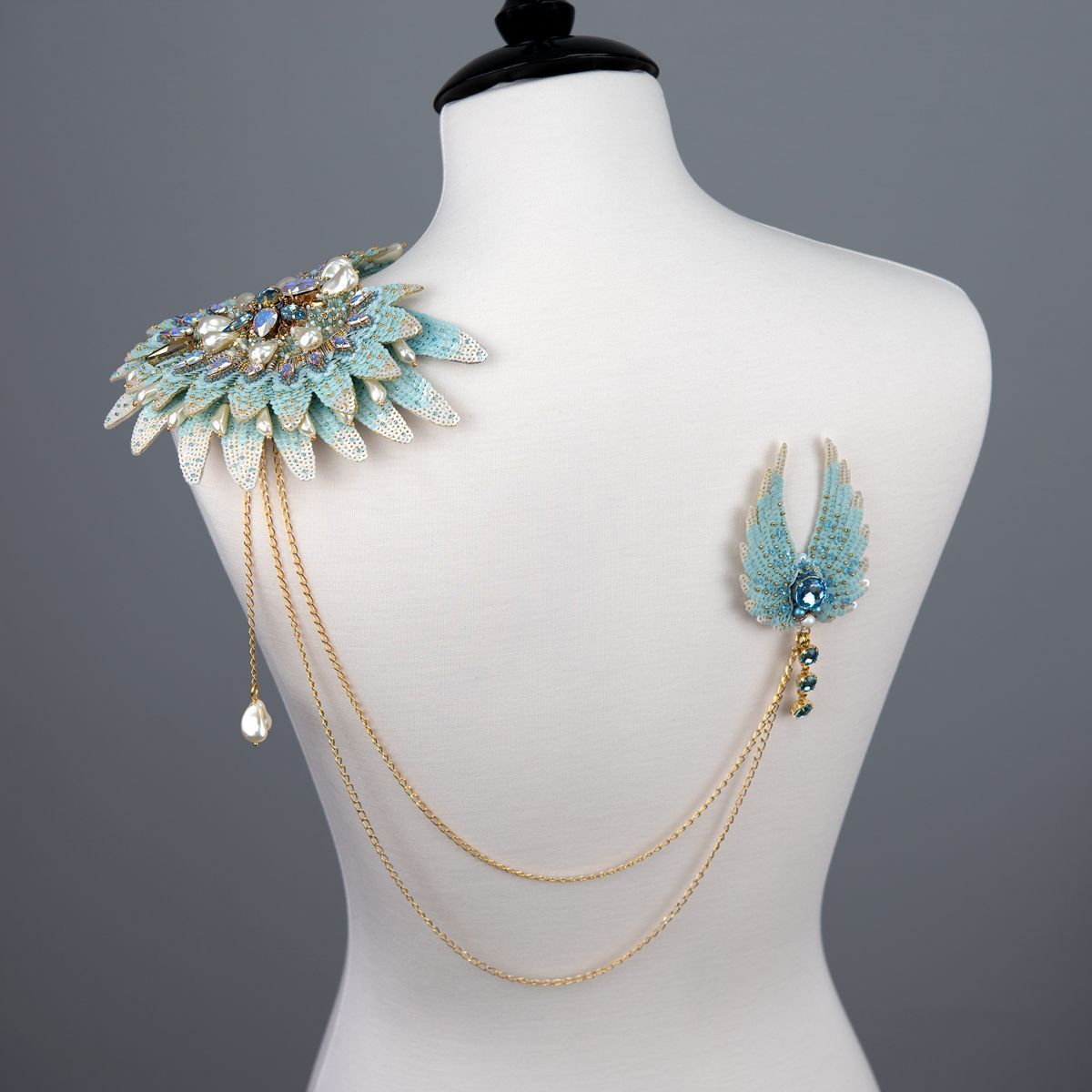 Нежно-голубая цветовая гамма, в сочетании с золотой фурнитурой, создает атмосферу небесной легкости и величия, а каплевидные и круглые кристаллы Swarovski напоминают слезы радости или капли росы, которые переносят нас в миры чудес и загадок. В своей работе я постаралась  изящно переплести  реальное ( фактуру, цвет)с фантастическим ( форма и содержание), выявляя тонкую грань между нашей природой и мистическими тайнами зазеркалья.