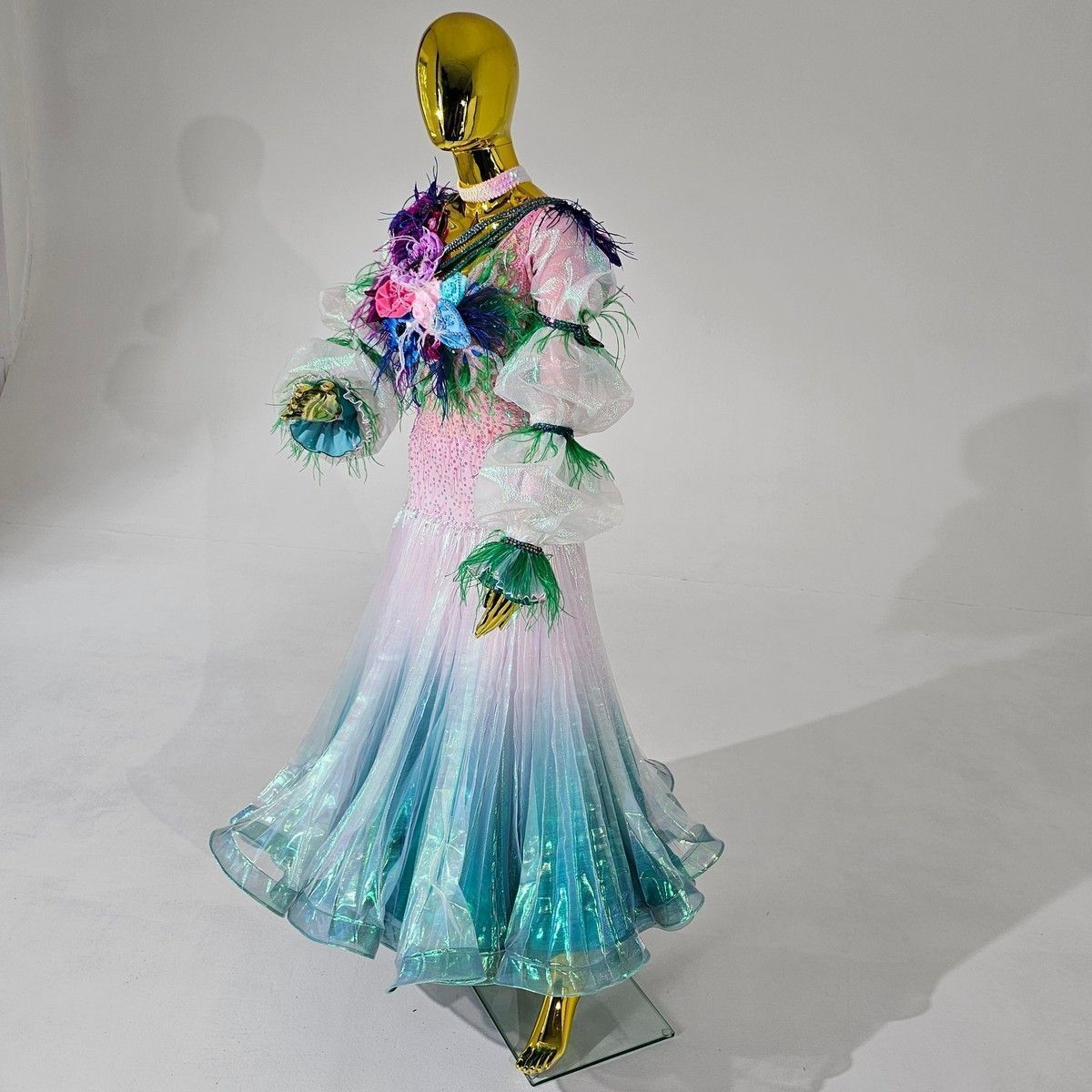 Создавая платье Лесной Девы, я старалась использовать необычные материалы с неземным отливом и свечением – градиенты, органзу. Рукава скроены в виде буфов из роз, а трава выполнена из страусиных перьев, собранных в пучки. Стразы с неоновым эффектом усилили «эльфийское» свечение наряда.