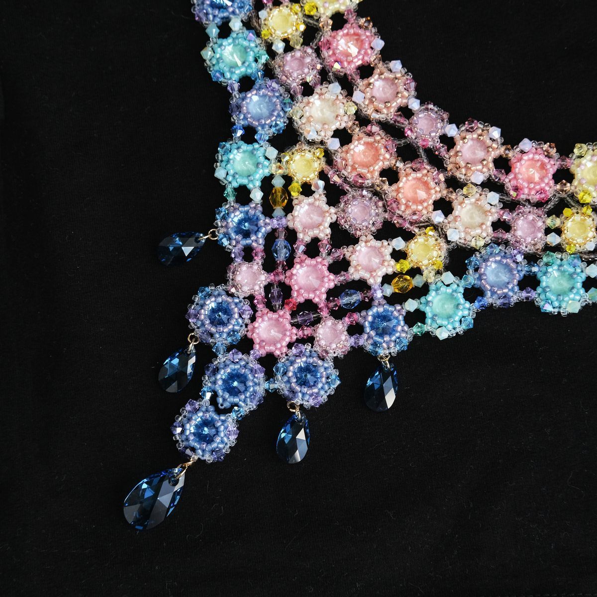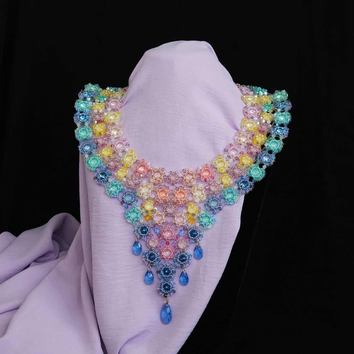 В конкурсной работе применено множество маленьких кристаллов и бусин нежнейших цветов, что позволило отразить красочные переливы утренней Авроры.
