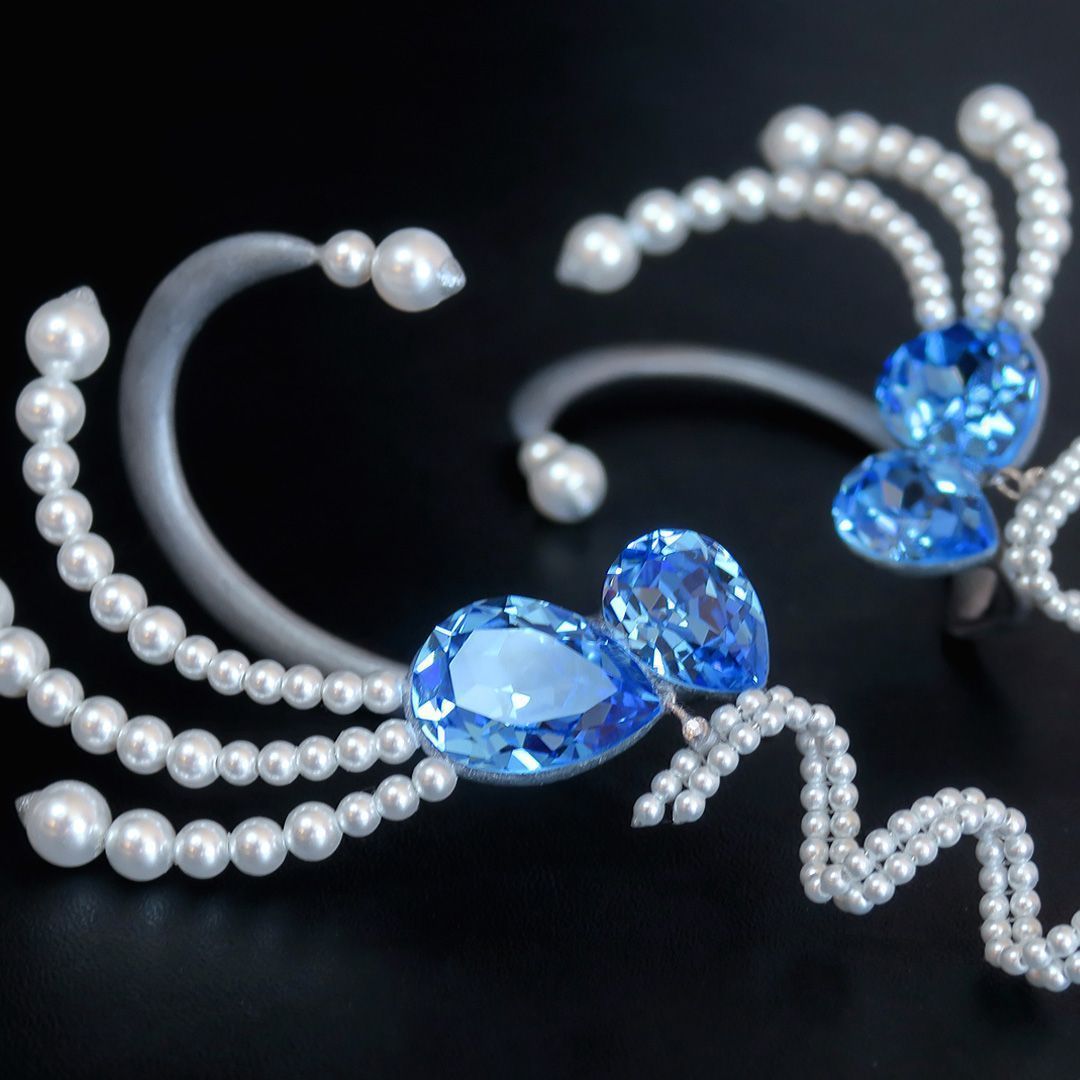 Отправной точкой украшения стали кристаллы нового холодного оттенка Ice Blue и сдержанный серебристый жемчуг Moonlight. Уравновешенный глубокий синий хорошо передаёт спокойствие необъятного, безбрежного моря, а сверкающие хрустальные бусины, соединённые в незатейливые конструкции, согласно задумке не только подчеркивают лёгкий трепет зыбкой волны, но и привносят ощущение свободы и полёта.