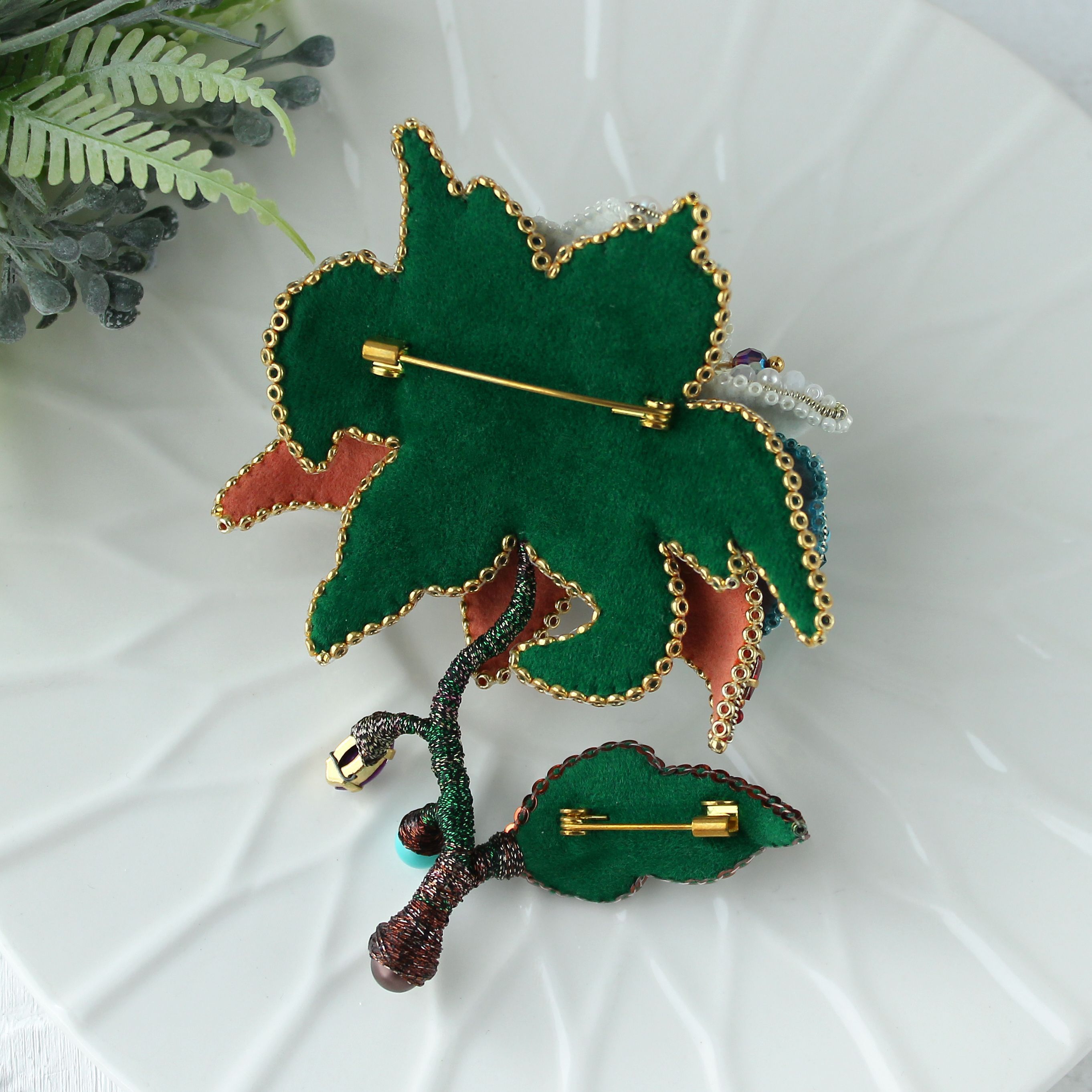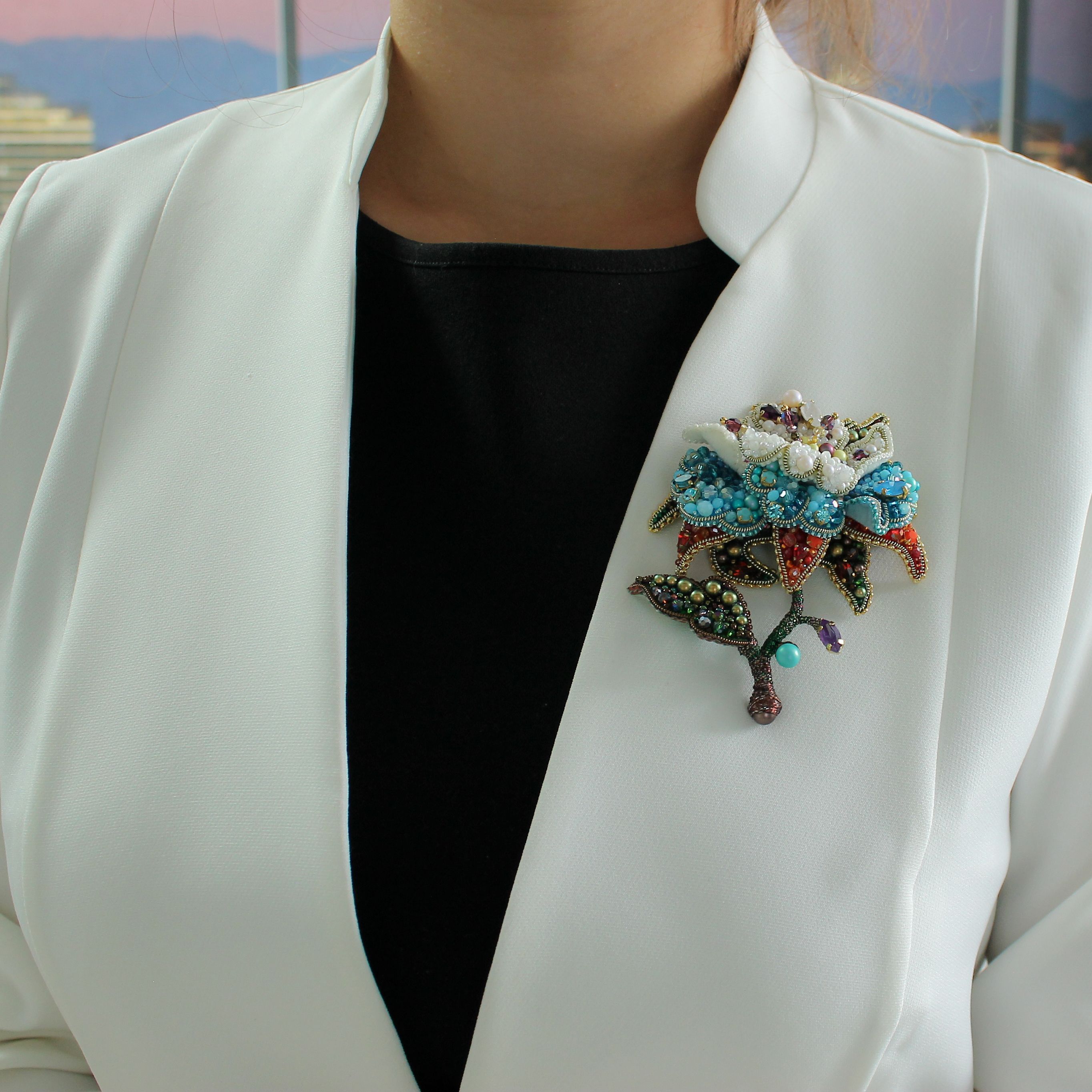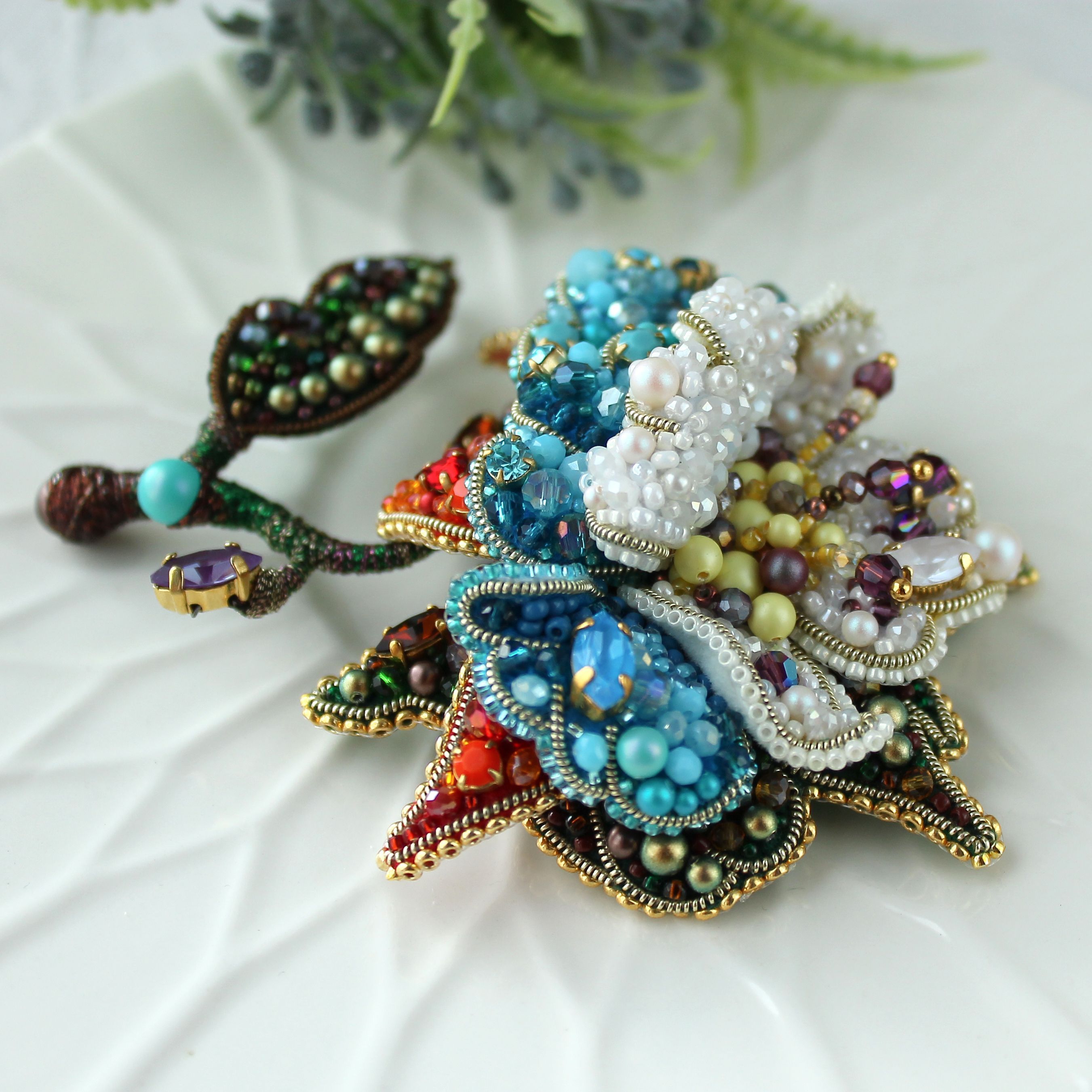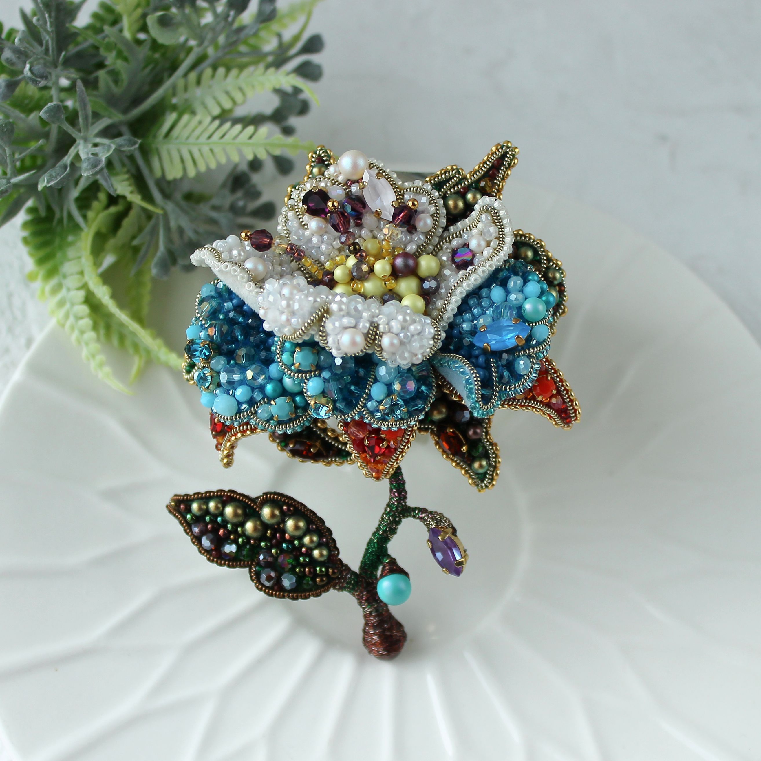 Ривенделл — сказочное и невероятно красивое убежище эльфов в фильме «Властелин Колец». Именно с этим местом у меня возникла первая ассоциация, когда я увидела тему работ. Этот волшебный объемный цветок выполнен в четырех цветовых гаммах: зелено/коричневой — что символизирует стихию земли, красно/оранжевой — стихия огня, сине/голубая — стихия воды и жемчужно/белой —  стихия воздуха. Он объединяет в себе всю их силу и способен наполнить ею того, кто к нему прикасается и стать верным талисманом!