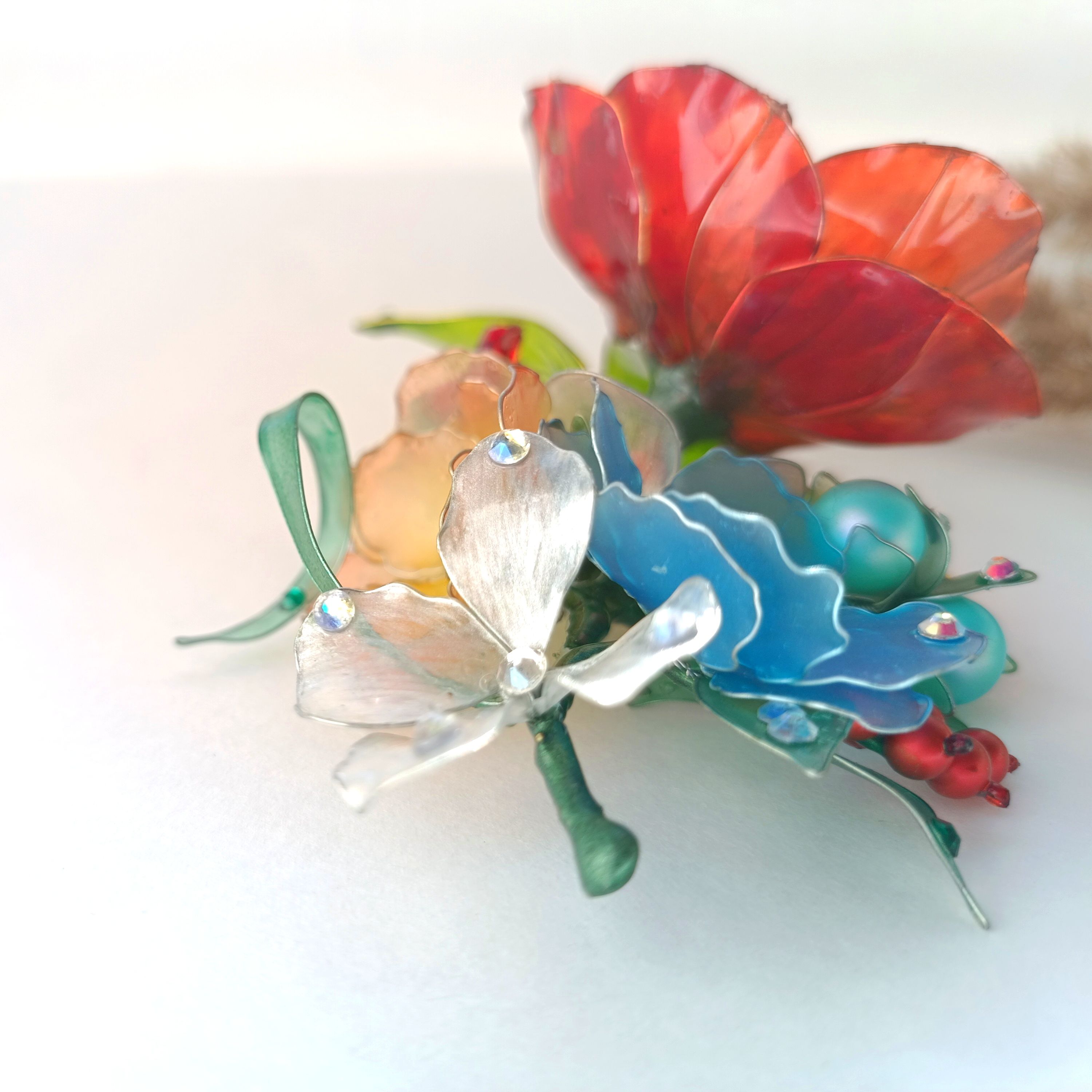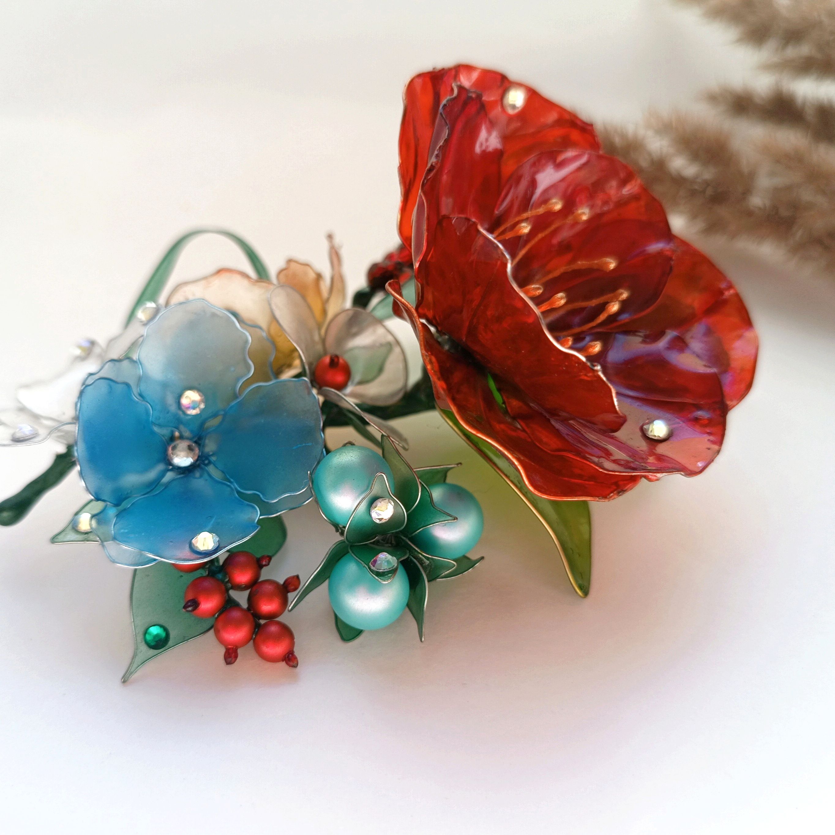 Данная работа представляет собой брошь в виде полевого букета, олицетворением которой является скромность, простота, лёгкость. Частичка лета запечатленная в каплях утренней росы на листьях как символ чистоты и невинности.