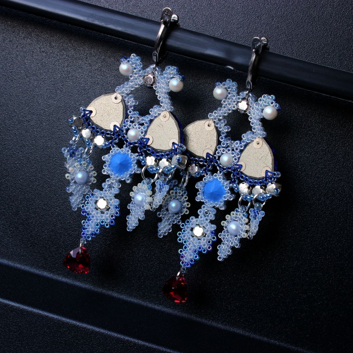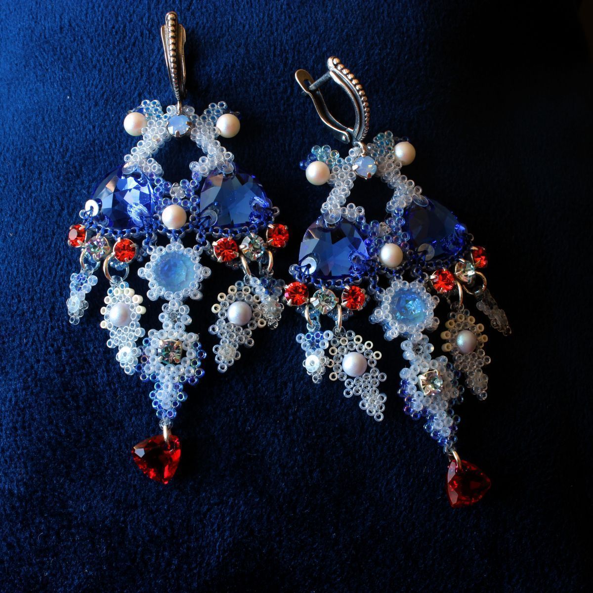 Это полностью плетёные серьги в не самой популярной (т.к. трудоемкой) технике, но именно она даёт лёгкость, воздушность, при этом большую прочность украшению.