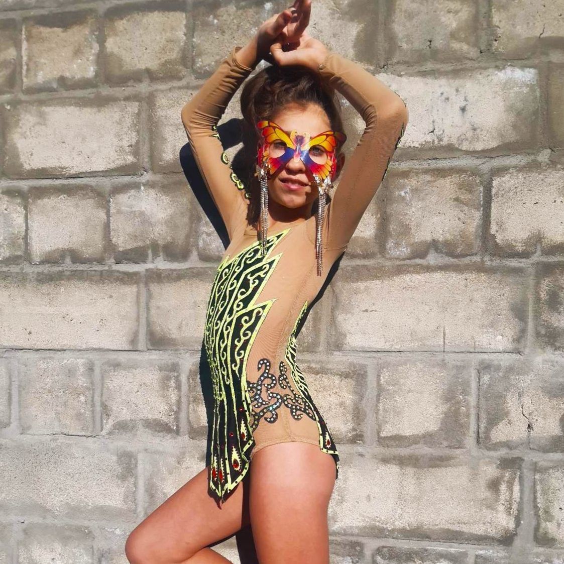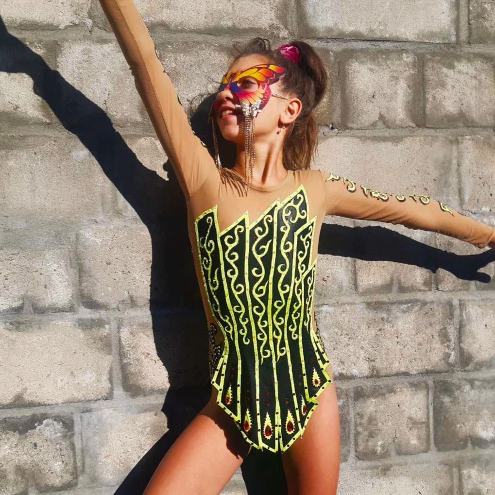 В моей работе в основе лежат узоры. Я не стала склоняться к какому либо национальному колориту, так как узоры есть во всех национальных традициях, часто очень похожих друг на друга, но отличающихся по цвету и их изображению, поэтому мои узоры имеют цвет лайм на черном бифлексе с имитацией кожи. Узоры на купальнике спереди и на спинке заключены в геометрической основе, а по бокам и на рукавах говорят о том, что можно и нужно выходить за рамки своего ограничения. Стразы расположены только по узорам, чтобы их и только их подчеркнуть.