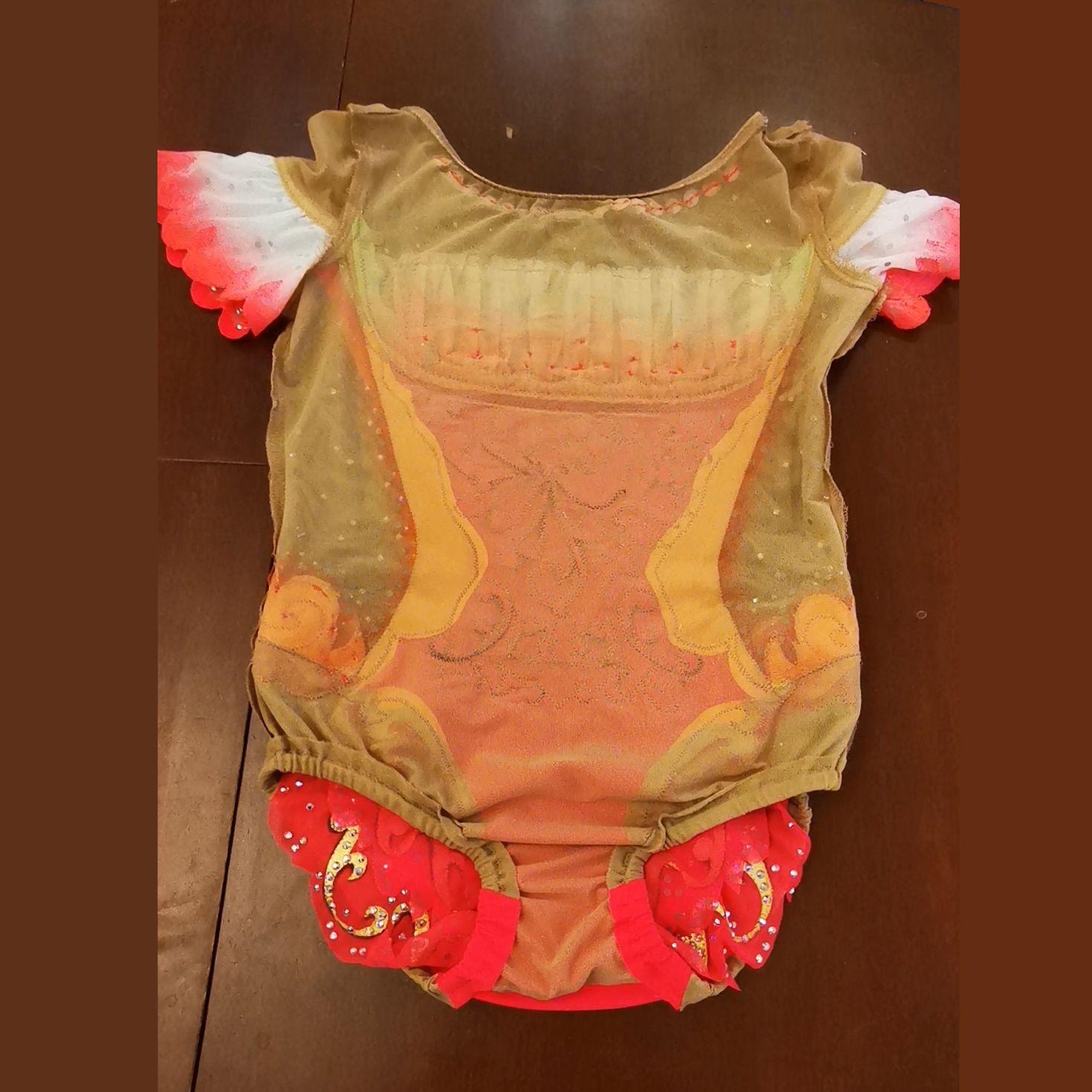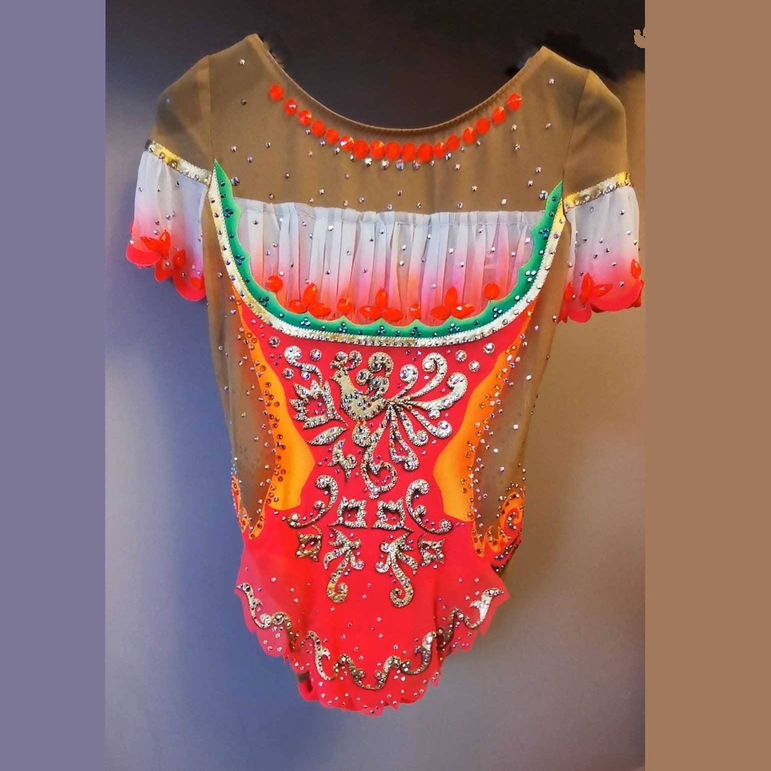 Соблюдена цветовая палитра, характерная для хохломской росписи: контраст золотого, алого и неонового, помогли достичь желаемого результата. Купальник получился ярким, выразительным и абсолютно соответствует поставленной программе.