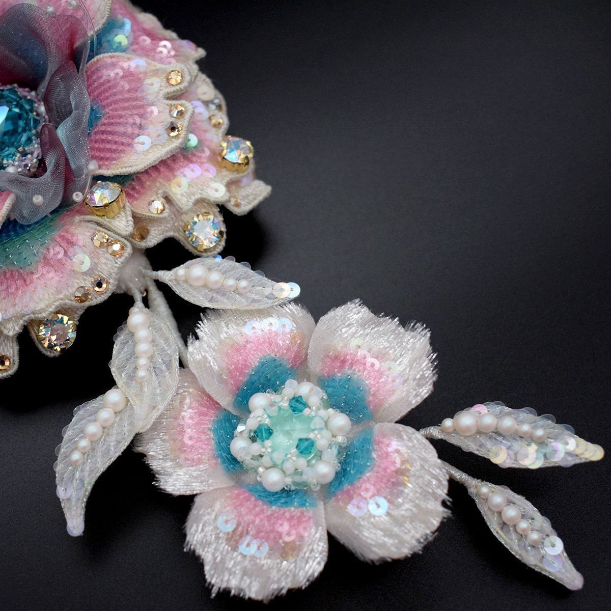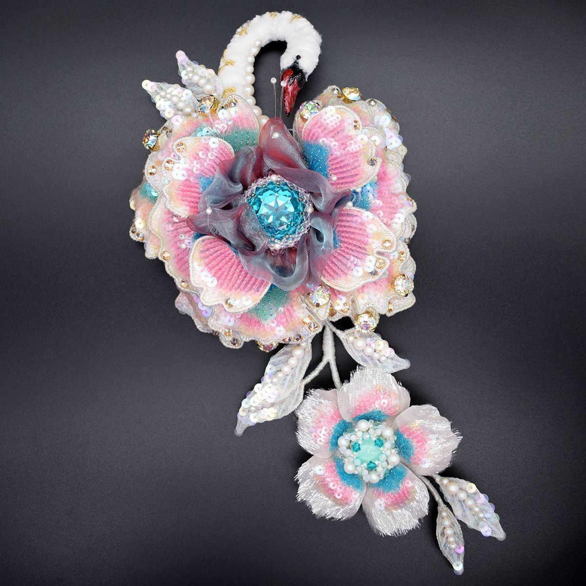 Она воплощение женственности и изящества, очаровательная и нежная, словно лебедь. Её образ завершён восхитительным украшением на поясе платья, чуть ниже талии— брошь представленная в форме флорального антропоморфа. Изящная шея элегантного лебедя плавно перетекает в тело фантастического цветка, создавая гармонию двух миров. В центре величественный кристалл Swarovski, создающий игру граней и украшающий сердечную точку сказочного цветка, усыпанного искрящимися стразами. В завершении нежная ветвь с бутоном и листьями, вышитыми аккуратными рядами белого жемчуга Swarovski, усиливающего ощущение нежности и женственности образа