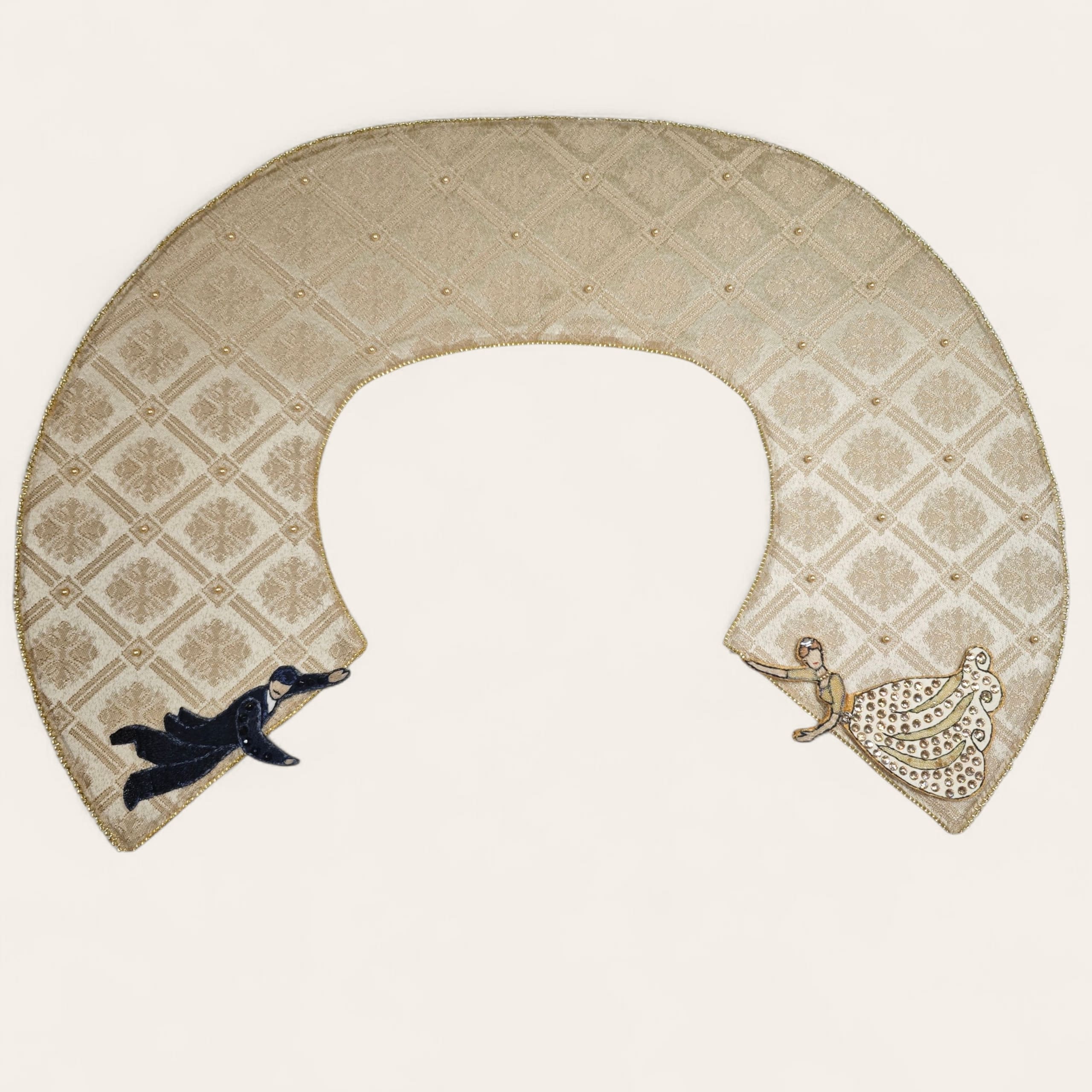 На фоне, напоминающем узор паркета, застыли в изящном движении кавалер и дебютантка. Она парит в его руках, а он бережно ведёт её сквозь время. Паркет под ногами мерцает, словно сохраняя следы всех, кто когда-то танцевал здесь вальс.