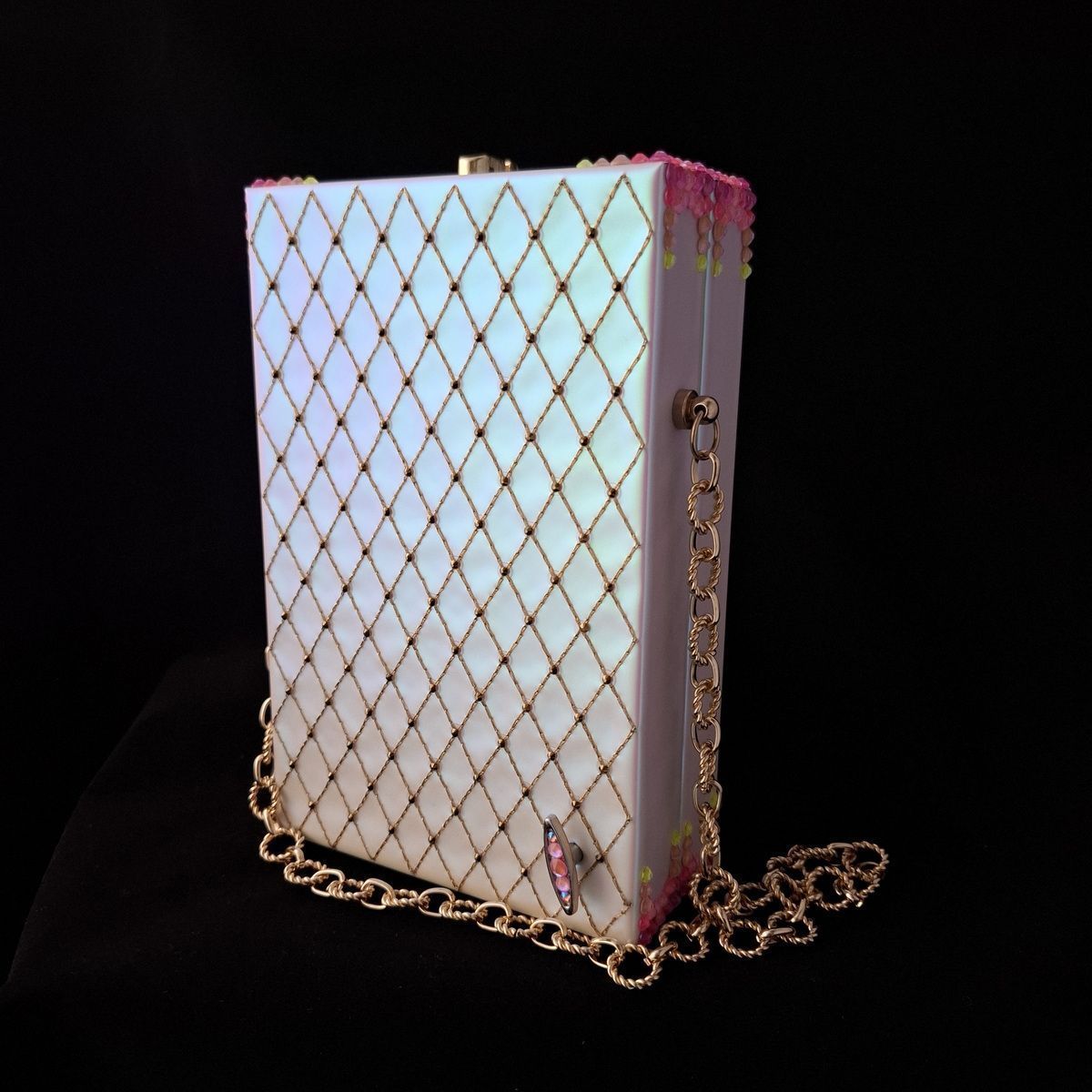 Клатчбокс украшен объемным кружевом фриволите и кристаллами. Внутри спрятан пейзаж с замком, выполненный в стиле объемных иллюстраций из книги сказок, и музыкальный механизм, превращающий клатчбокс в музыкальную шкатулку.