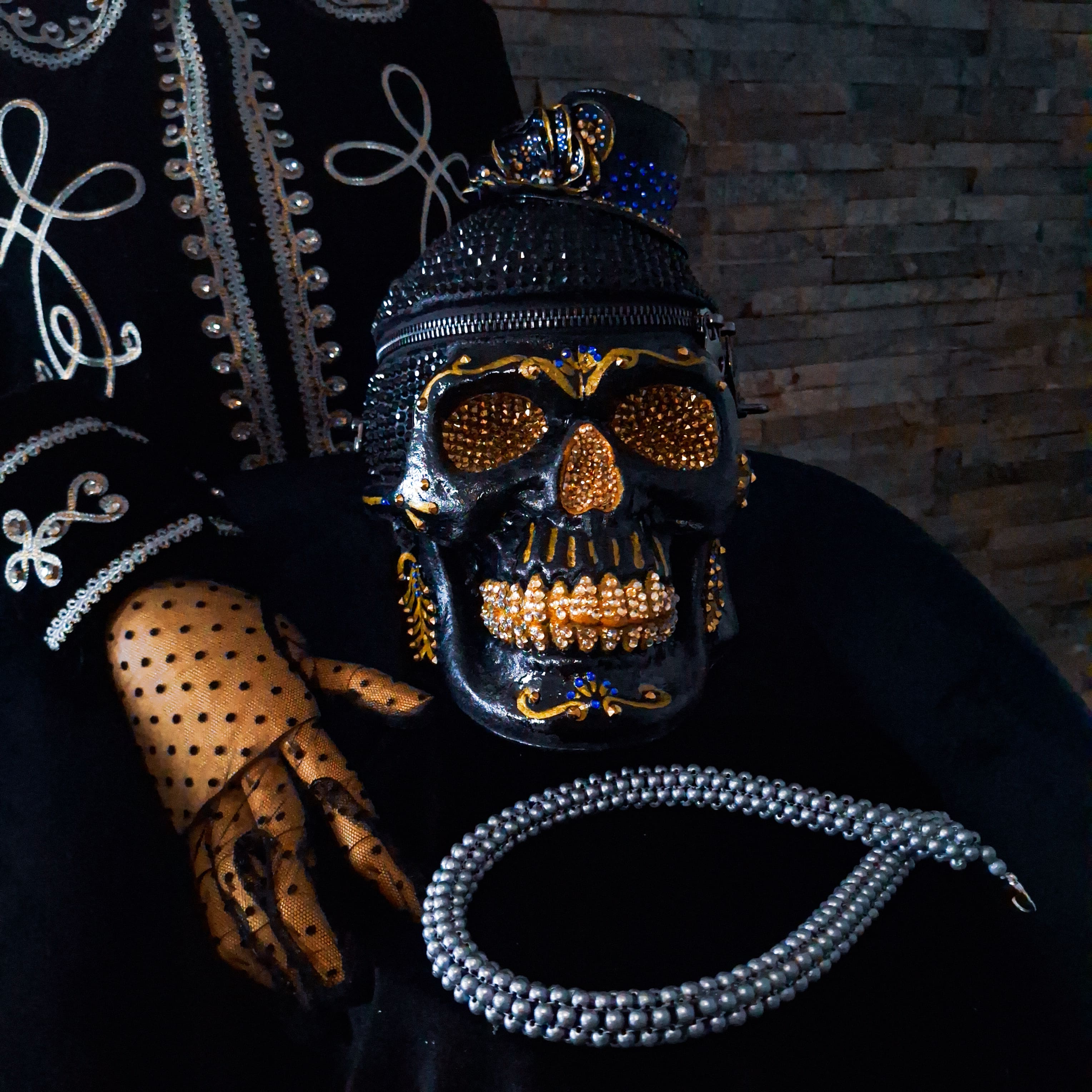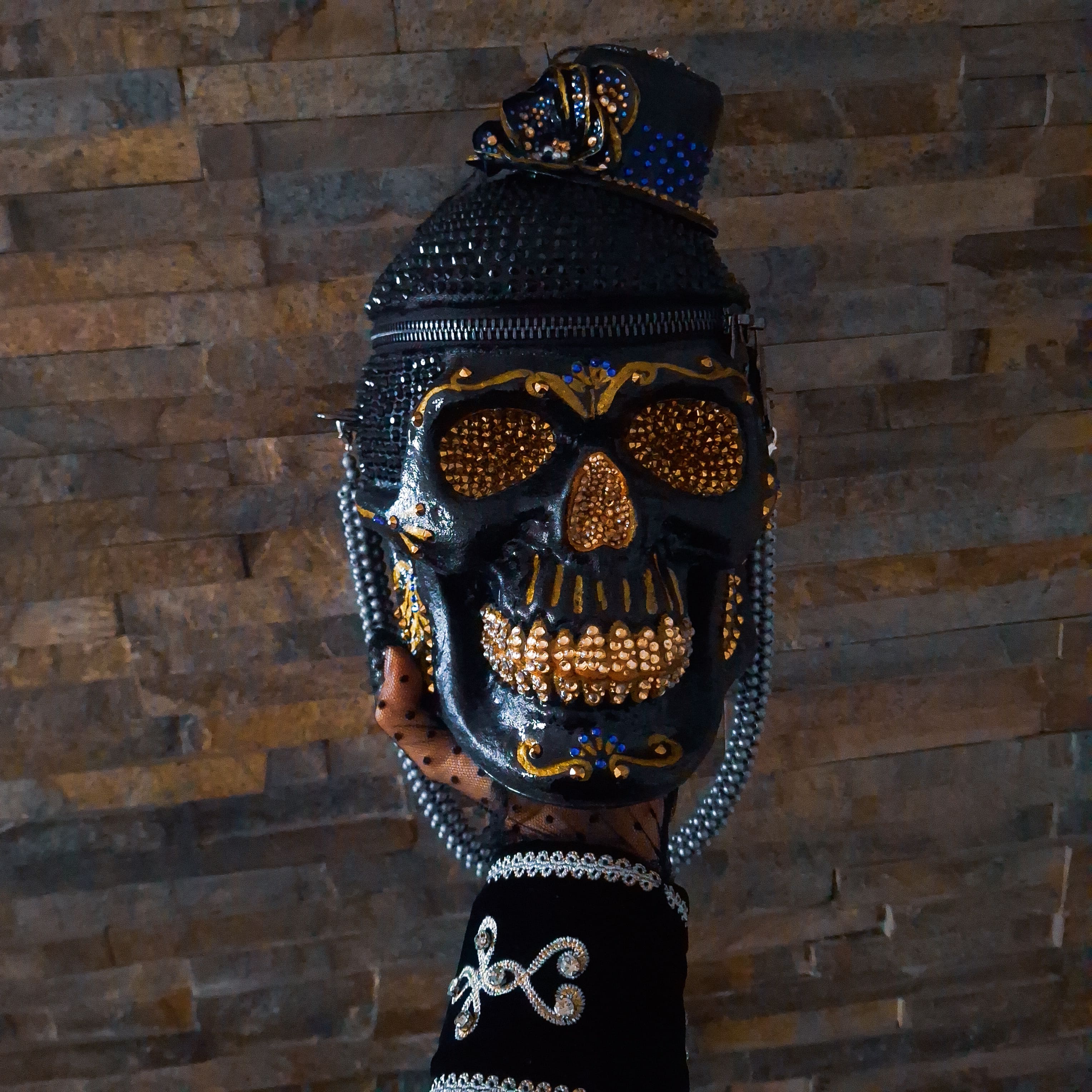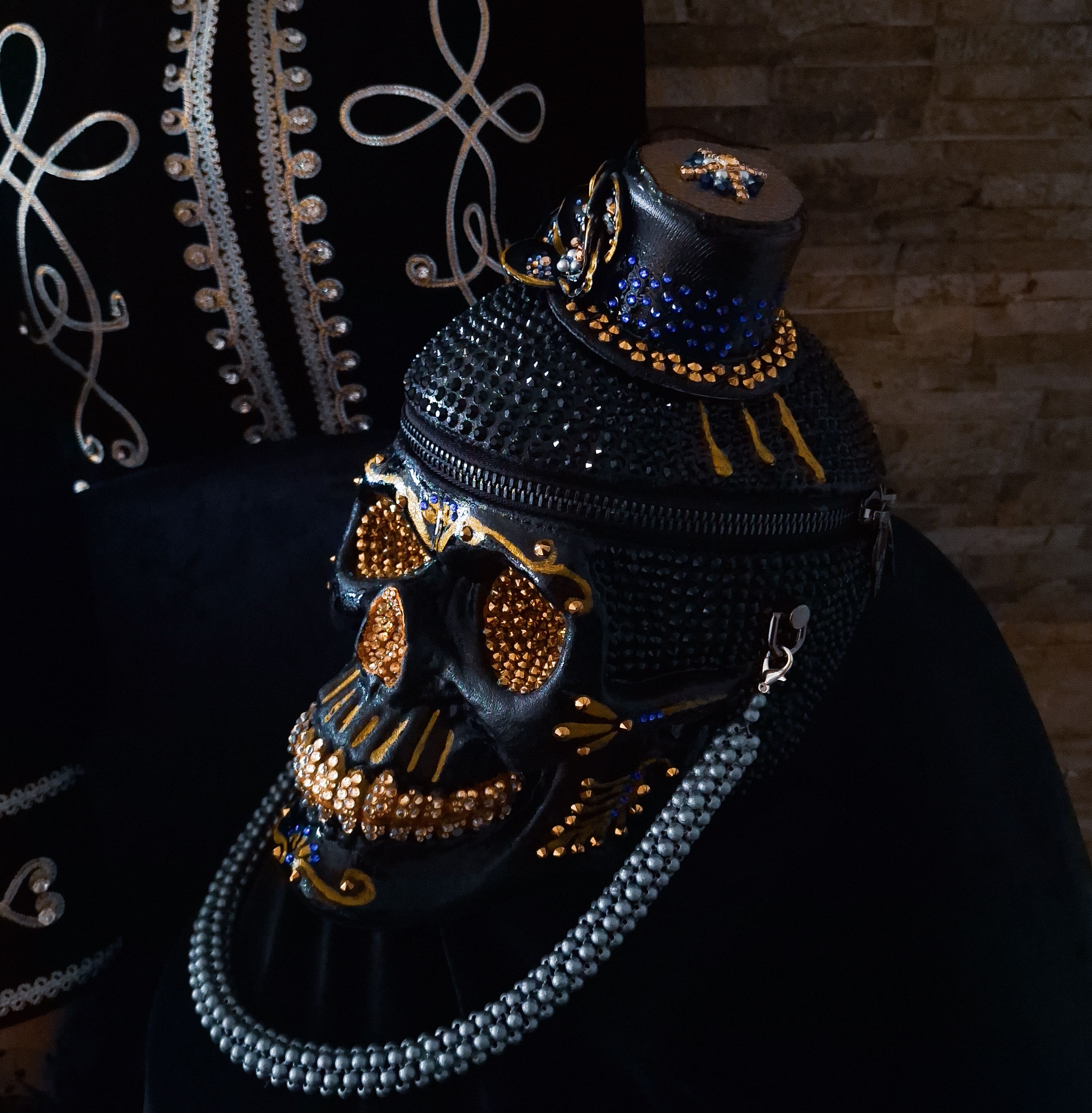 Череп, украшенный камнями и орнаментами, сияет словно бальный зал, отражая блеск свечей и роскошь веков. Но на его обратной стороне бисером вышита надпись memento mori — напоминание о том, что красота и жизнь мимолётны.