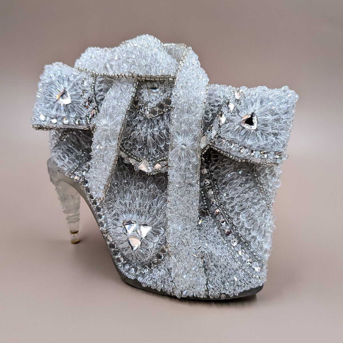 Сумочка «Хрустальный мираж» воплощает этот миг — когда мечта становится реальностью. Она объединяет образ потерянной туфельки Золушки и блеск венских залов. Её форма Венский бал: искусство вне эпох— игра иллюзий: то ли туфелька Золушки, то ли драгоценная скульптура, превращённая в изысканный аксессуар, каждый элемент которого напоминает о сиянии хрустальных люстр венских залов. Вышивка стеклянными бусинами и кристаллами в сочетании с элементами, созданными технологиями будущего, отражают свет множеством граней, как настоящий хрусталь, наполняют поверхность живым сиянием, превращая её в хрустальный мираж, где холодная прозрачность встречается с огненной искрой света.