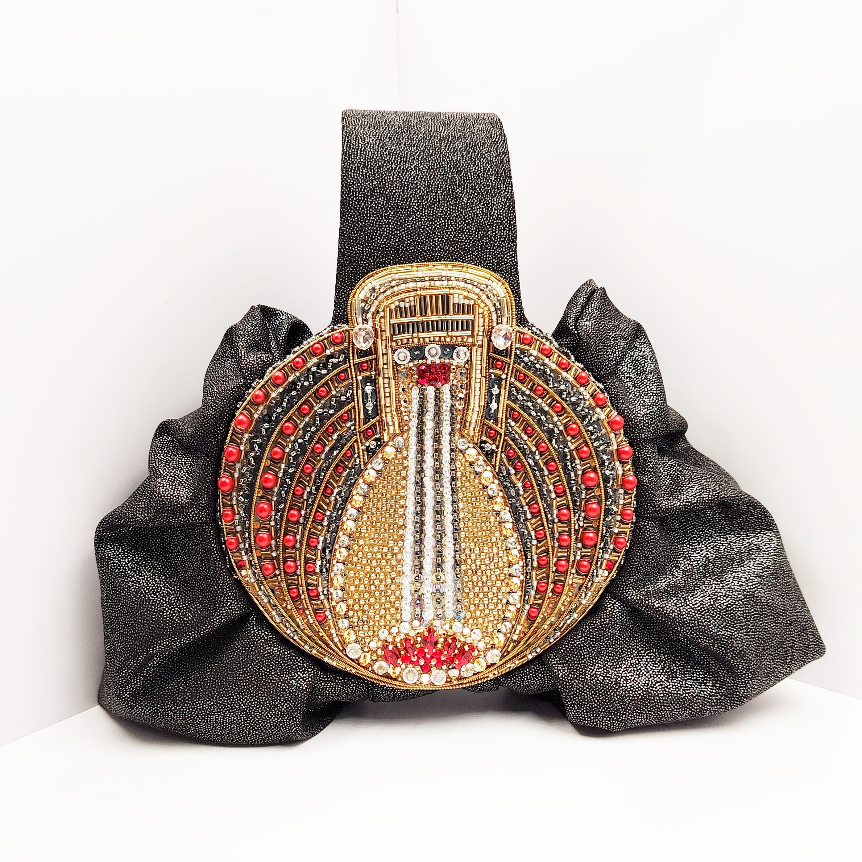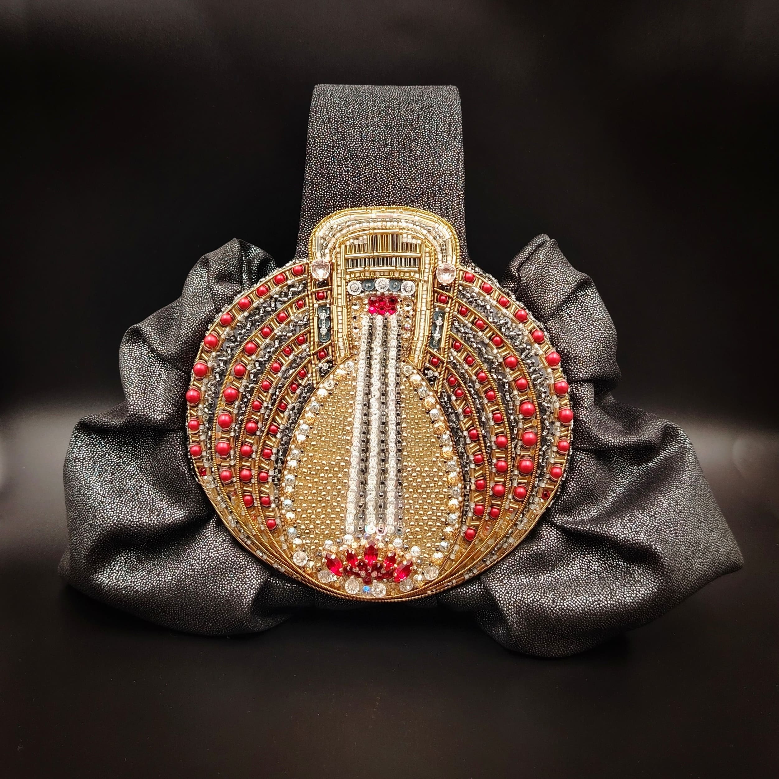 Сумочка выполнена из полиэстеровой ткани с добавлением вискозы и люрекса.