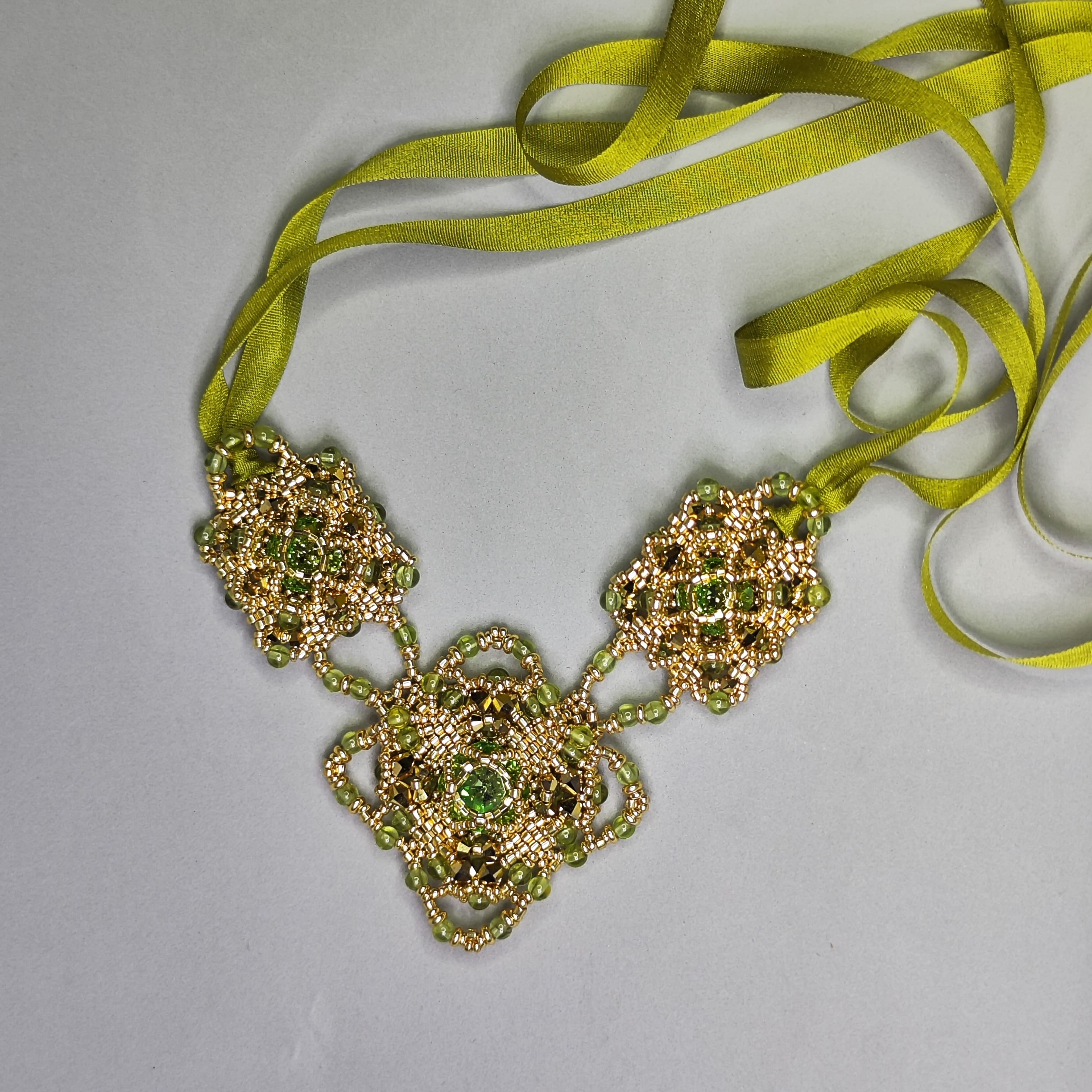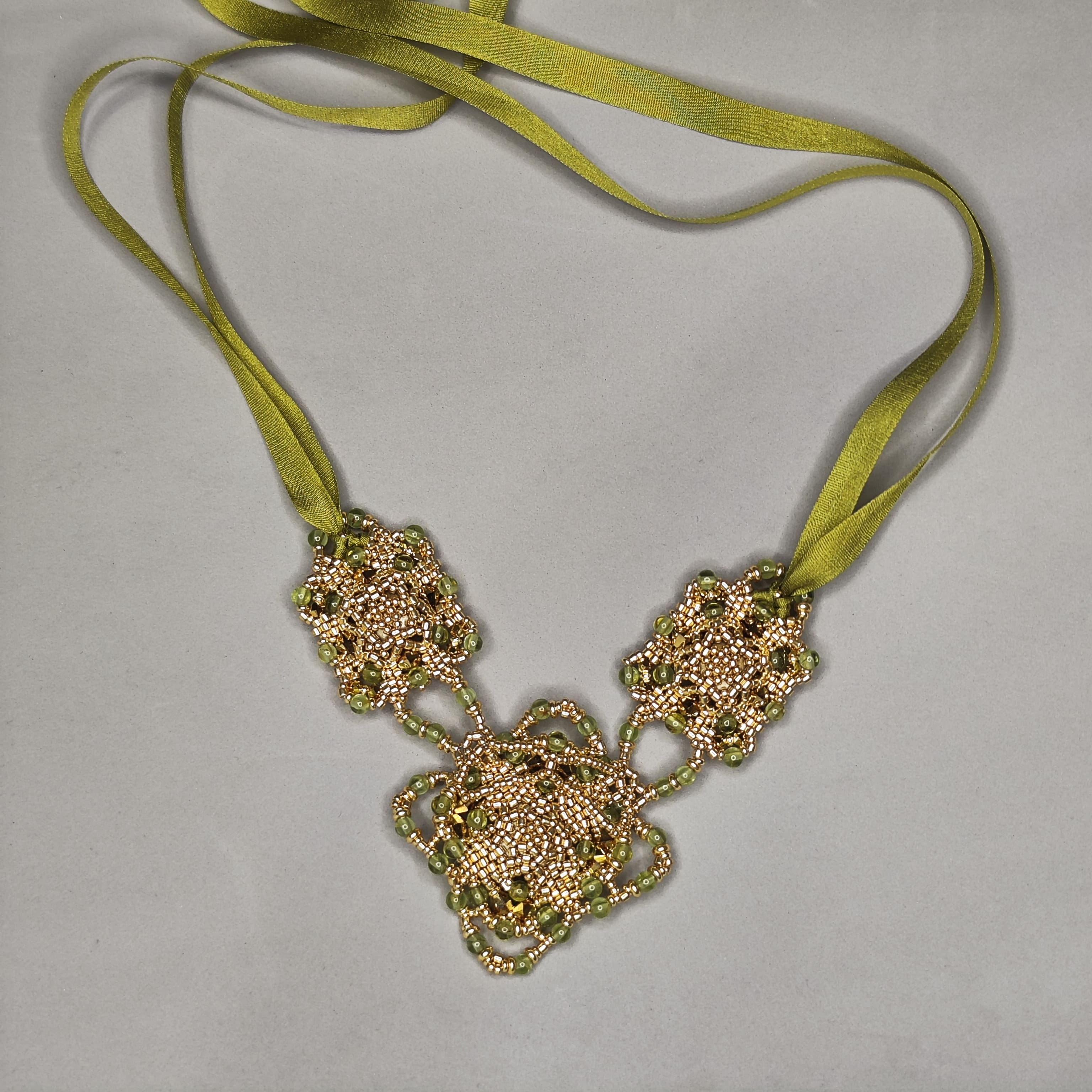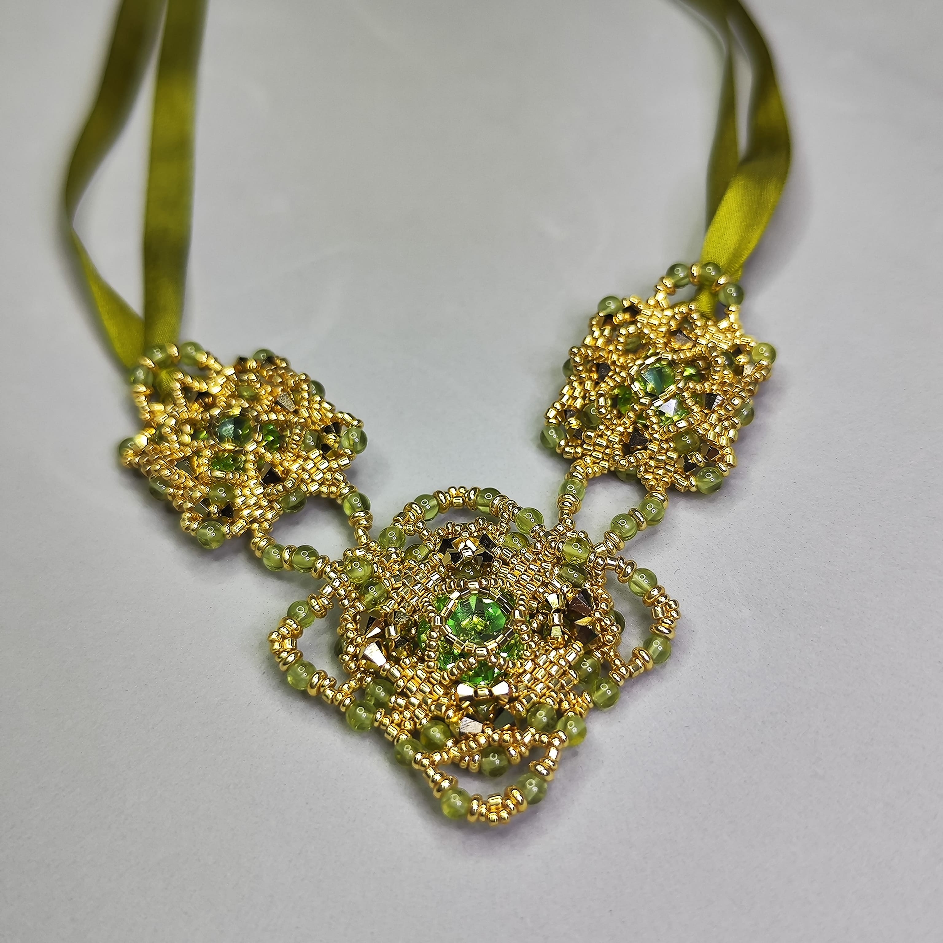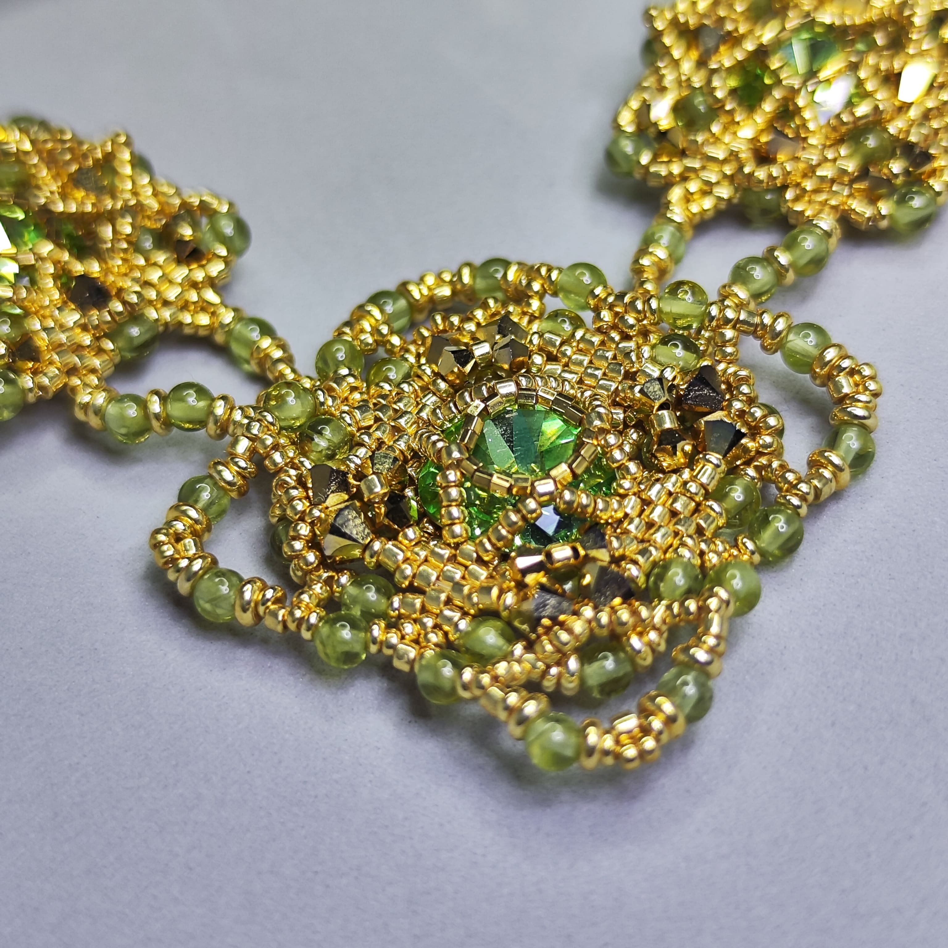 Не можешь идти к мечте - лежи в направлении мечты. Так ведь говорят? Но иногда стоит сделать три шага вбок и обернуться назад - взглянуть в отражение себя. Три зелёных кристалла "красивое, очень хочу и потом сделаю что-то" оказались рядом с золотом и вдруг сложились в идеальное маленькое колье - цвета моего выпускного платья. Вот бы тогда n-цать лет назад - и танцевать, в зелено-золотом, в дебютный вечер...